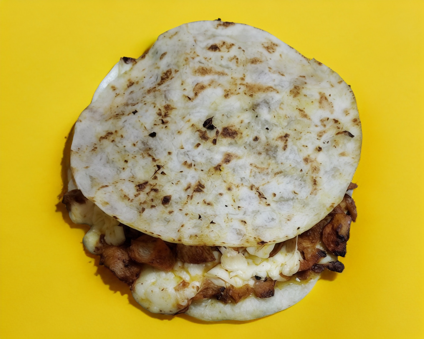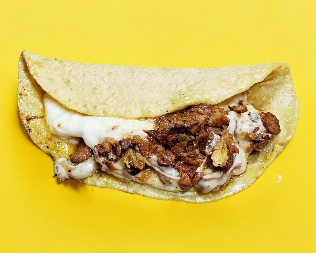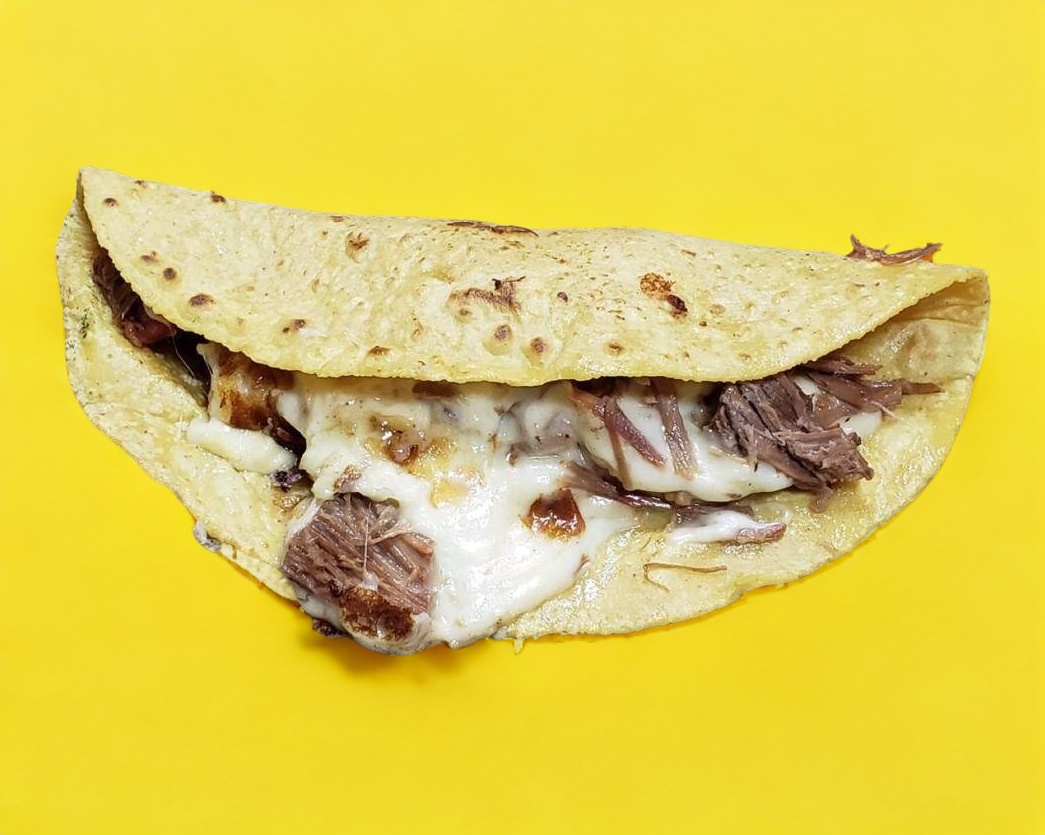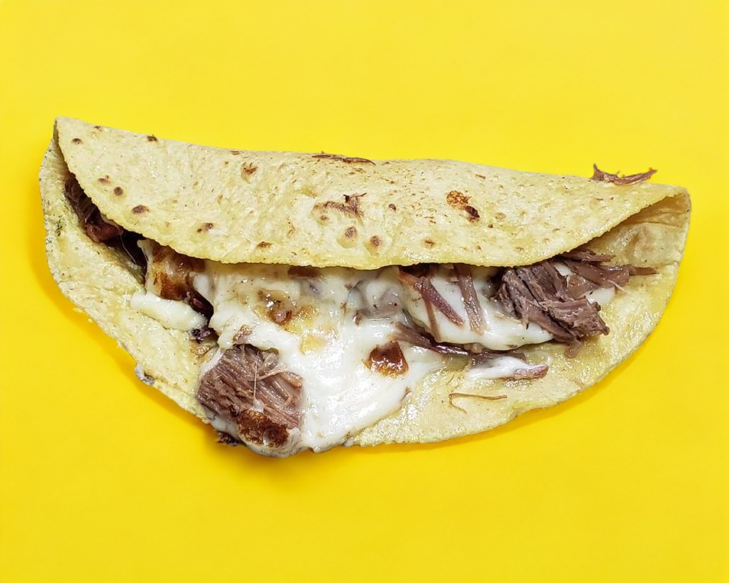 Tortilla de maíz con queso y carne.