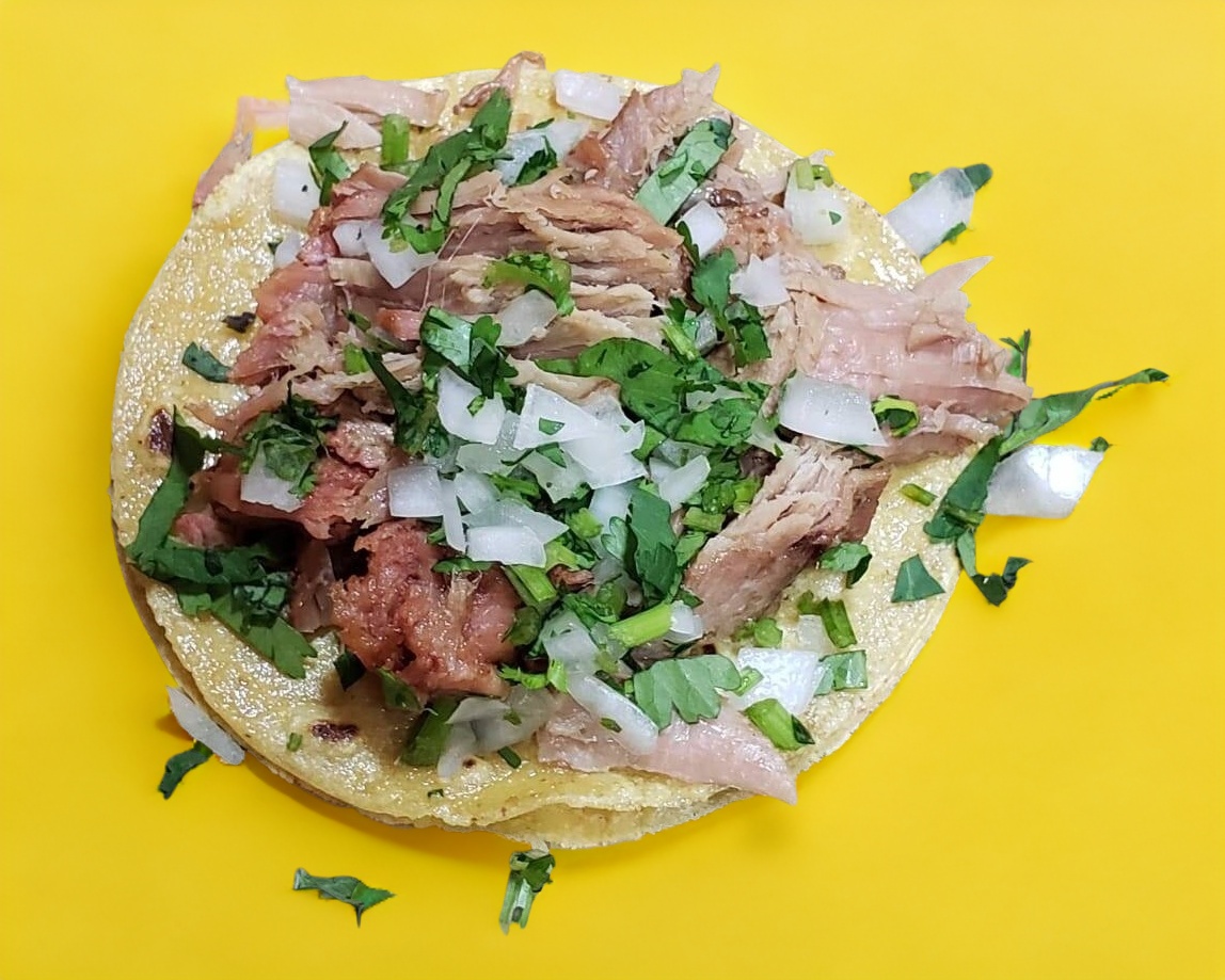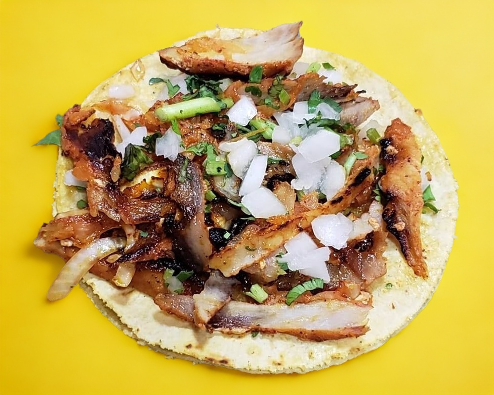 Taco de cabeza servido en tortilla de maíz.