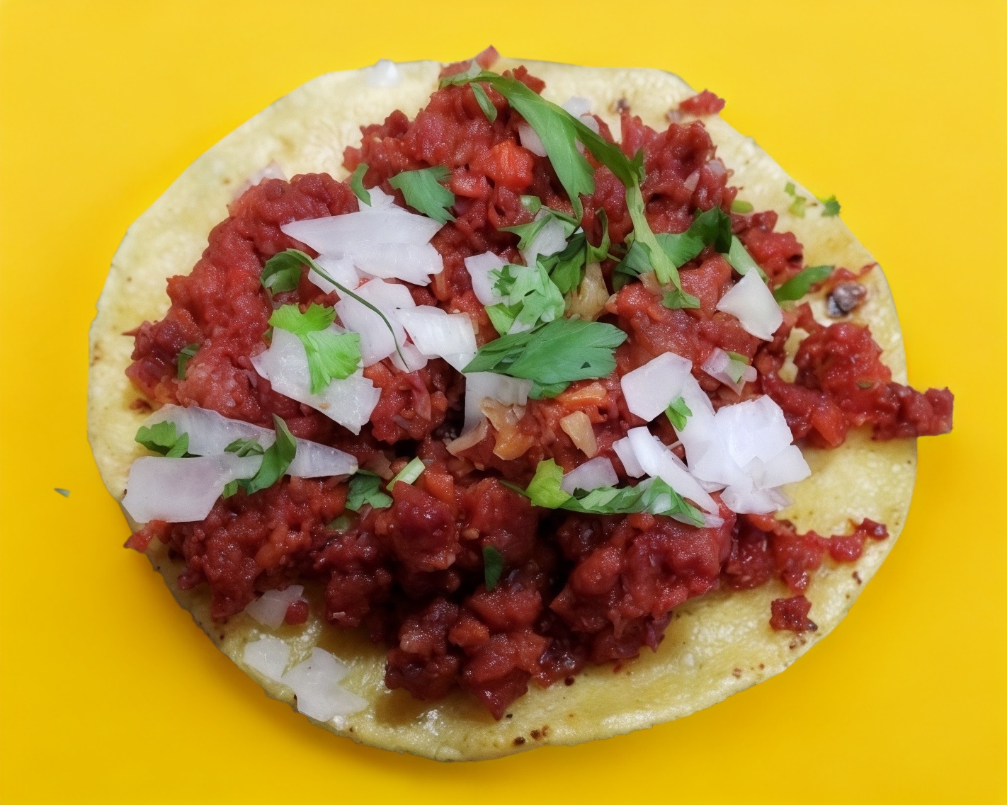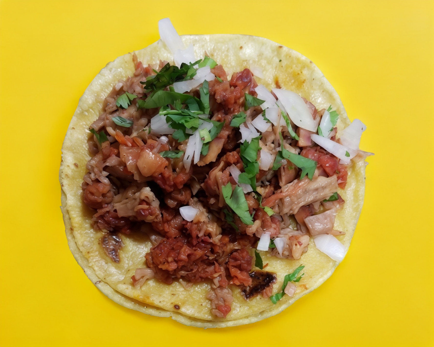 Taco de trozo de sudadero servido en tortilla de maíz.