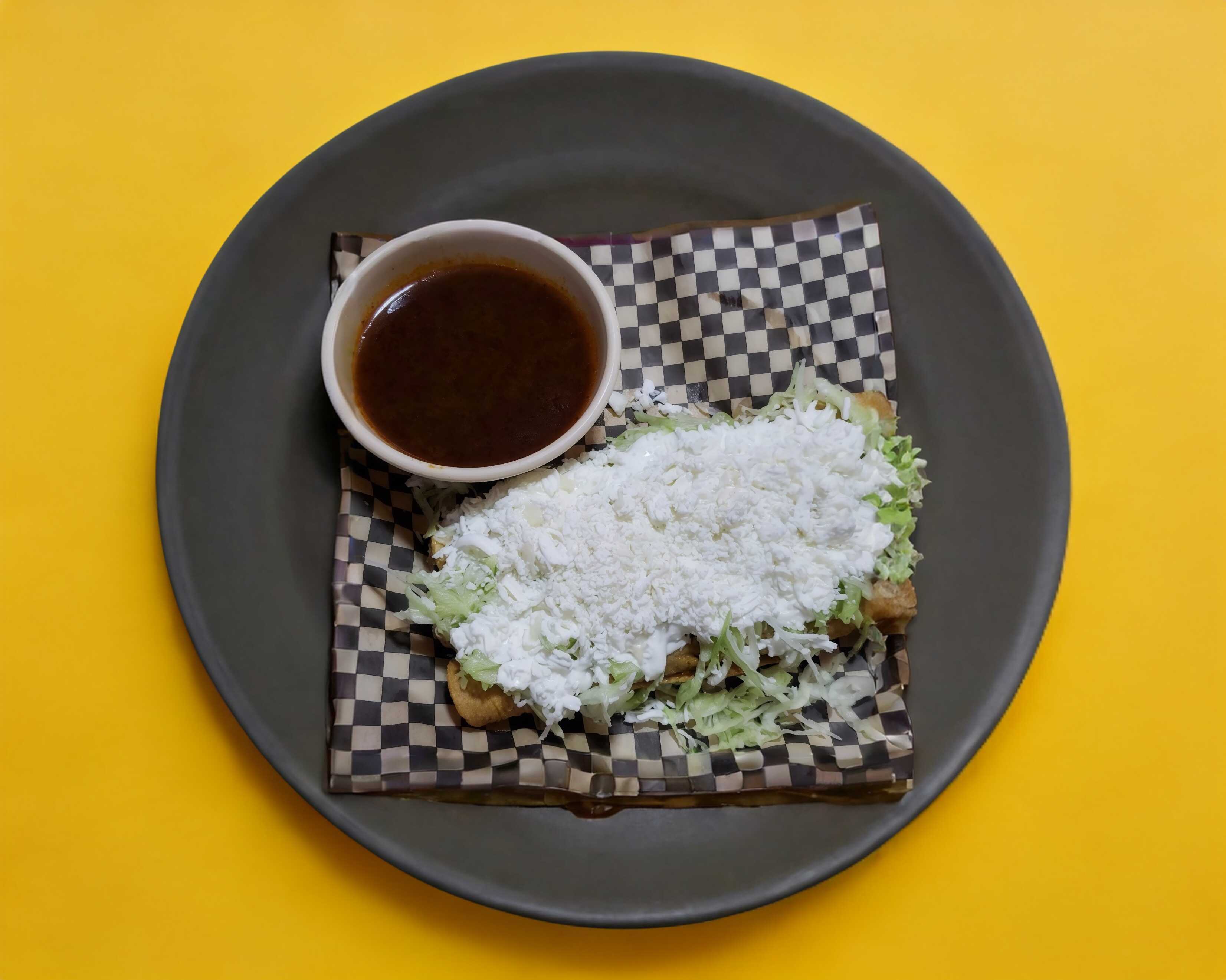 3 Flautas con 1 vaso de consomé, lechuga, crema y queso.