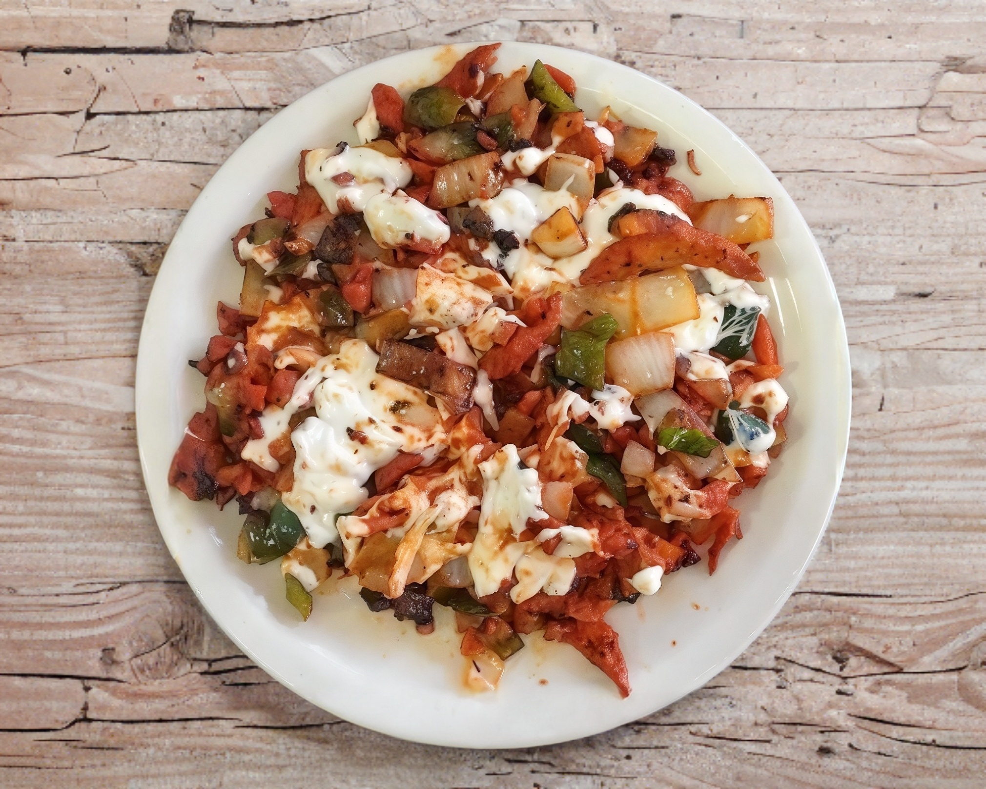 Cebolla,Poblano,Carne de pastor,queso oaxaca y aparte lleva salsa verde y roja , limones.