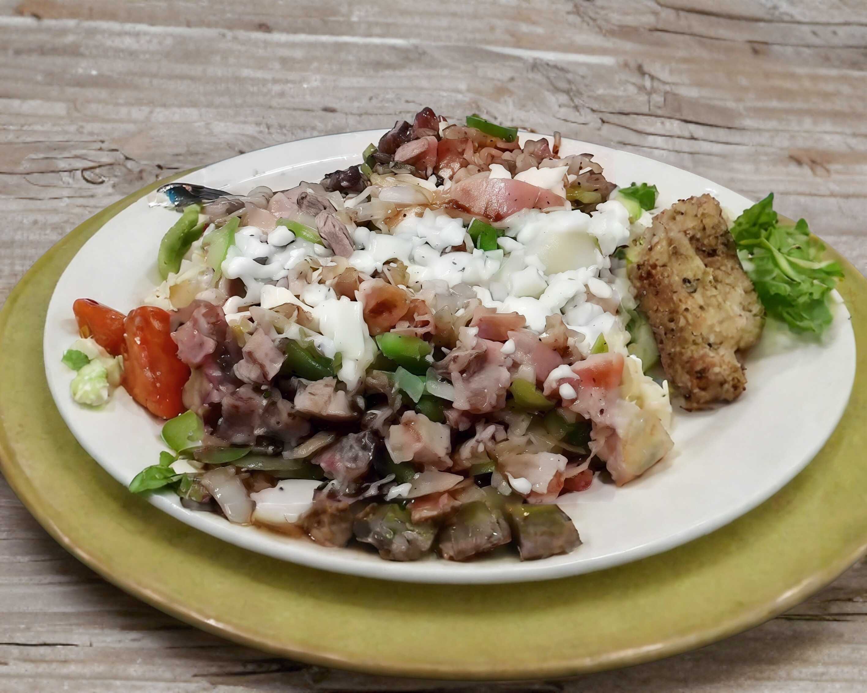 Cebolla ,poblano ,carne de res ( suadero),queso Oaxaca y aparte lleva salsas y limones y tortillas