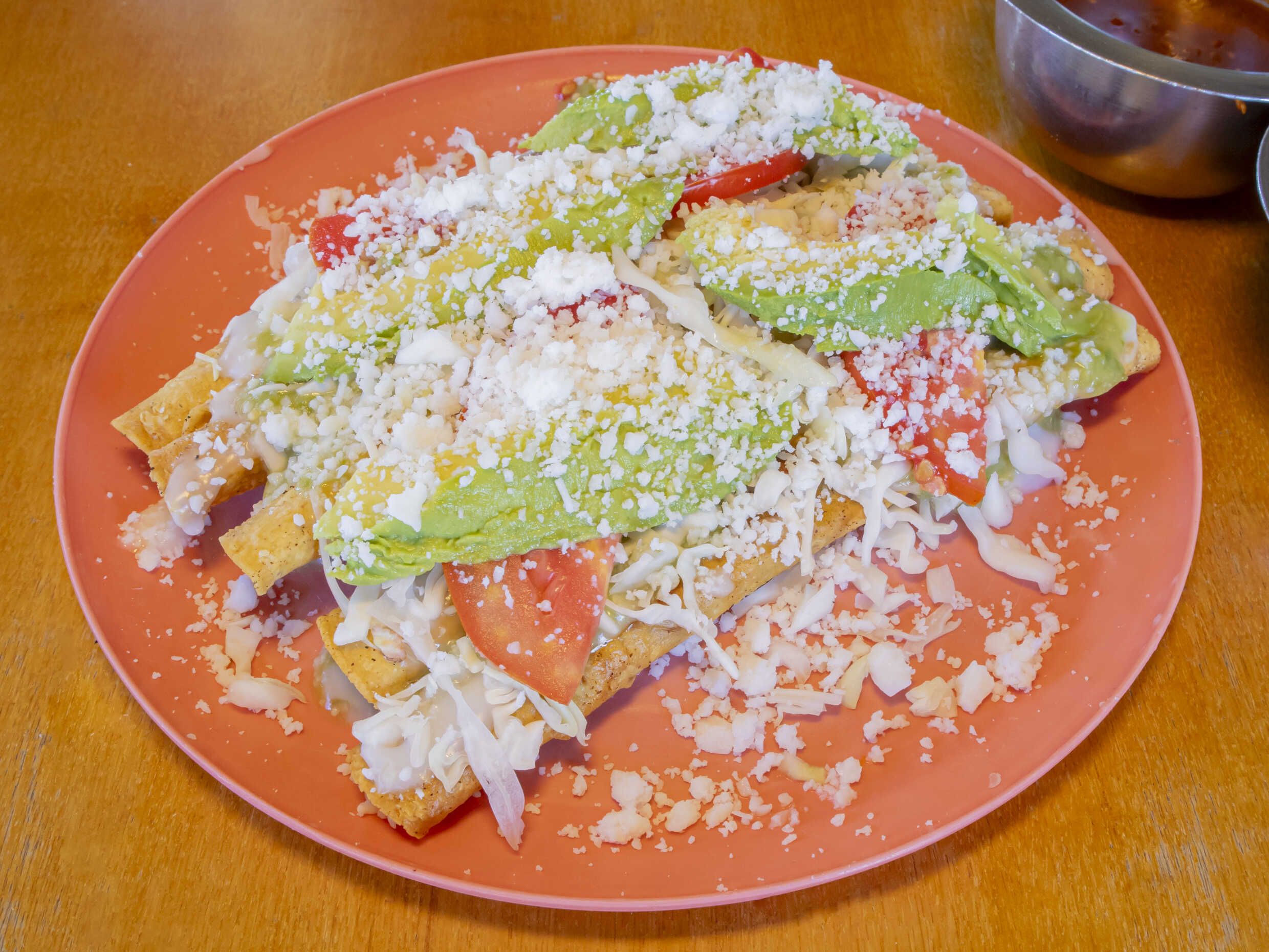 Orden De 5 flautas, rellenas carne de res, jitomate, col, aguacate y queso