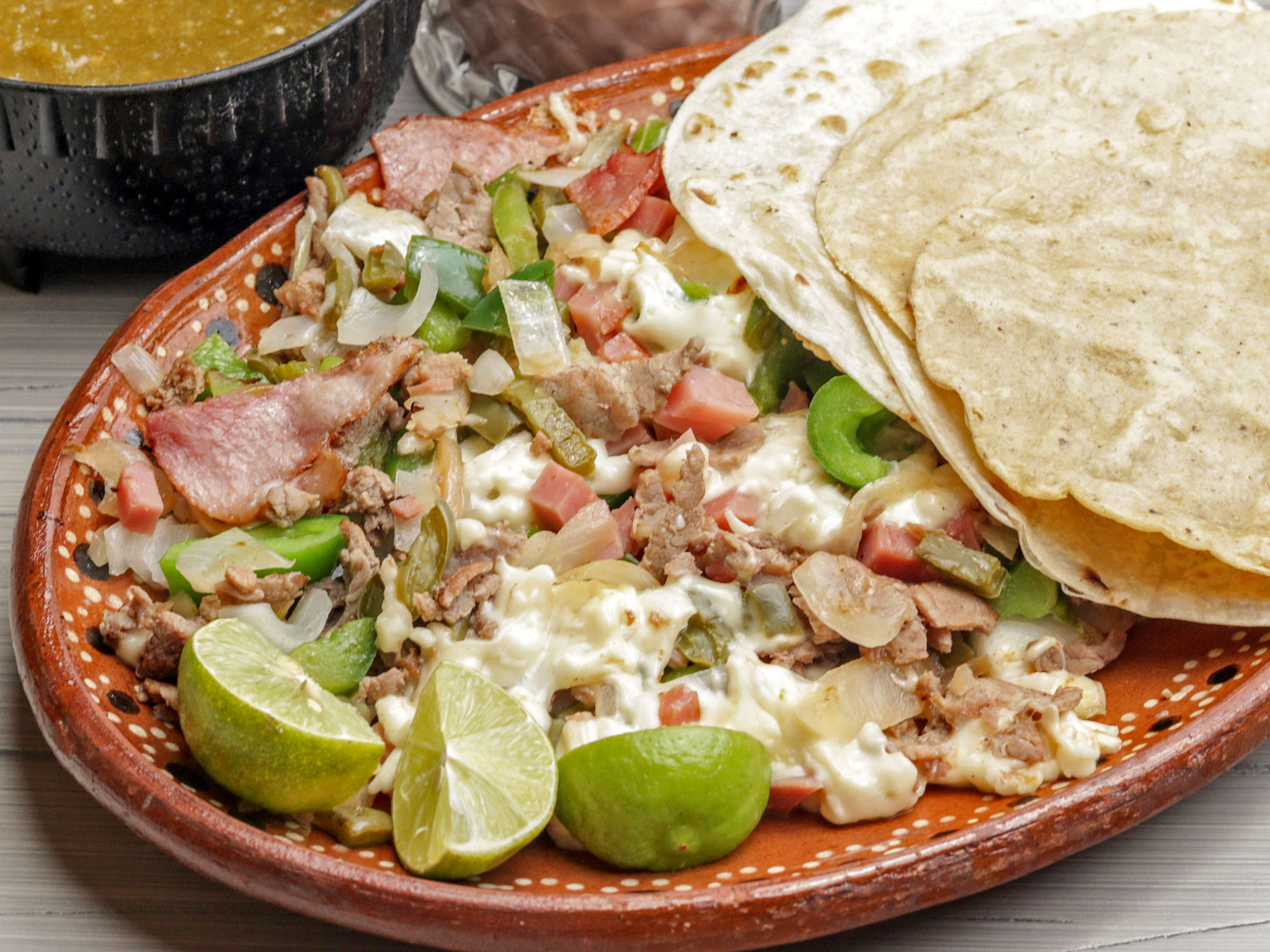 Bisteck, Tocino, Quesillo Y Tres Tortillas De Harina