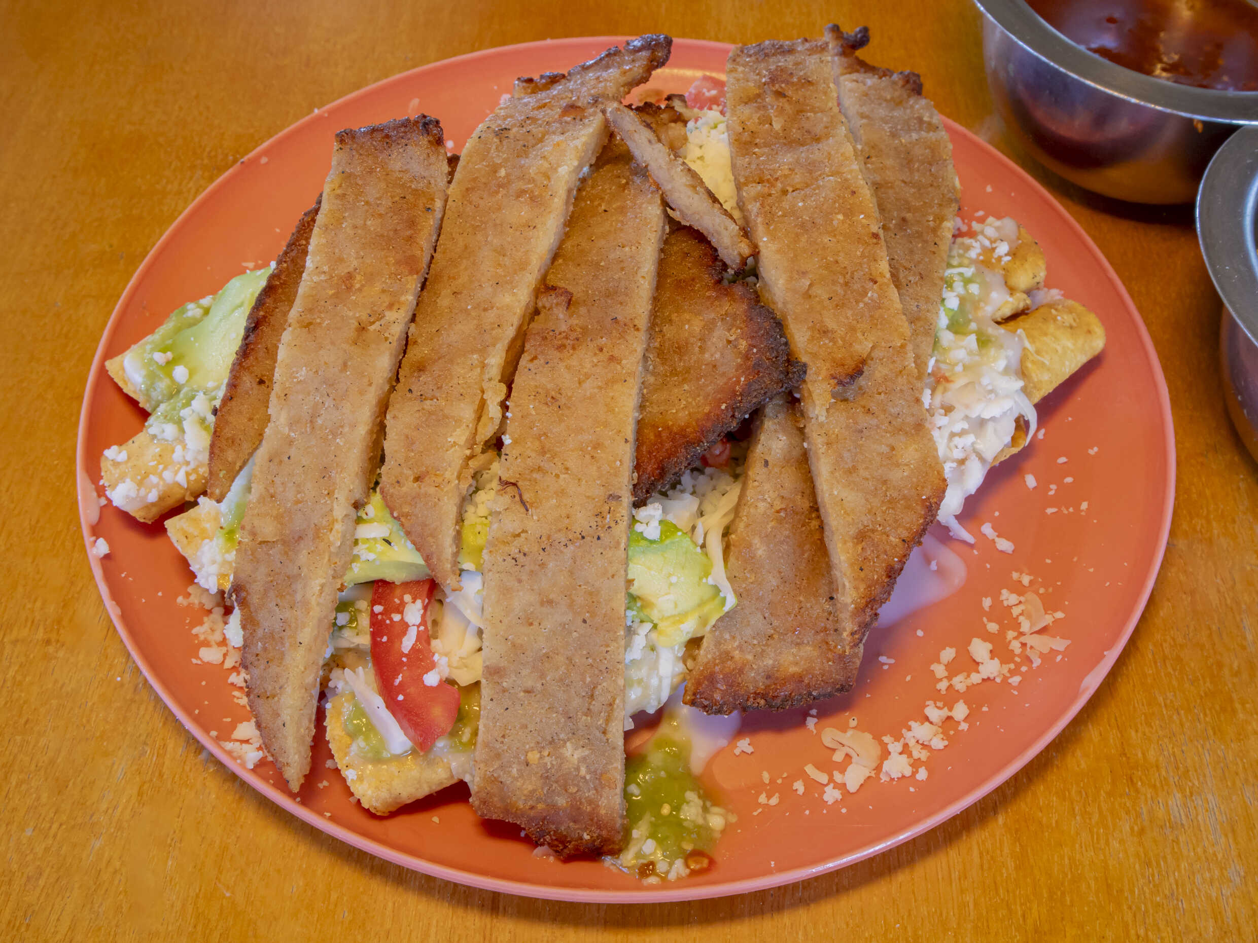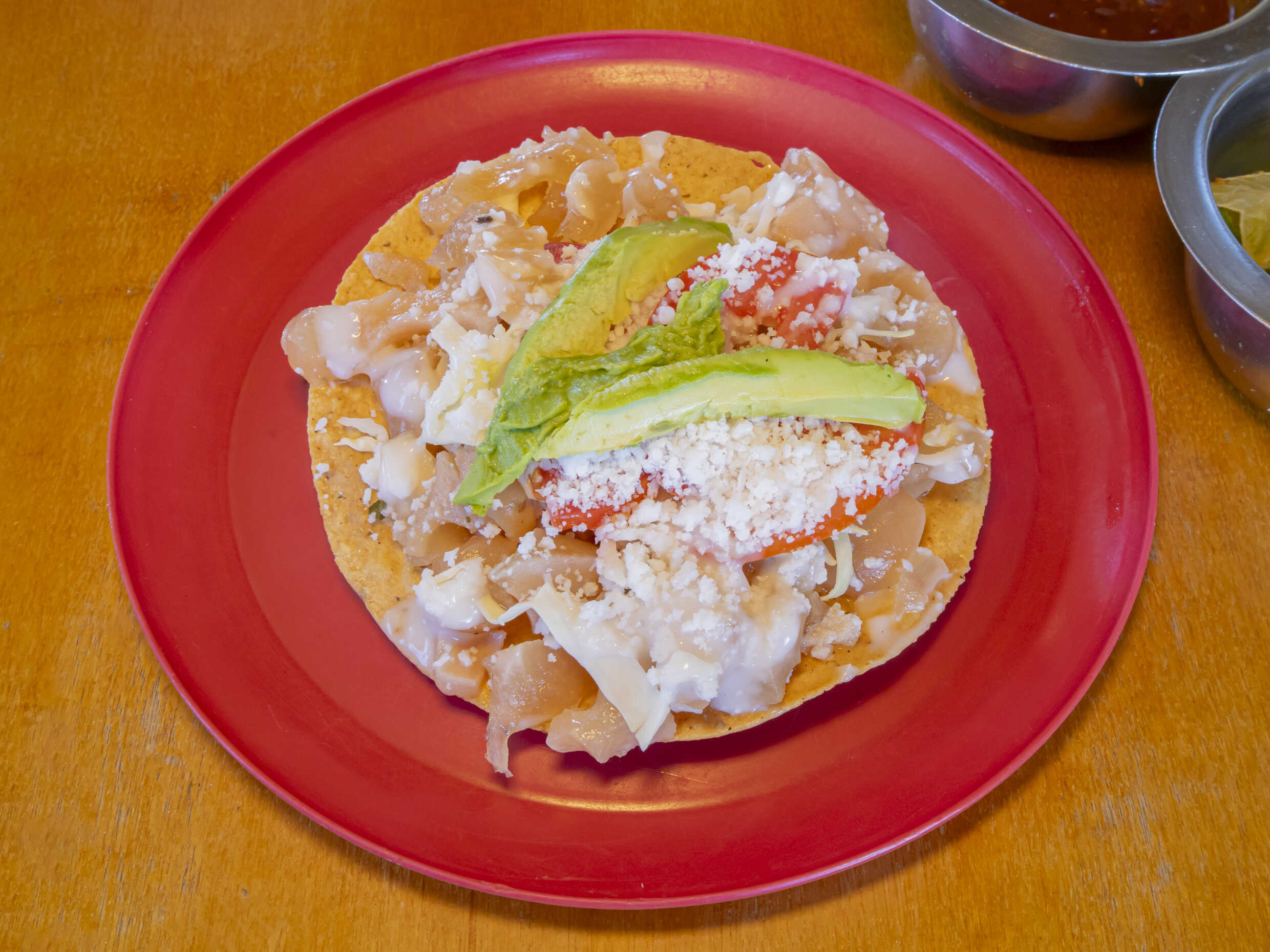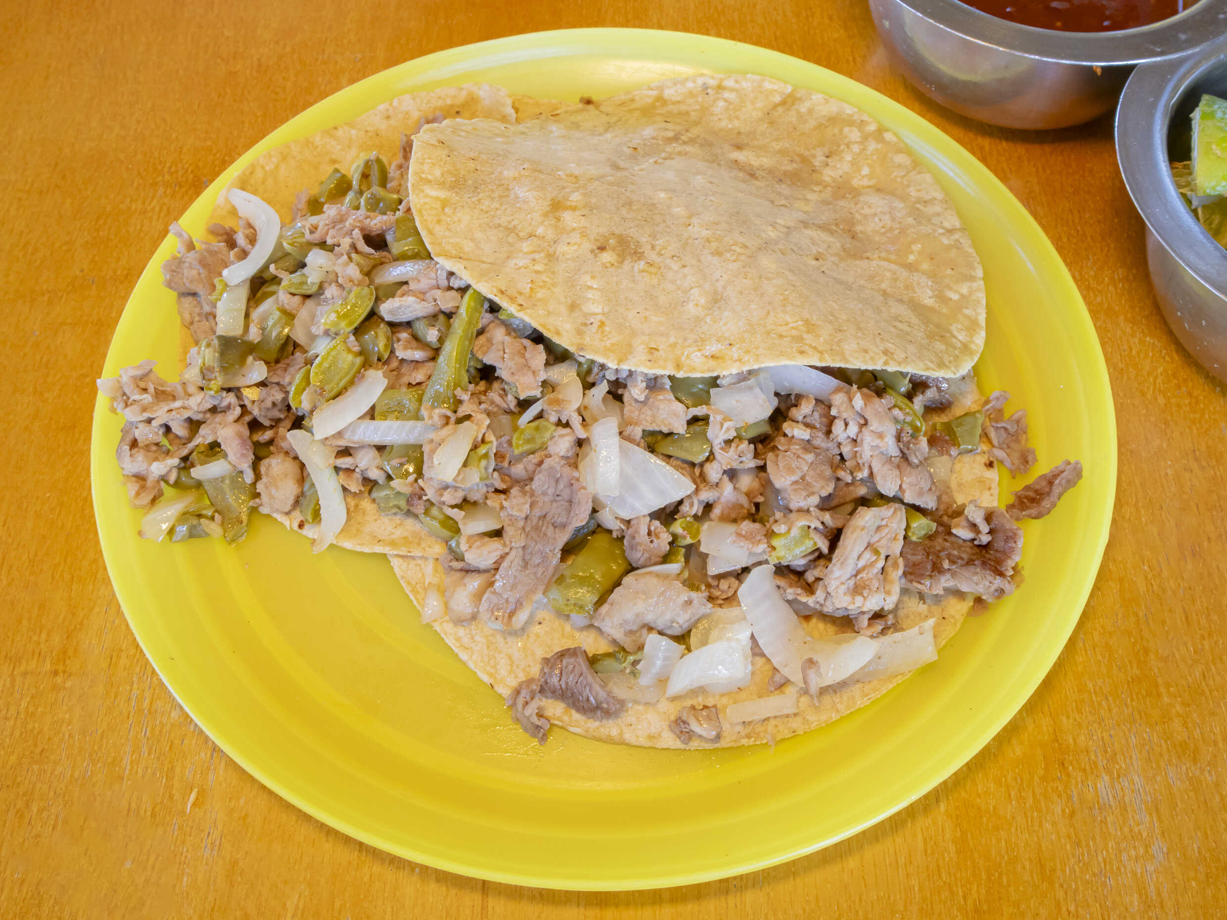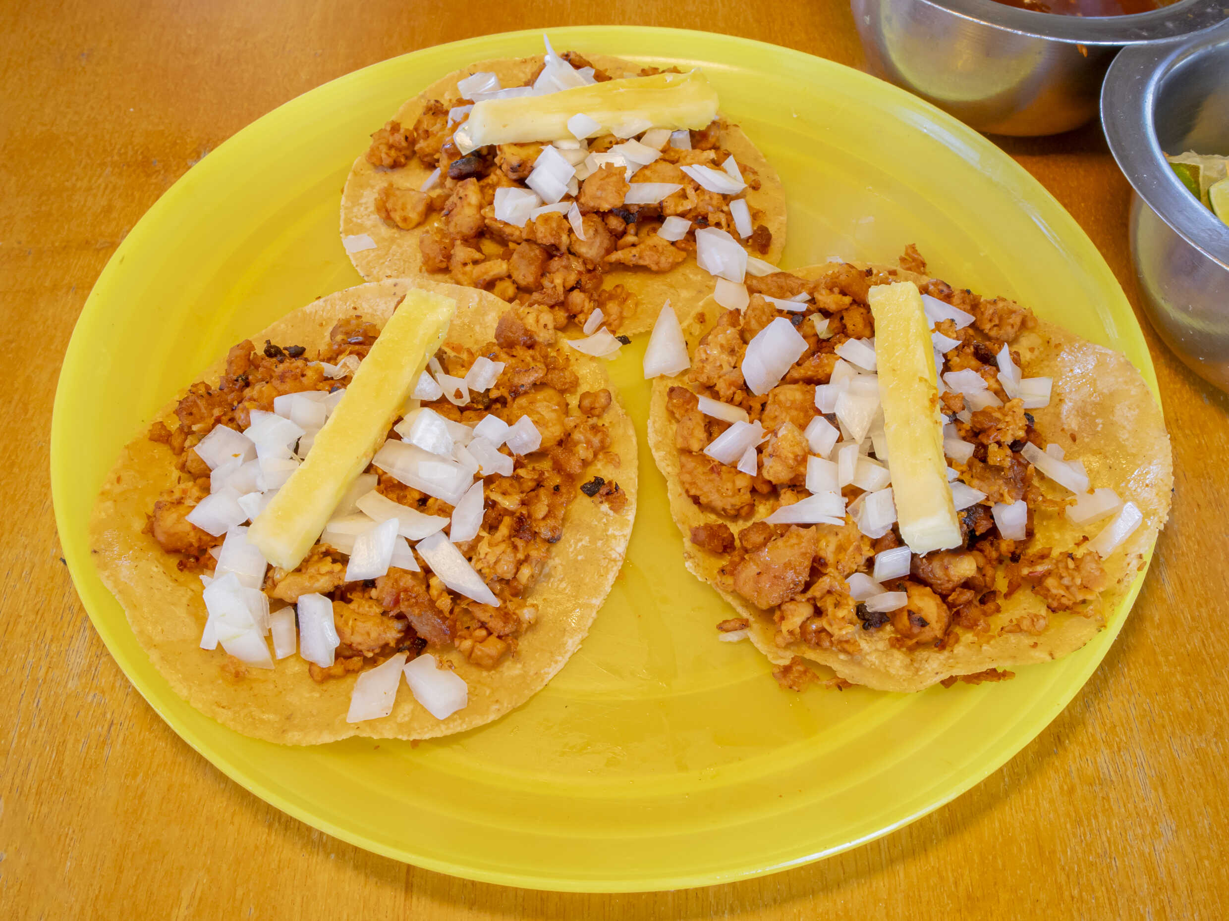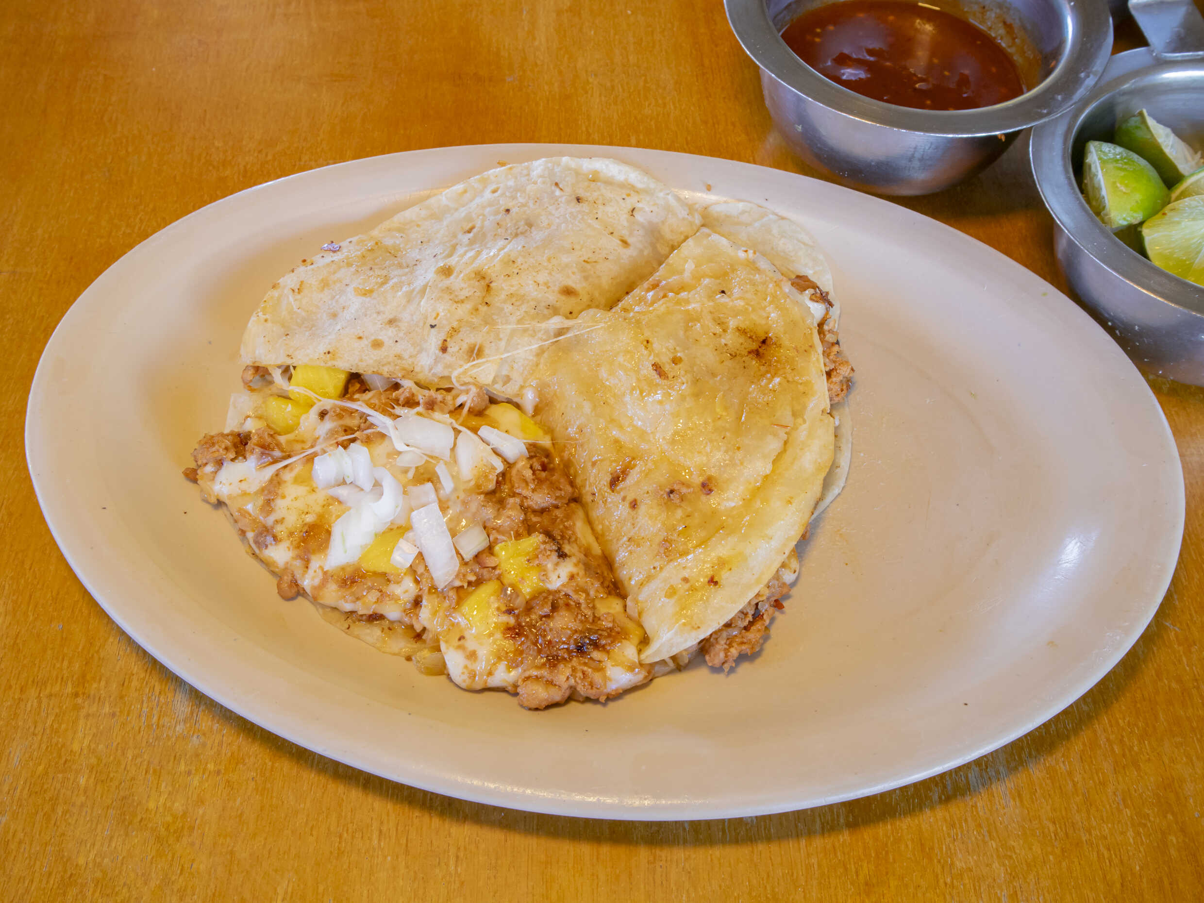 Tortilla Chica, acompañada de cebolla, piña, limón y salsa
