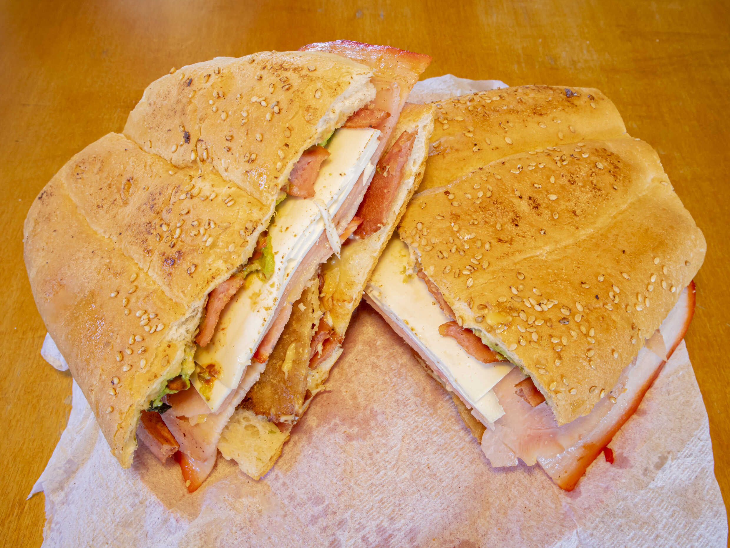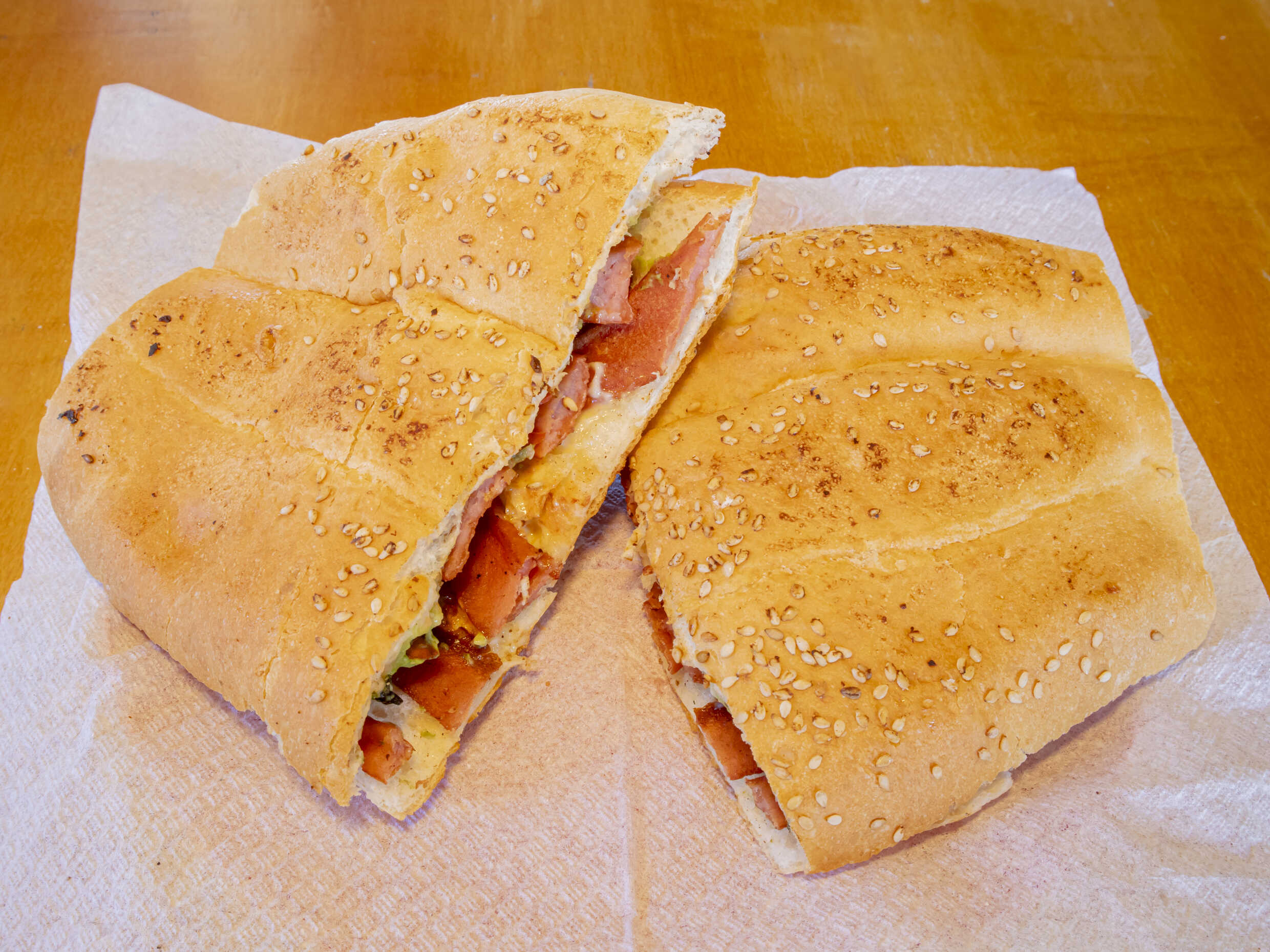 Torta dividida en dos con milanesa de cerdo 70 g aproximadamente, quesillo, salchicha,jitomate, aguacate, picante a gusto.