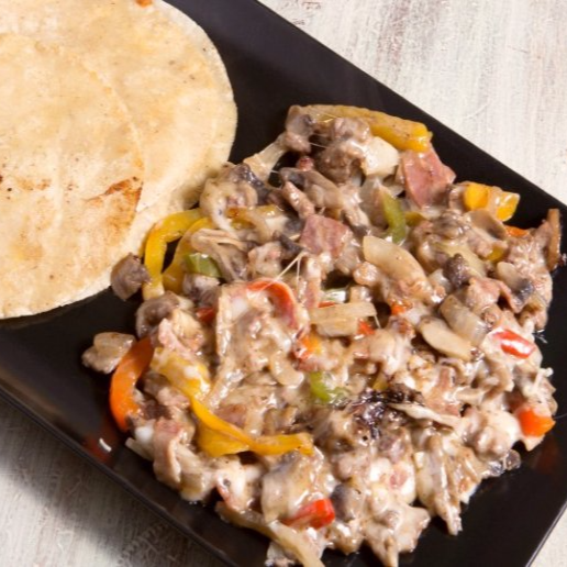Tortilla burrera con Arrachera, longaniza, tocino, cebolla, morrón y queso.
