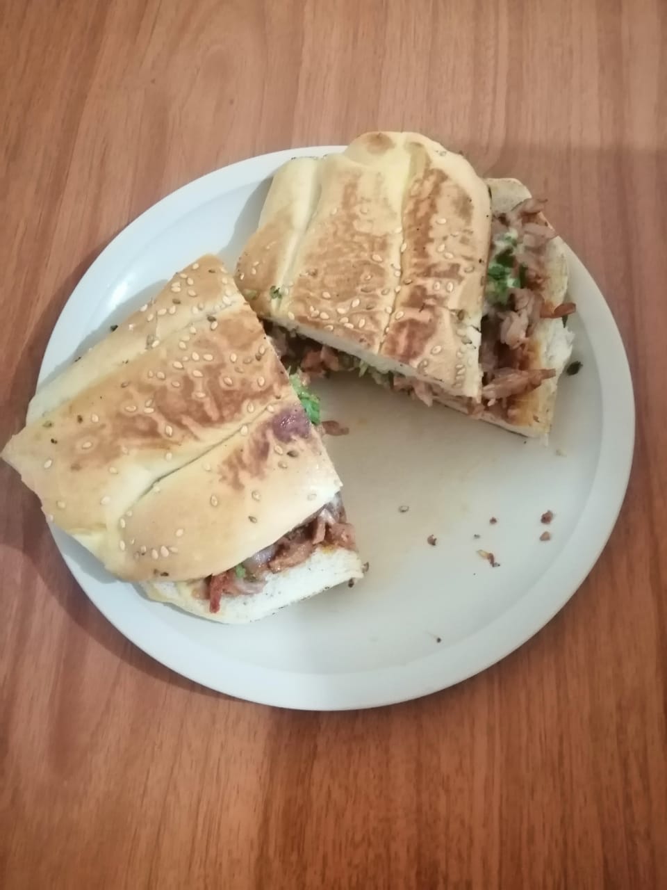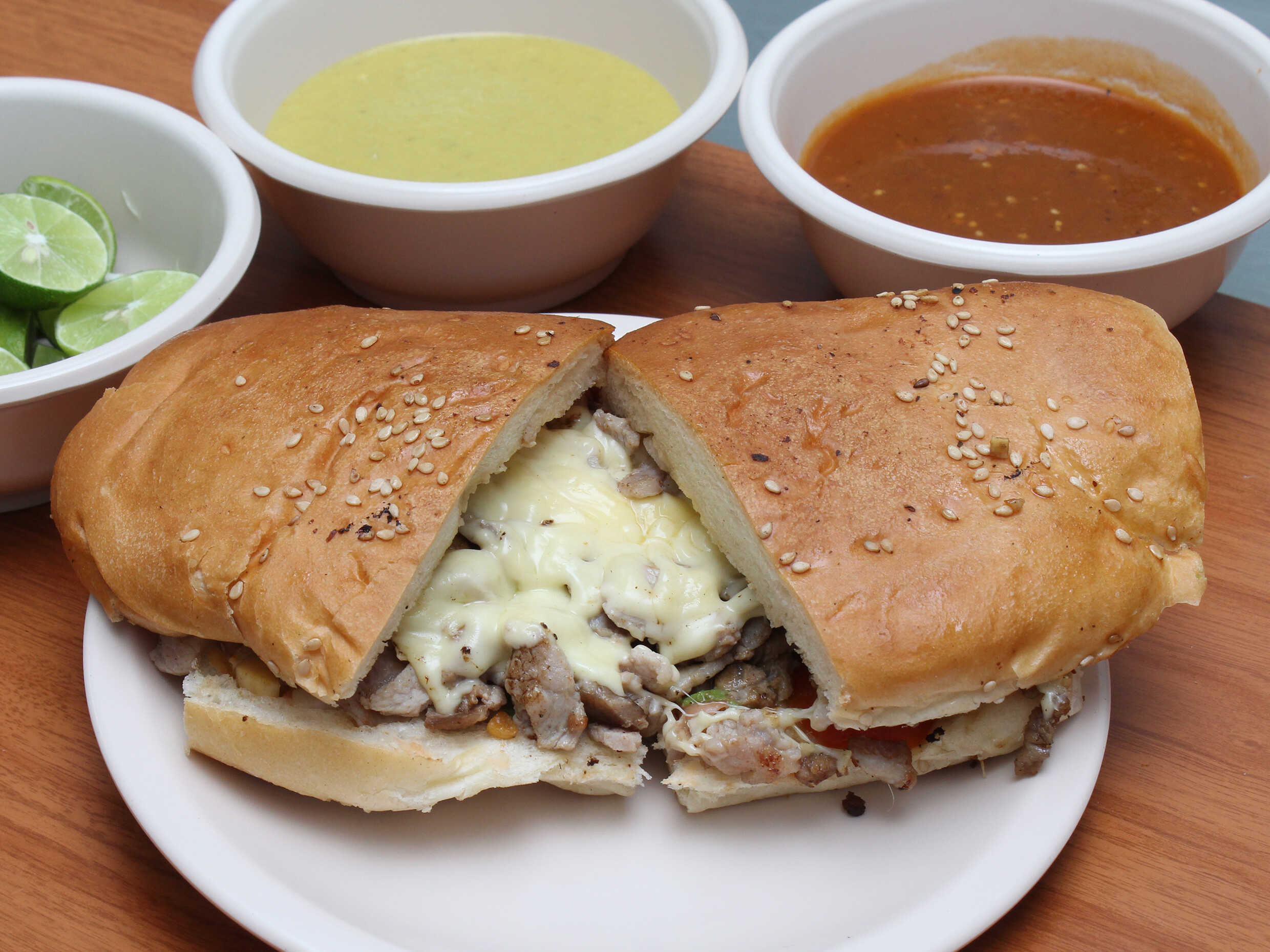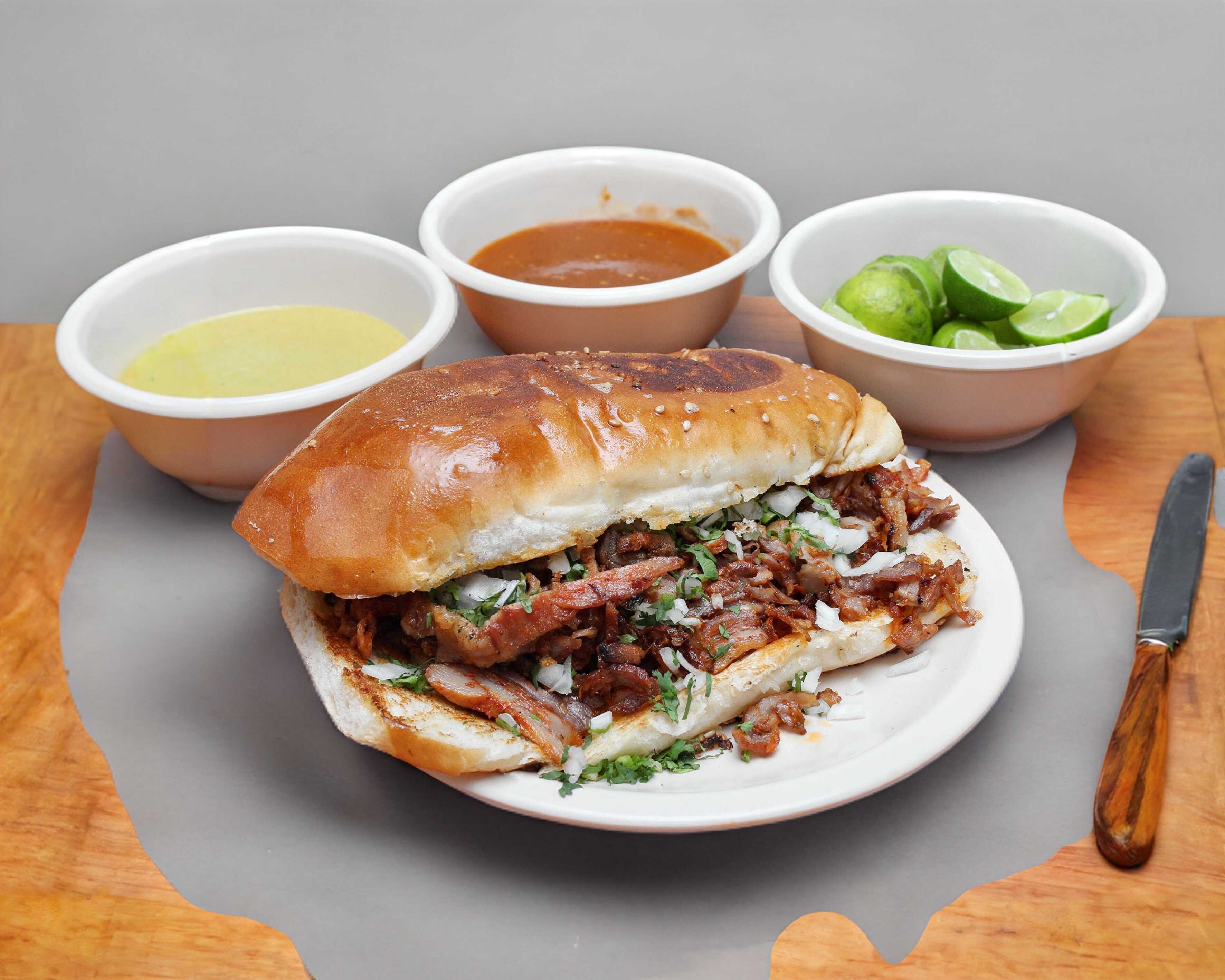 Disfruta de una deliciosa torta al pastor con telera de 20 cm con 100 gr de pastor aproximadamente con cebolla, cilantro y piña, salsa roja ó verde segun disponibilidad y limón