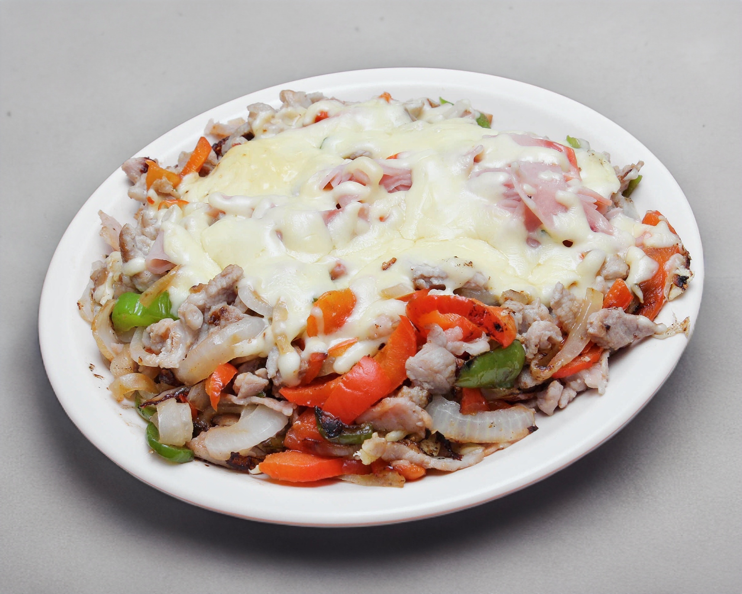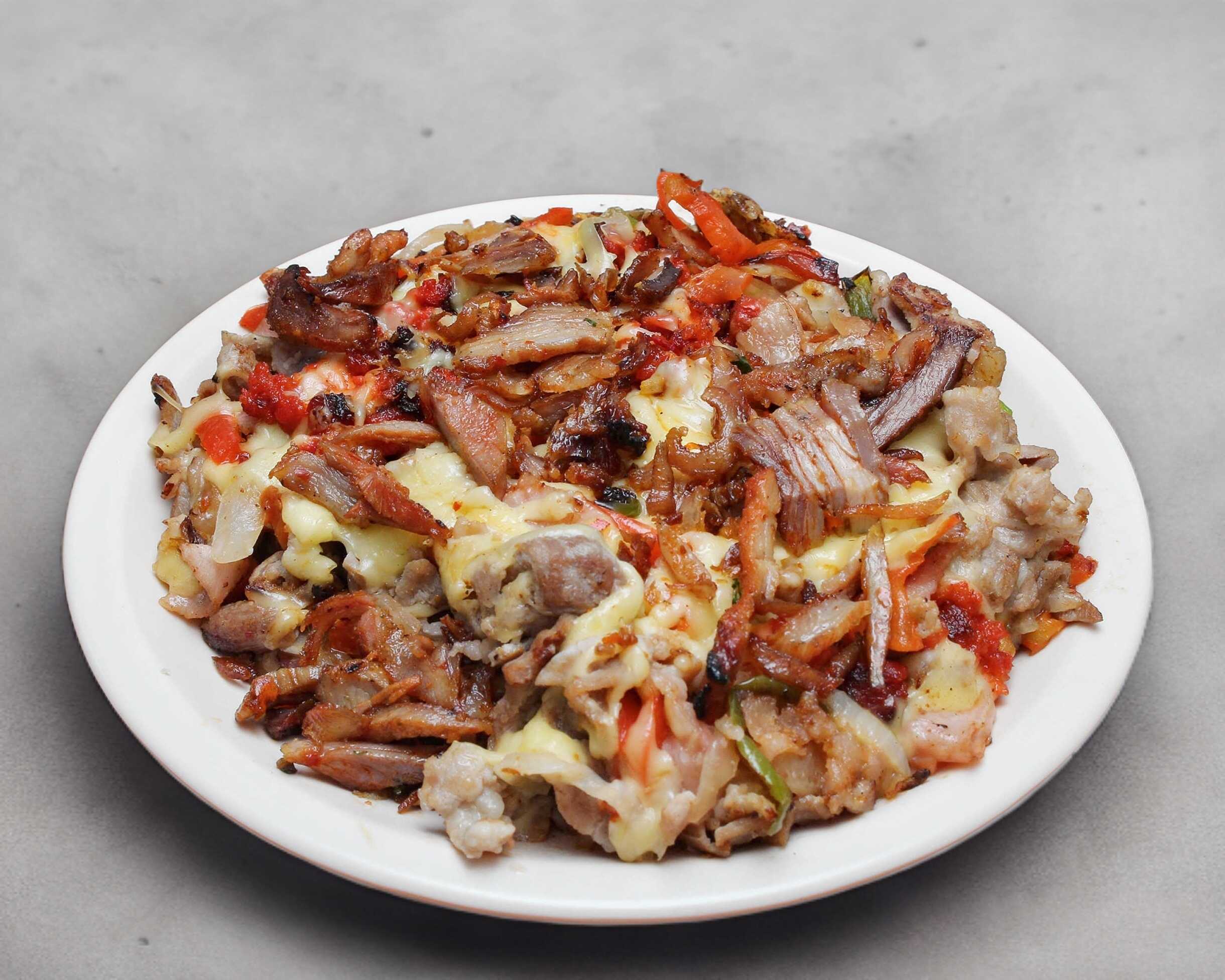 Bisteck, chuleta, tocino, cebolla, morrón y queso.