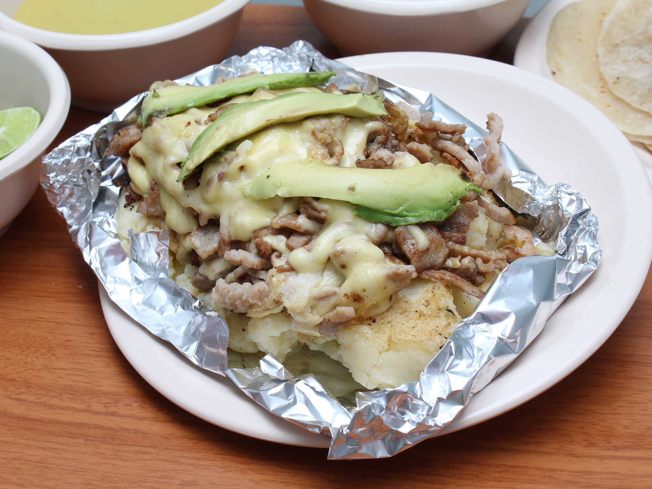 Papa rellena de queso con al pastor.