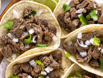 Delicioso bistec servido en 2 tortillas de maíz, encima cebolla y cilantro.