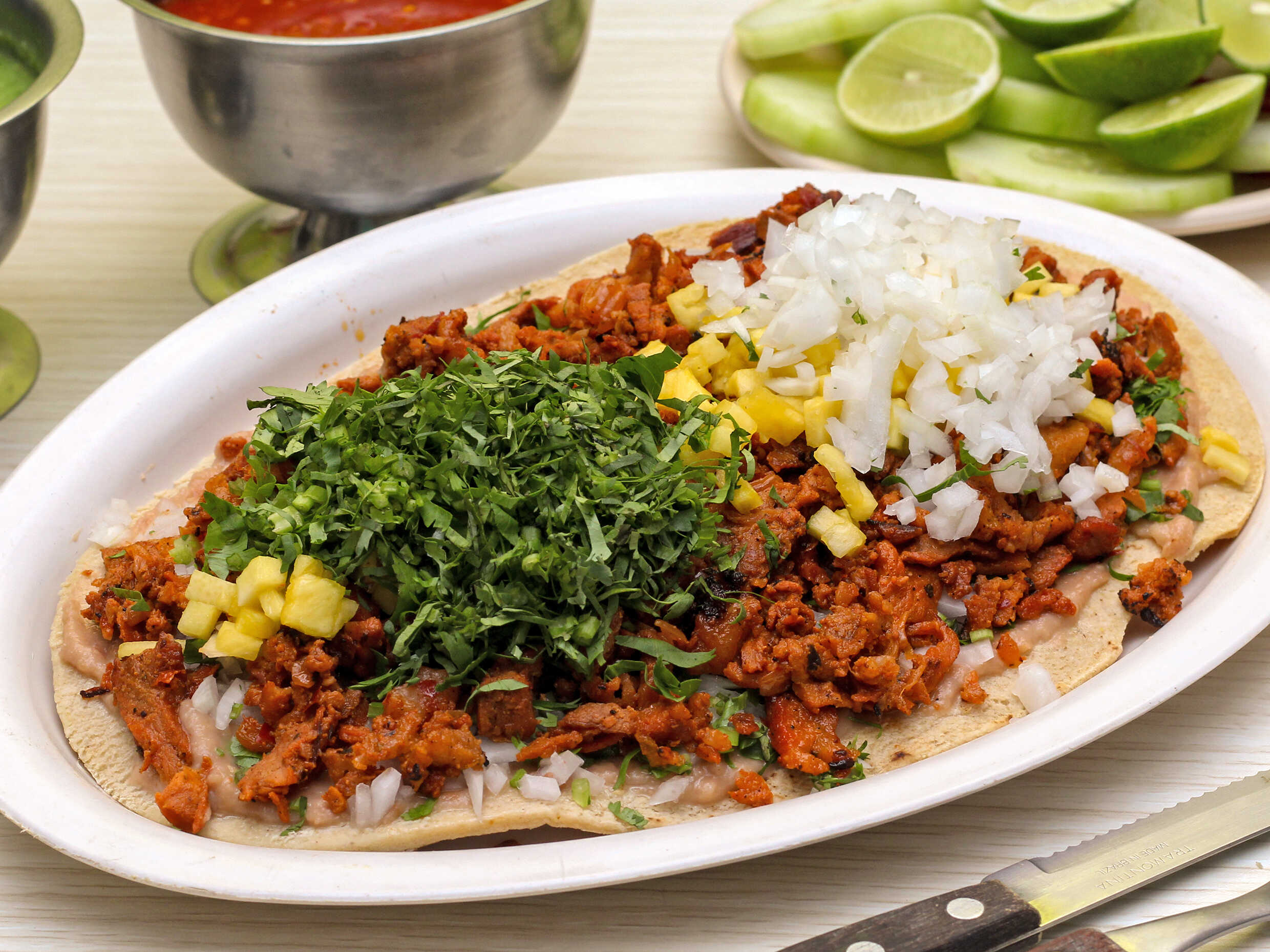 Huarache de masa, encima frijoles, acompañado con la carne de su elección , delicioso queso gouda, cebolla y cilantro.