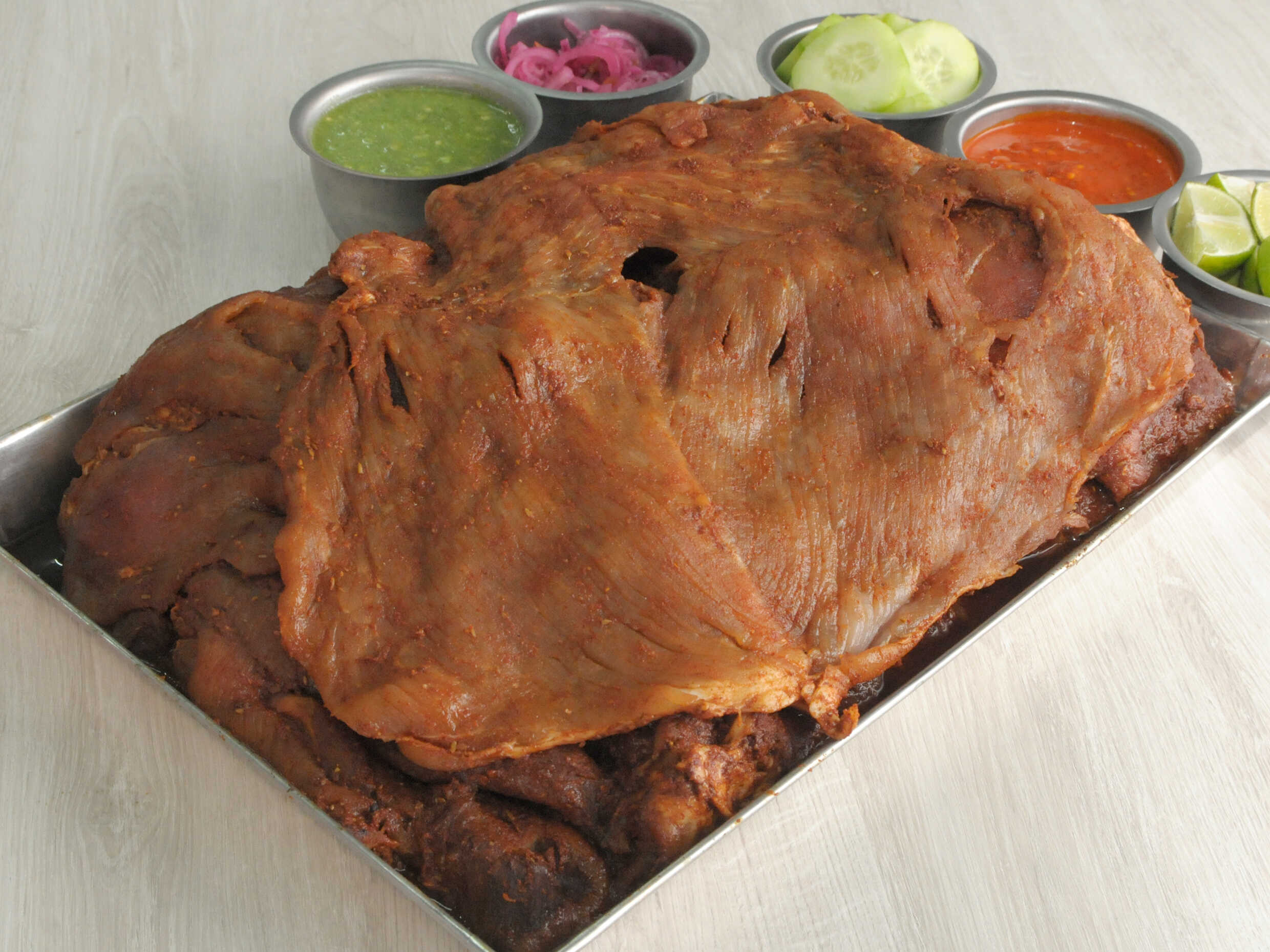 Disfruta de 1 kilo de jugosa cecina de res acompañado de una charola con papas, nopales y cebollas asadas, además de sus complementos para un sabor inigualable. *No incluye tortillas.*