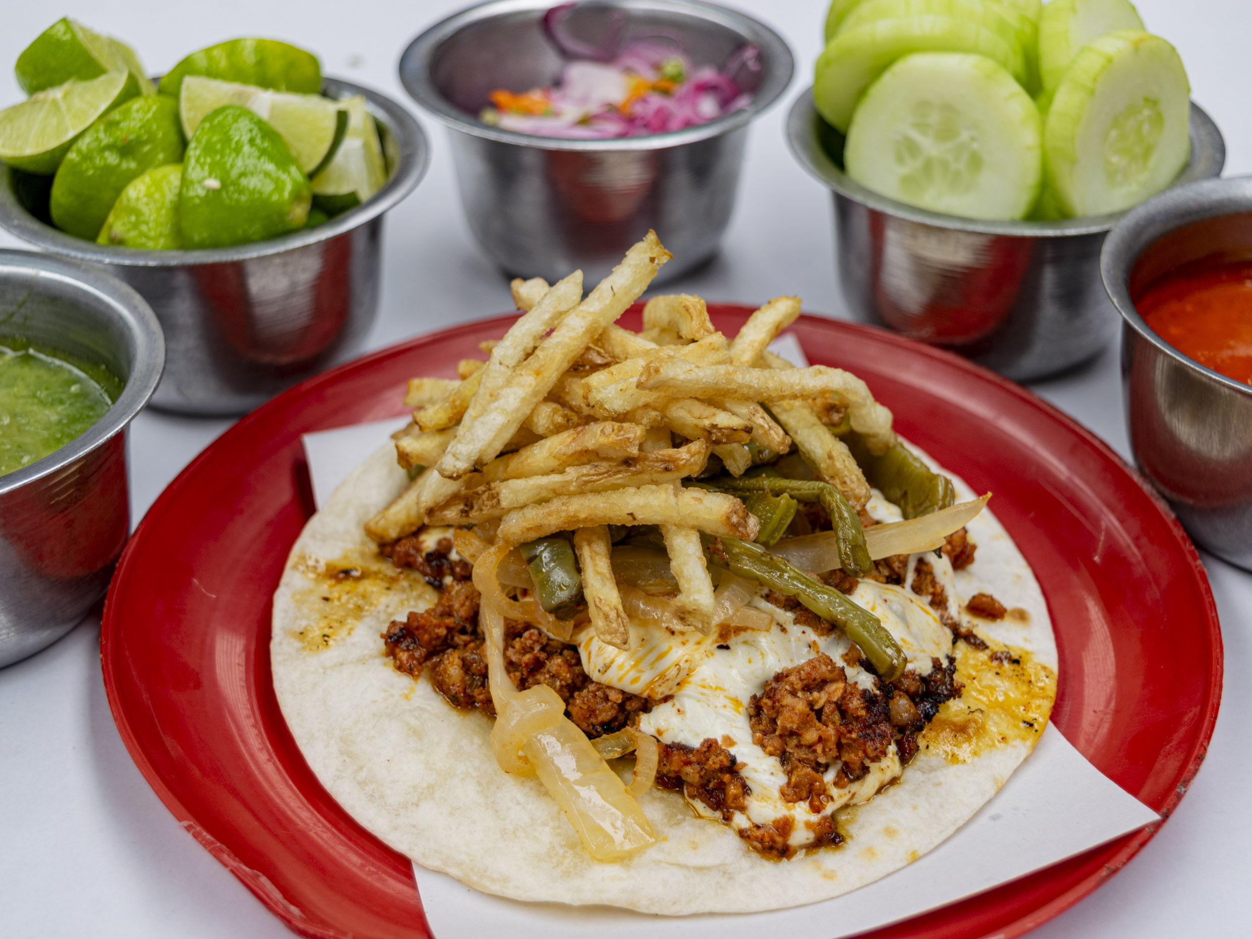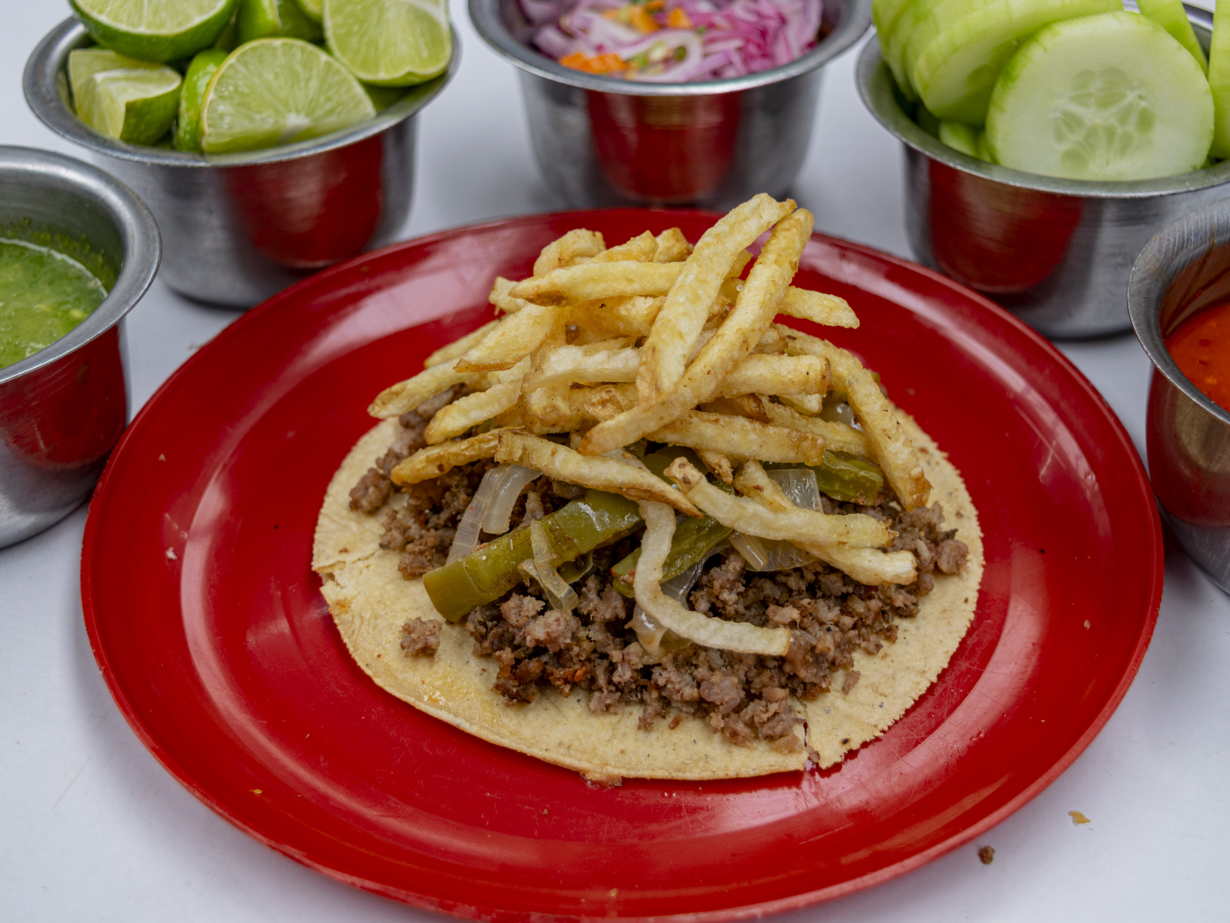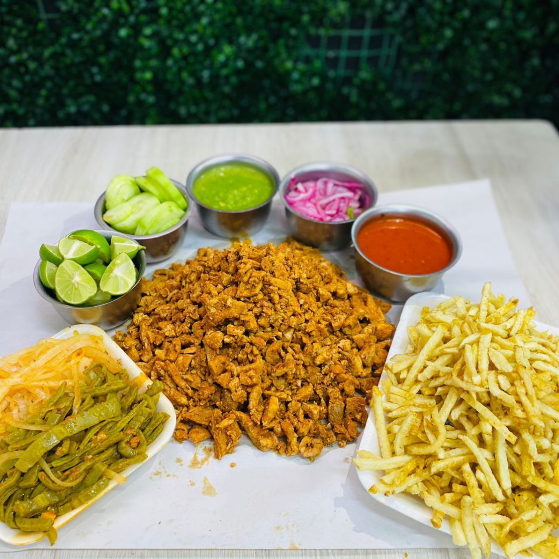 ncluye: 1 kilo de alambre, 1 charola grande de papas a la francesa, pepinos, cebolla morada con habanero, salsa verde, roja y limones y 1kilo de tortillas.