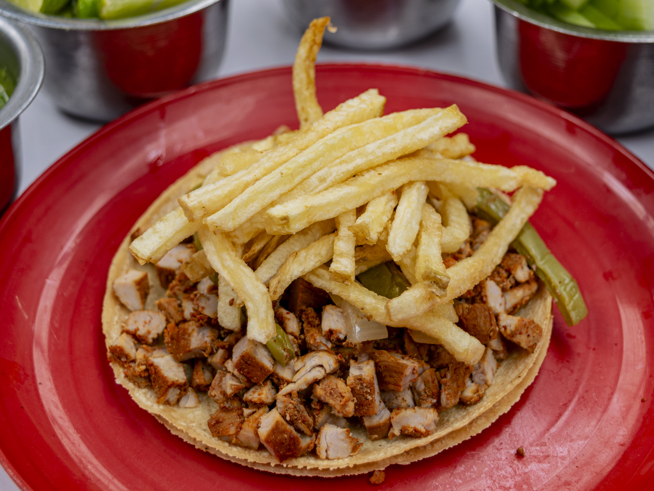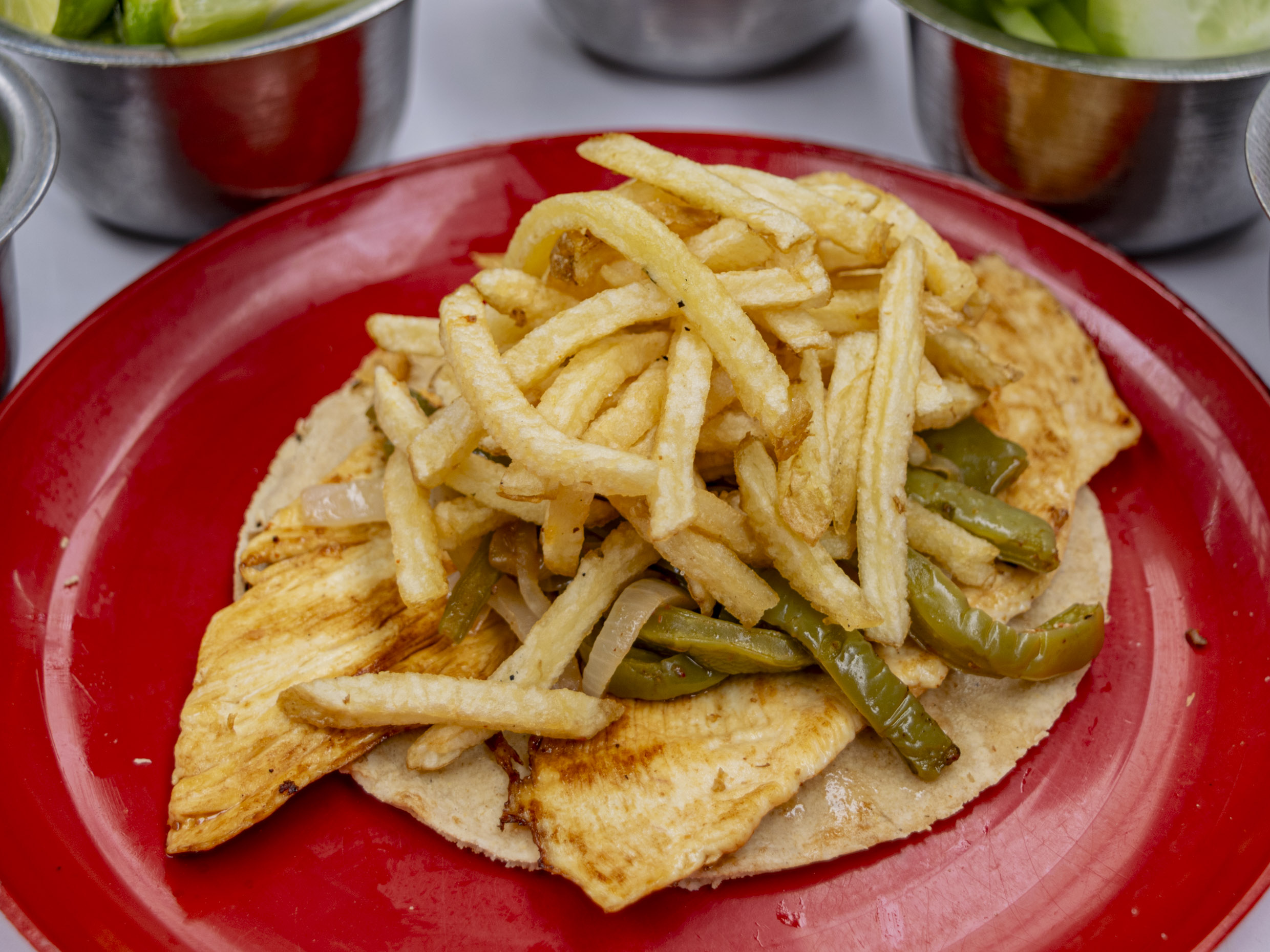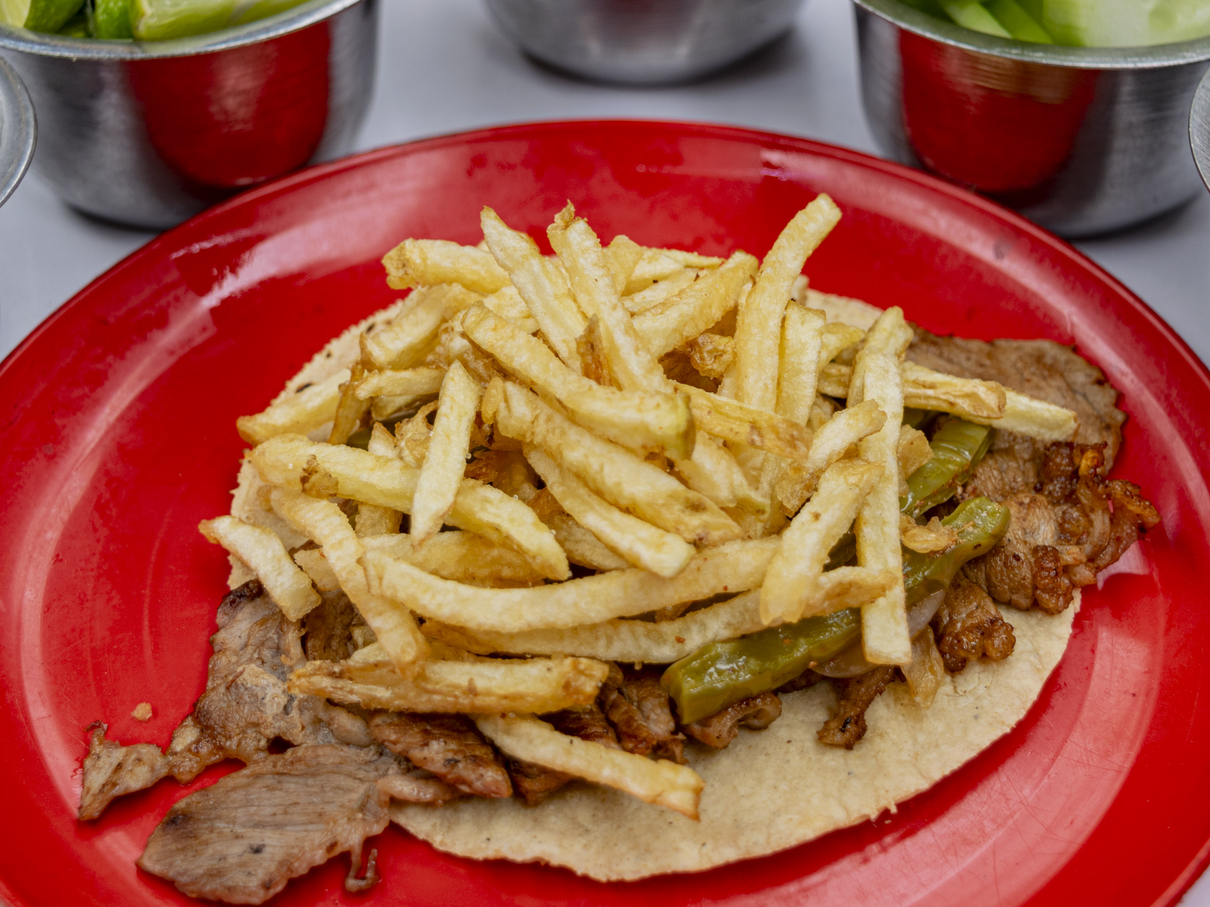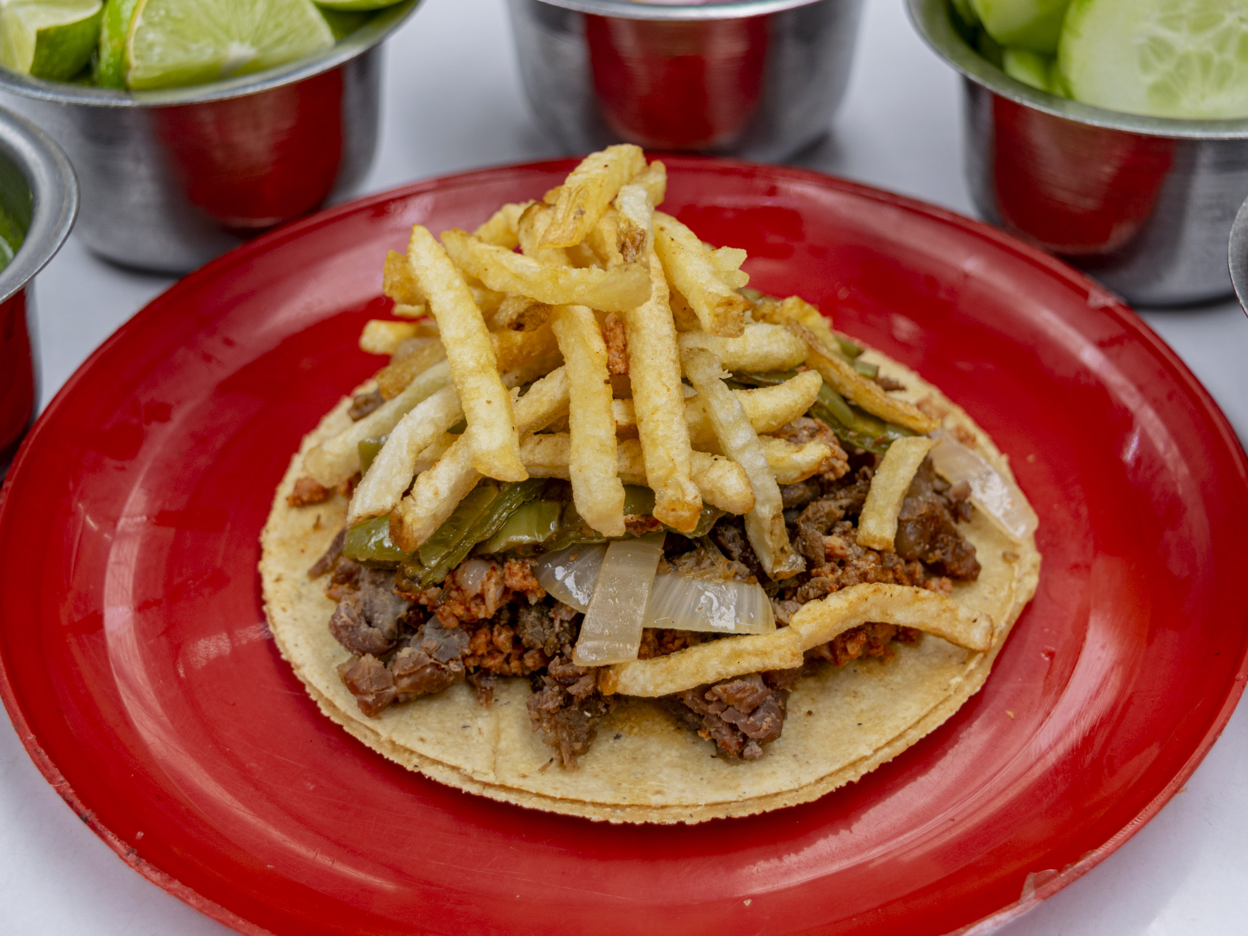 ncluye: 1 kilo de alambre, 1 charola grande de papas a la francesa, pepinos, cebolla morada con habanero, salsa verde, roja y limones y 1kilo de tortillas.