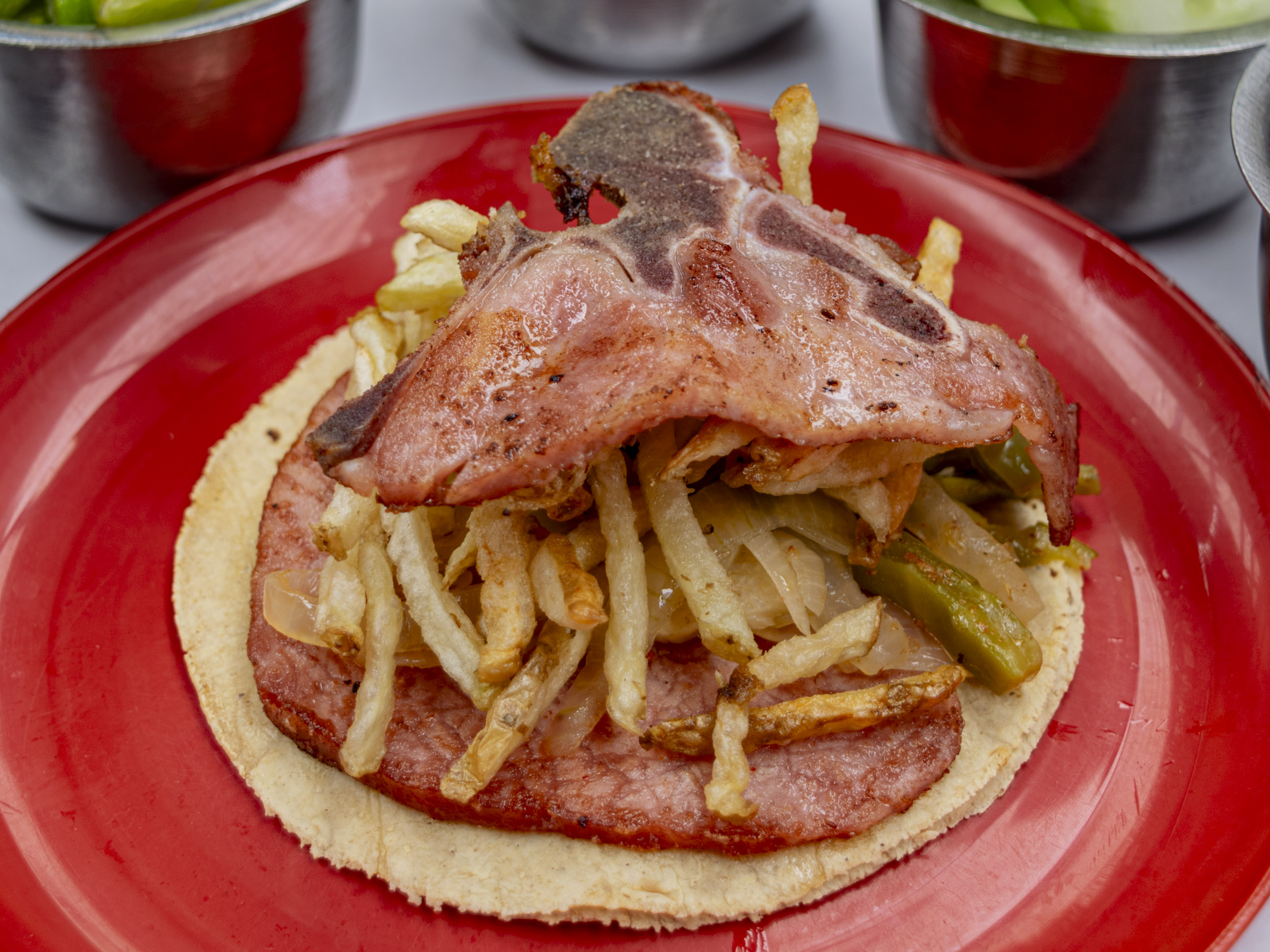 Preparado con 30 gramos(aprox) de chuleta jugosa y llena de sabor, es la elección perfecta para los amantes de la buena carne. Puedes pedirlo solo o acompañado de nopales, cebolla cocida o papas a la francesa, según tu preferencia. Y para completar tu experiencia, acompáñalo con una refrescante agua natural de 1 litro. ¡Una delicia irresistible que deleitará tu paladar!