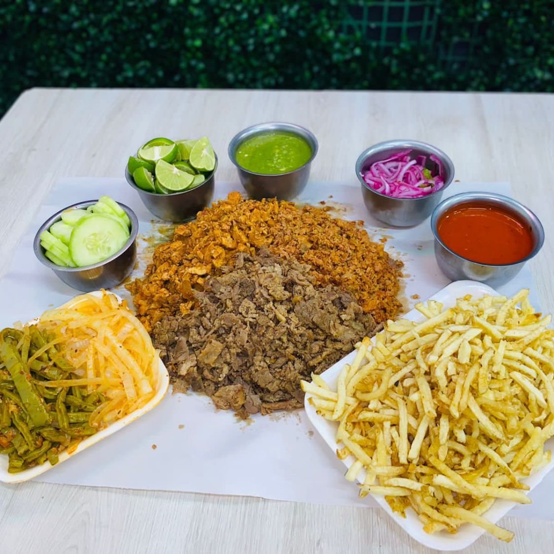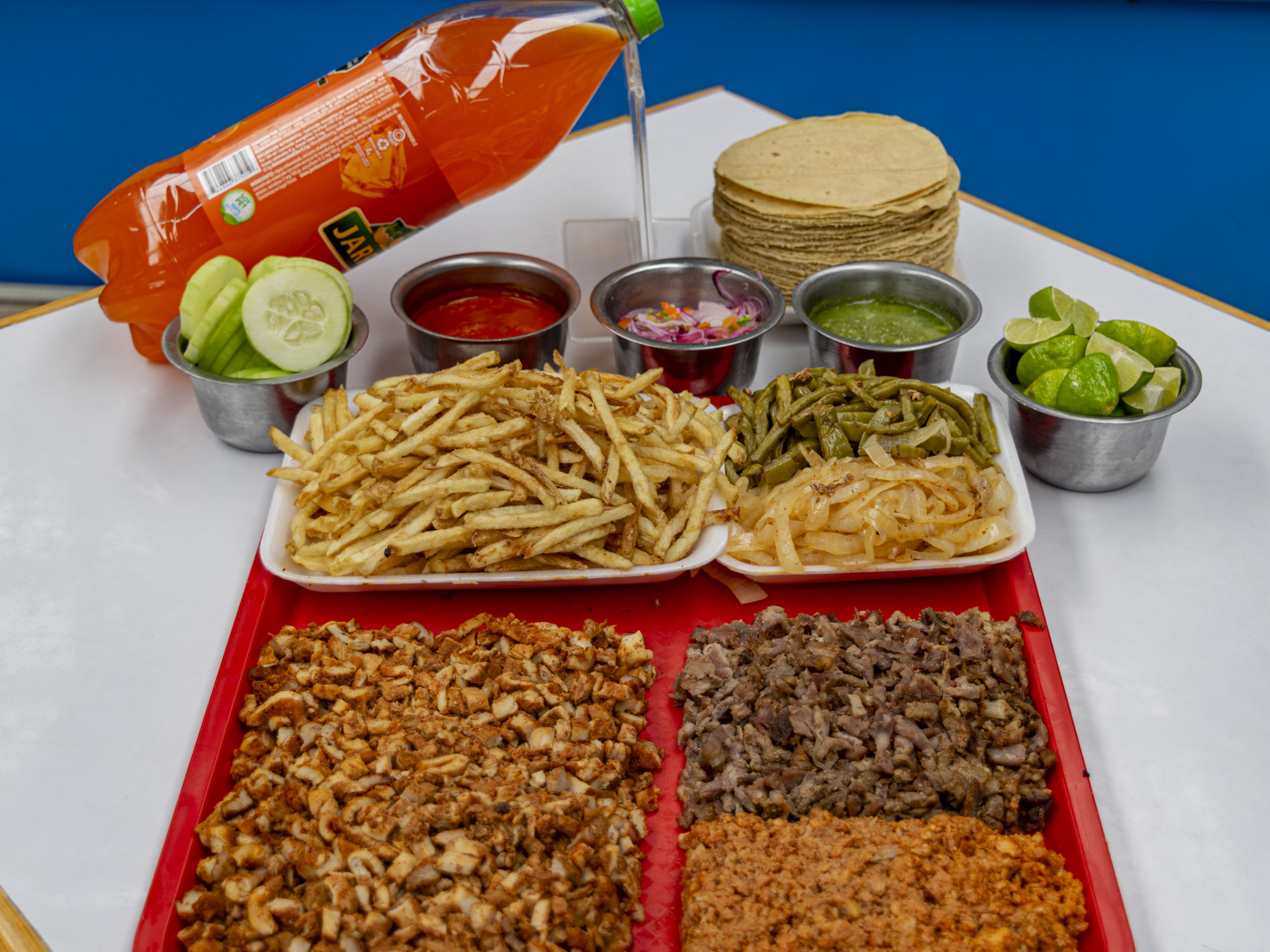Disfruta de 1 kilo de carne cocida a elegir, acompañado de una charola grande con papas a la francesa, nopales y cebollas cocidas. Además, incluye pepinos, cebolla morada con habanero, salsas verde y roja, limones, un refresco de 2 litros y 1 kilo de tortillas. ¡Todo listo para compartir y disfrutar al máximo! 🔥😋