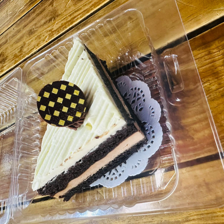 Este exquisito pastel está formado por un suave bizcocho de chocolate oscuro humedecido con jarabe O SIROP simple, coronado por un mousse sedoso de chocolate con leche y rematado con una nube cremosa de mousse de chocolate blanco. Tres texturas, tres sabores, una sola experiencia gloriosa.