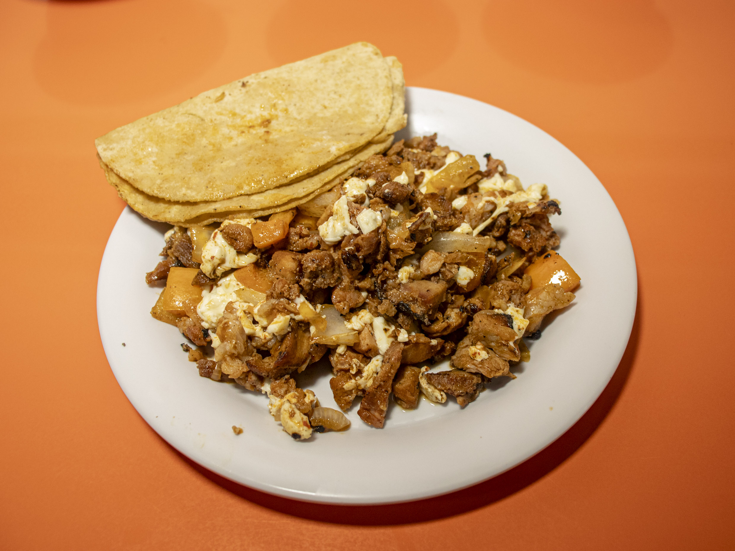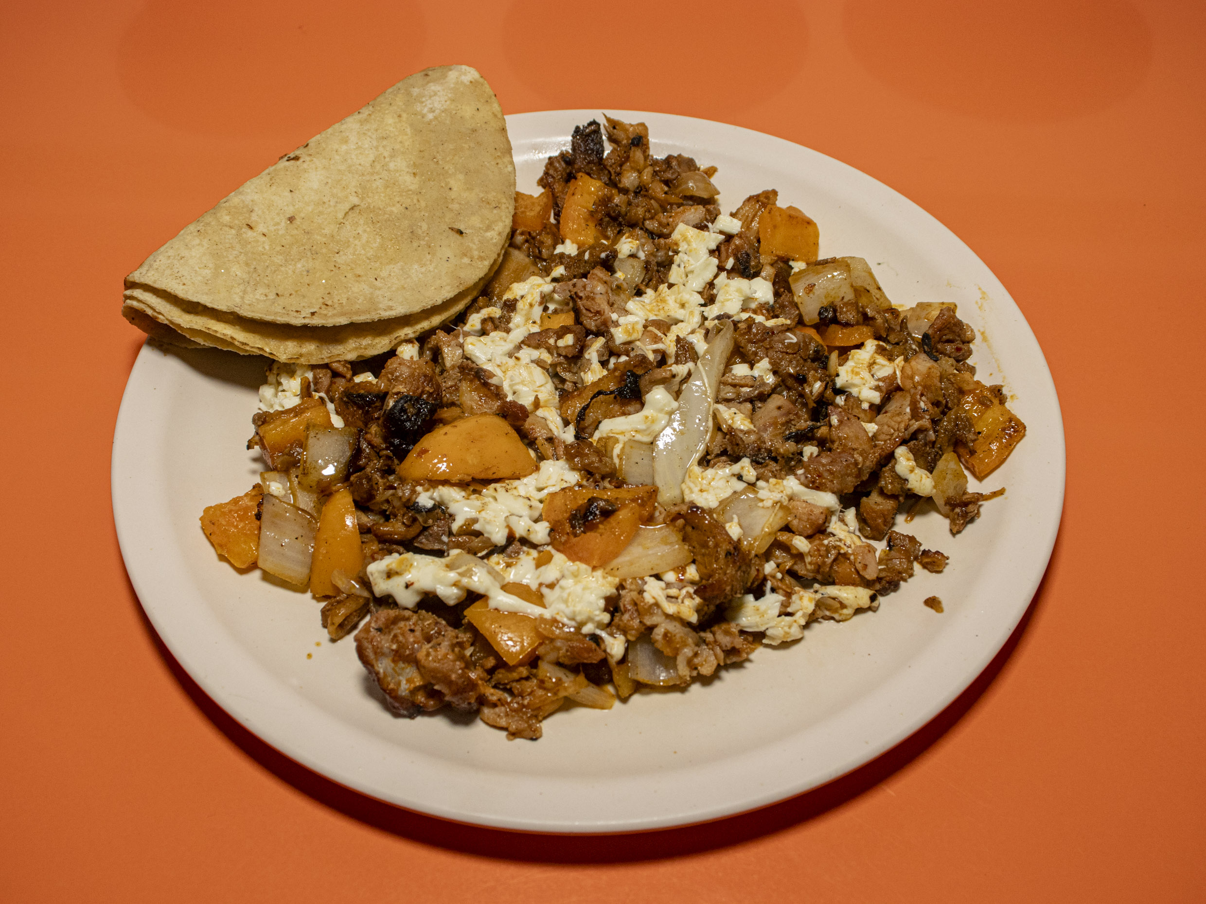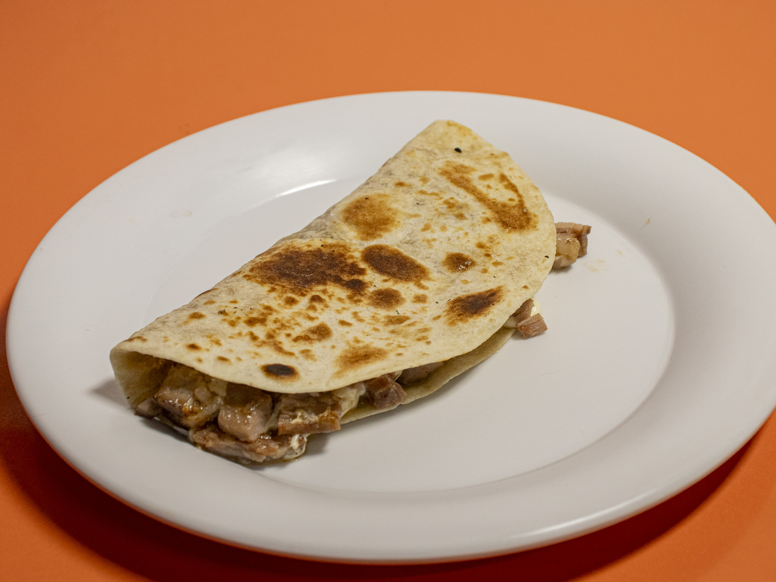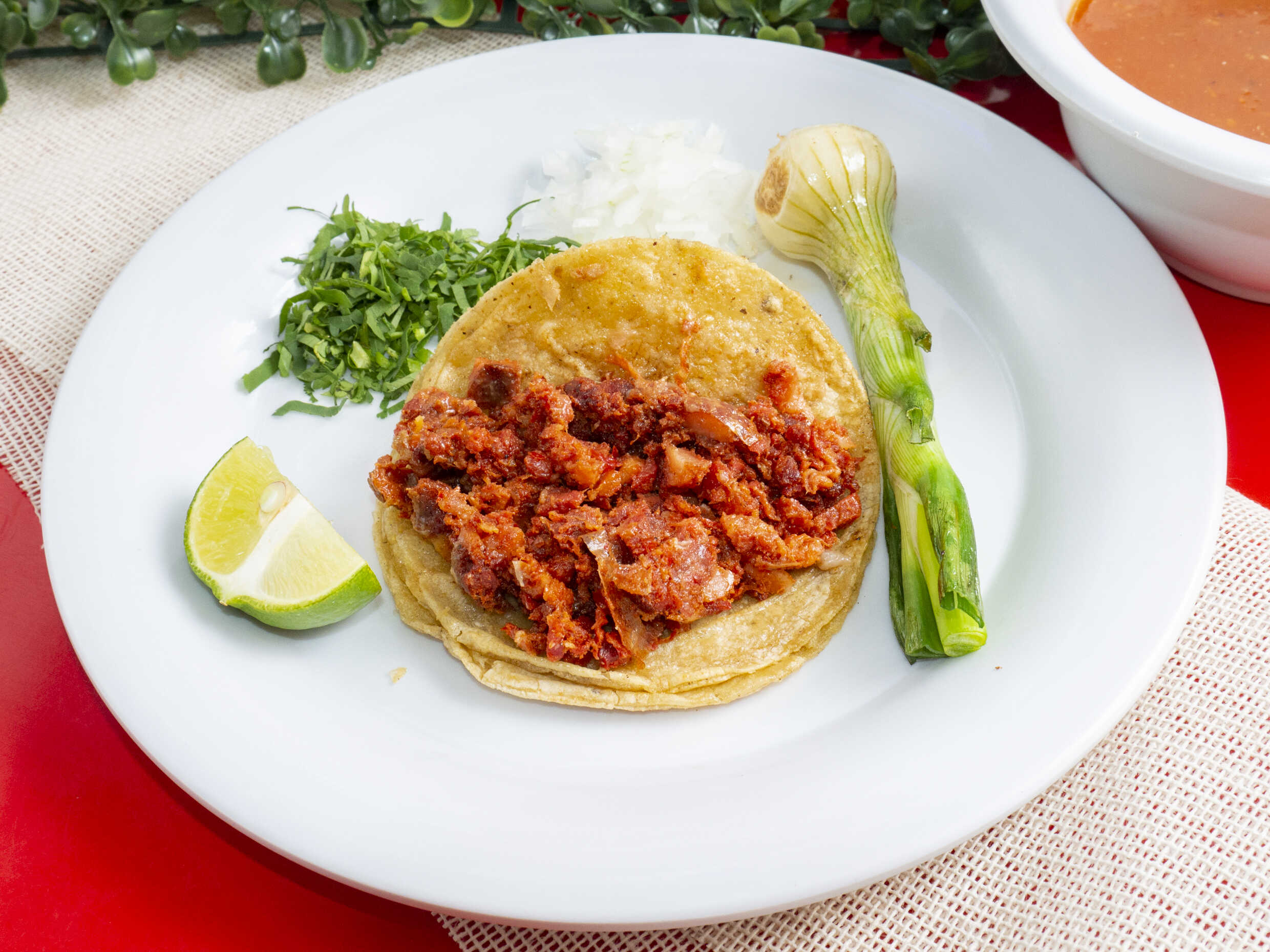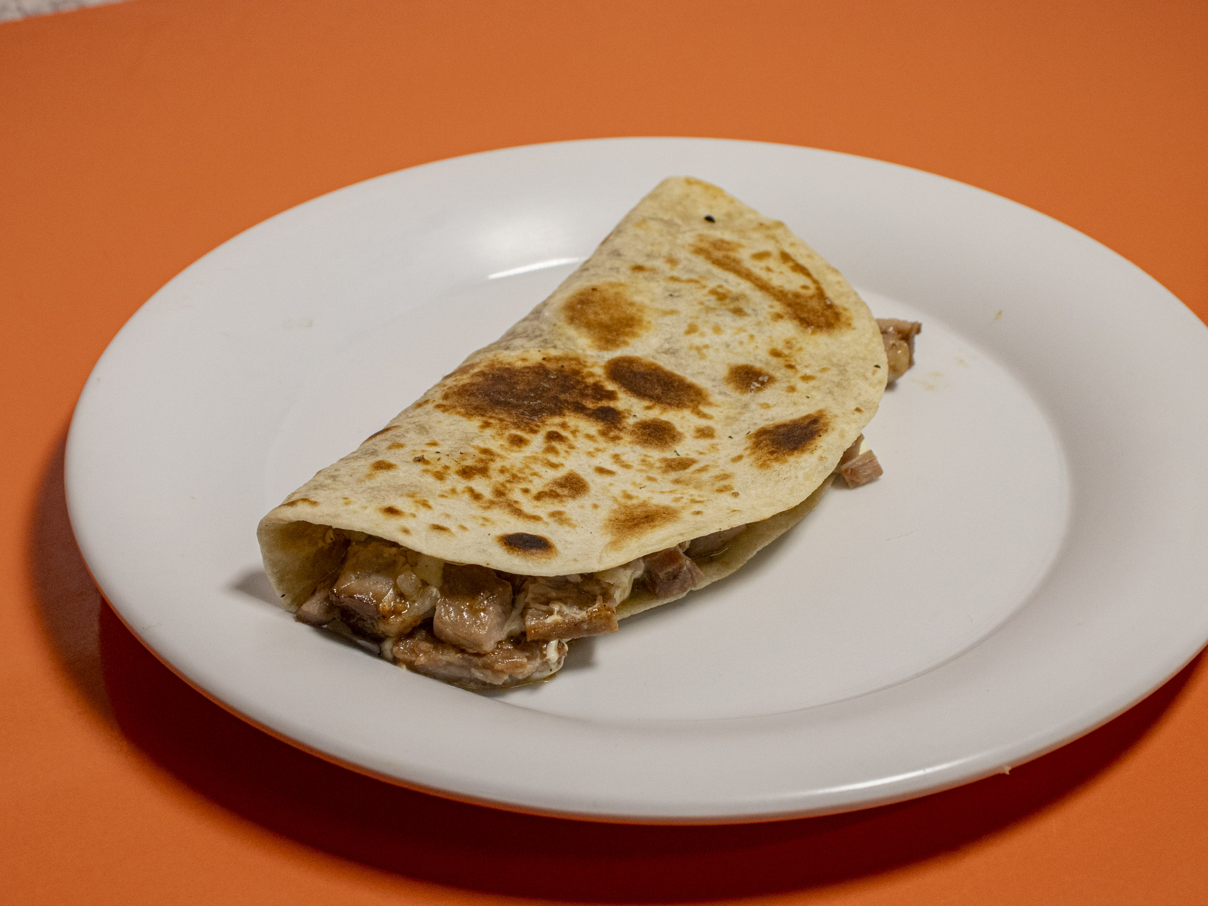 Porción personal: Tortilla de maíz grande con carne suadera en trozos.