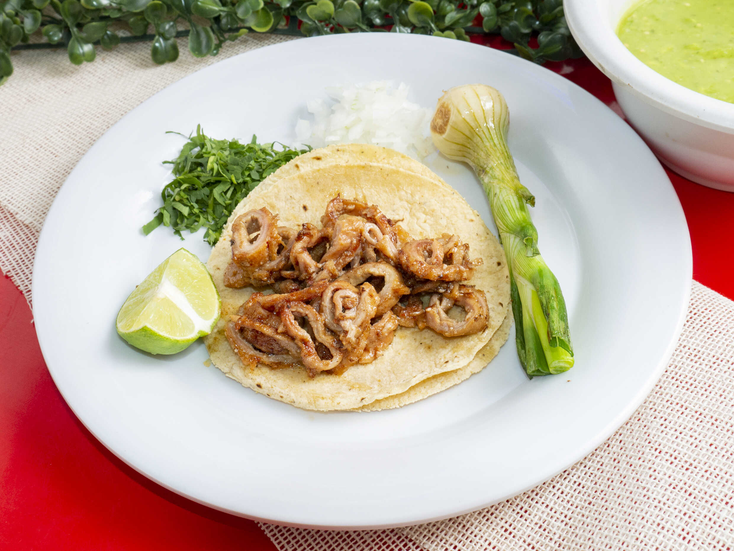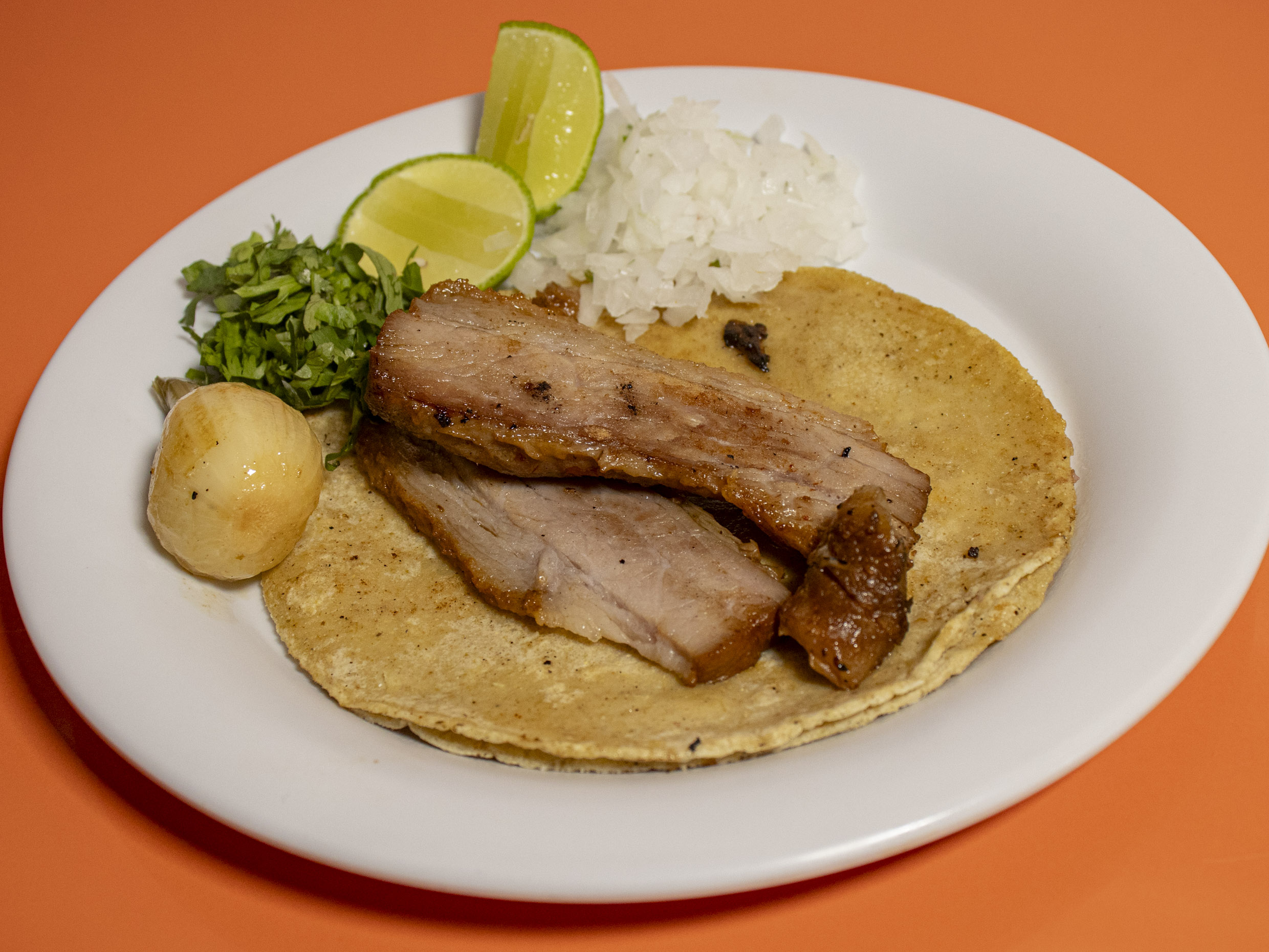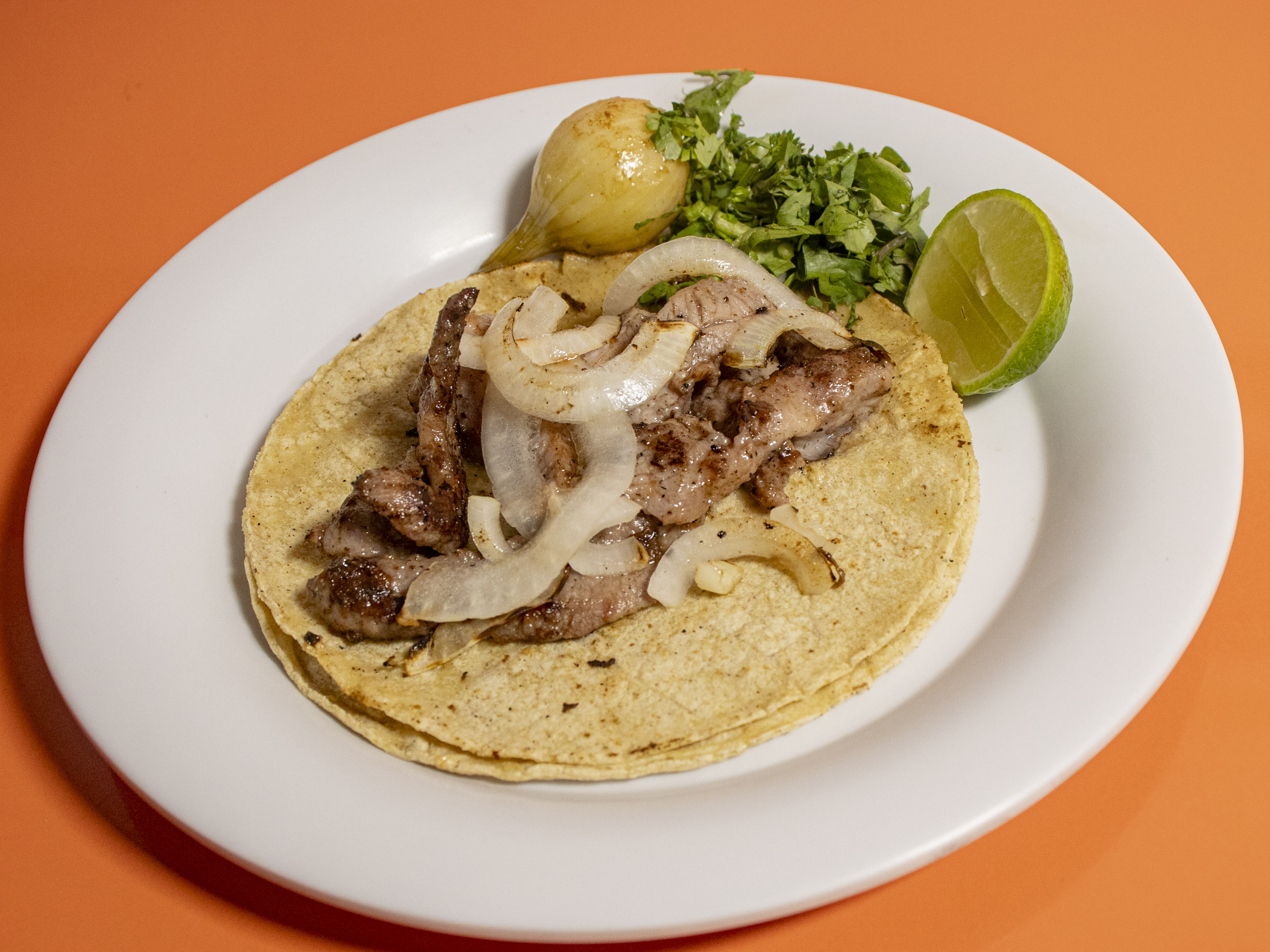 Porción personal: Orden de 5 piezas (100 g aprox. c/u). Taco hecho con tortilla taquera de maíz y carne al pastor. Se acompaña aparte con cilantro, cebolla blanca y salsa de morita.