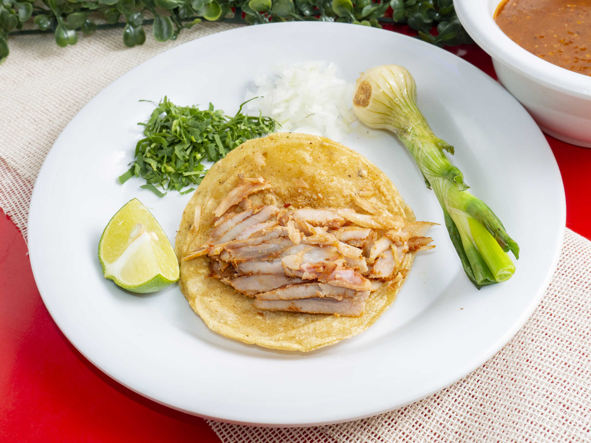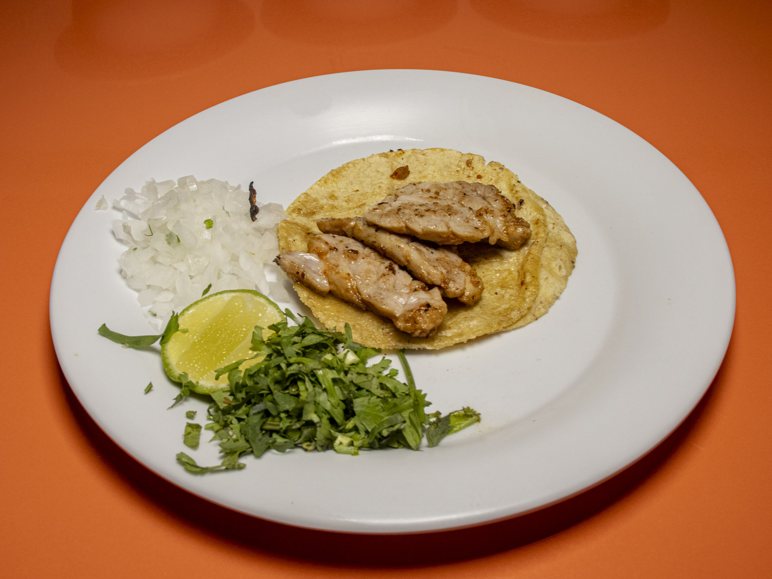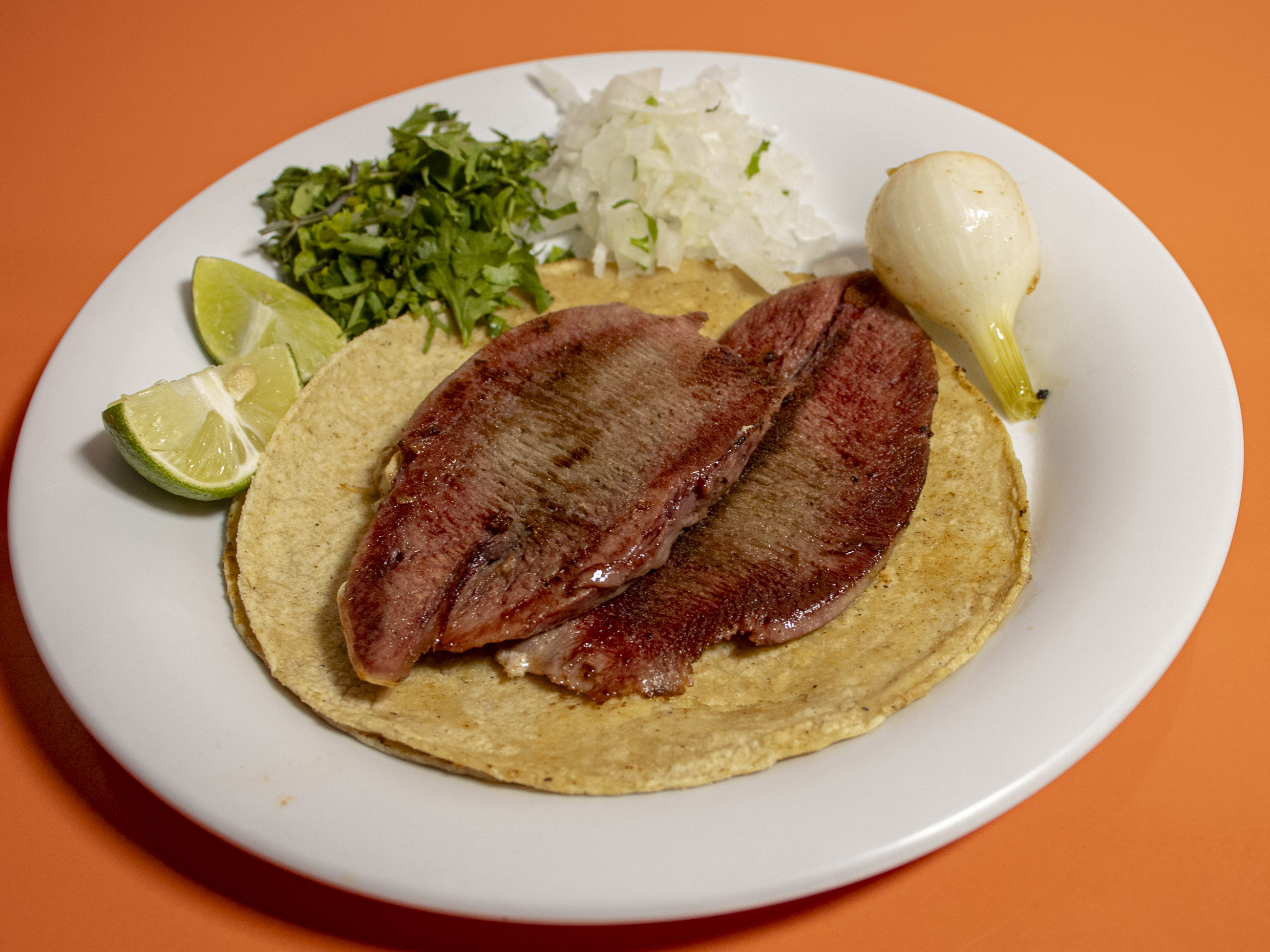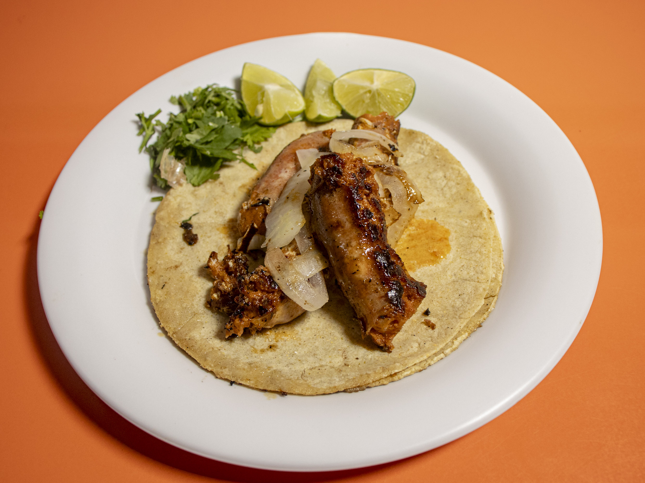 Porción personal: Orden de 5 piezas (100 g aprox. c/u). Taco hecho con tortilla taquera de maíz y carne al pastor. Se acompaña aparte con cilantro, cebolla blanca y salsa de morita.