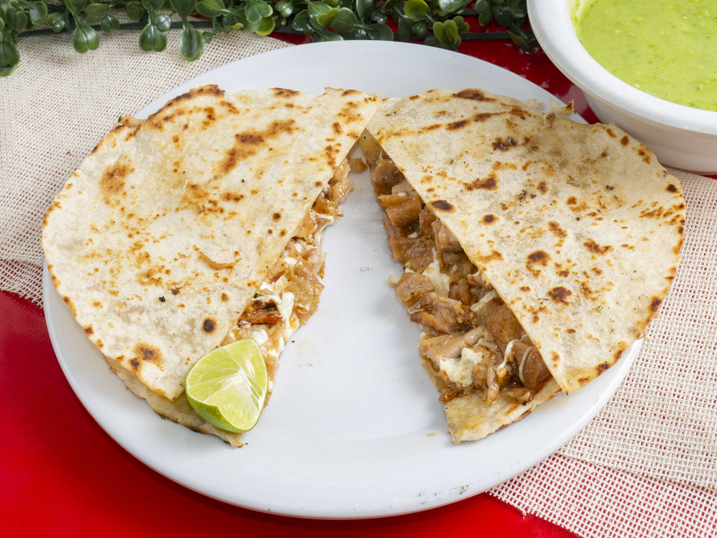 Carne al pastor preparada con queso gratinado y trozitos de piña servida entre dos tortillas de harina tamaño jumbo partida en 8 rebanadas tipo pizza para compartir