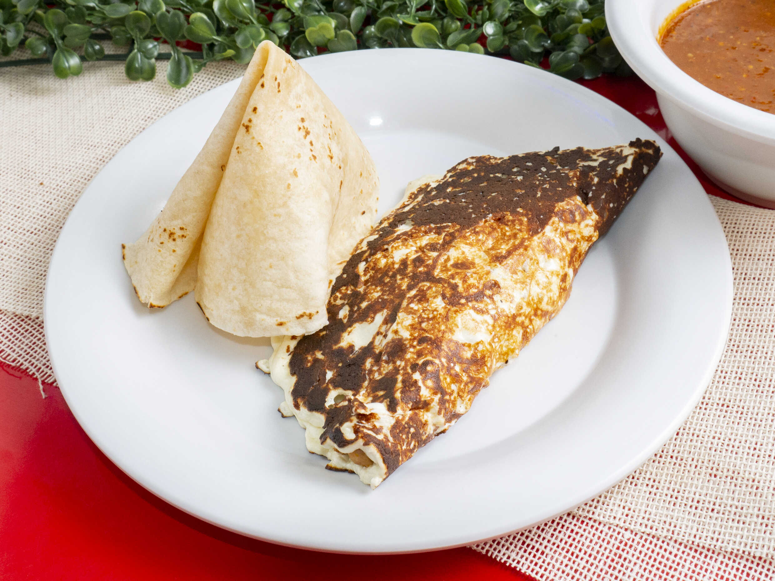Porción de queso gratinado hasta el grado de formar una costra en la base y se rellena con bistec acompañado con tortilla de harina