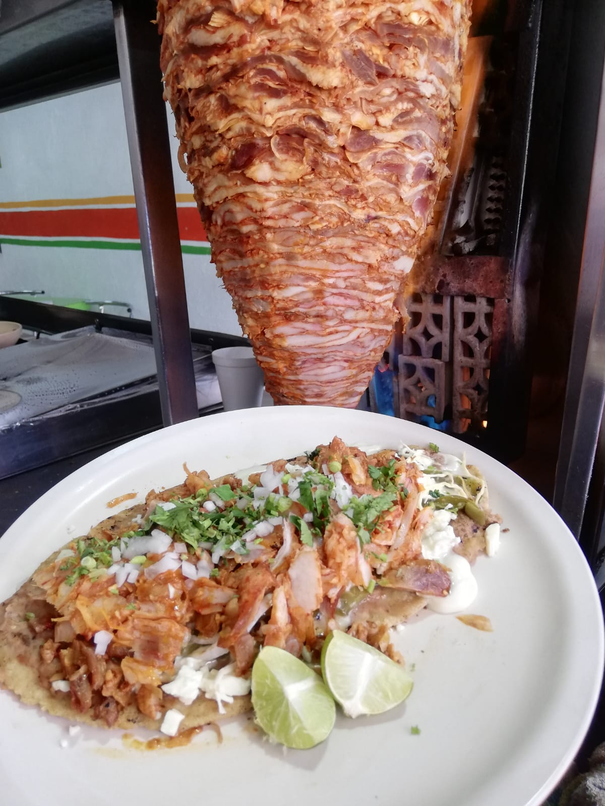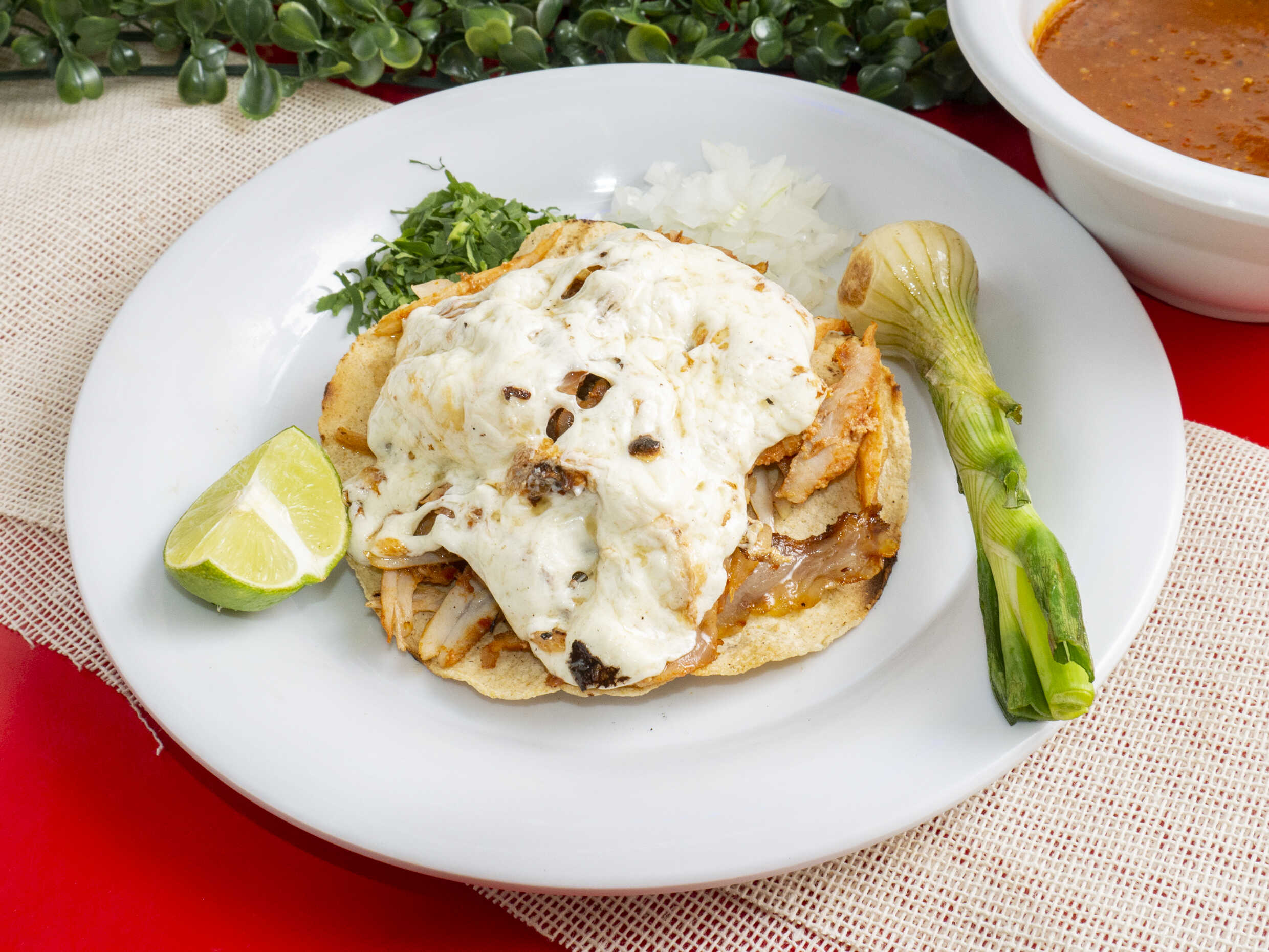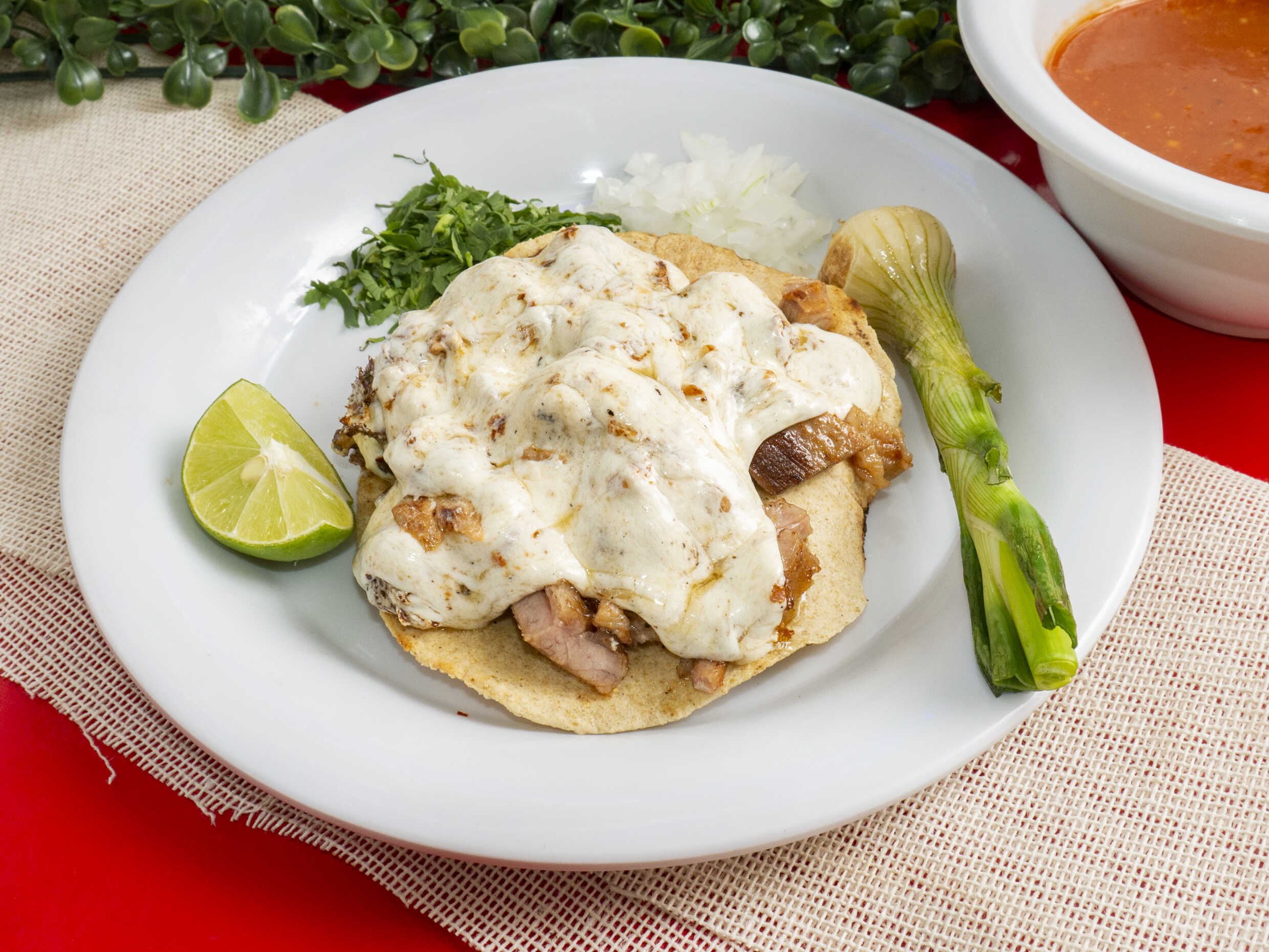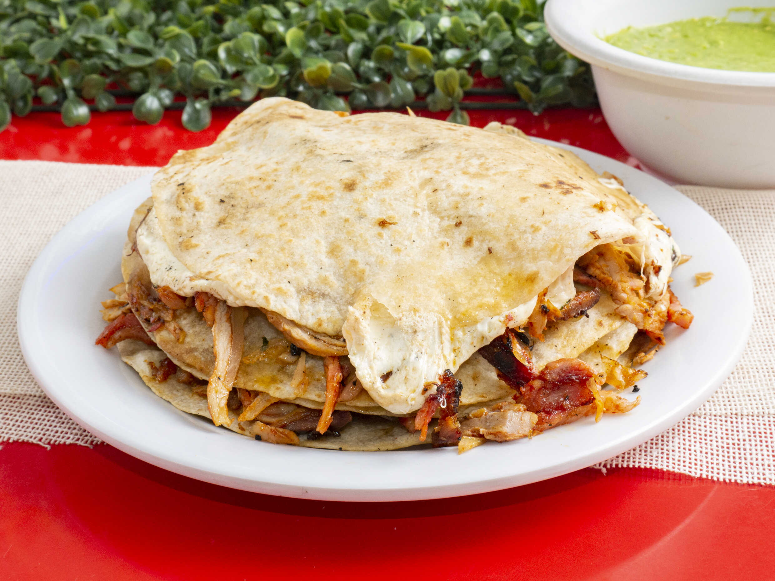 Carne al pastor con queso Oaxaca gratinado servido en tres pisos de tortilla de harina