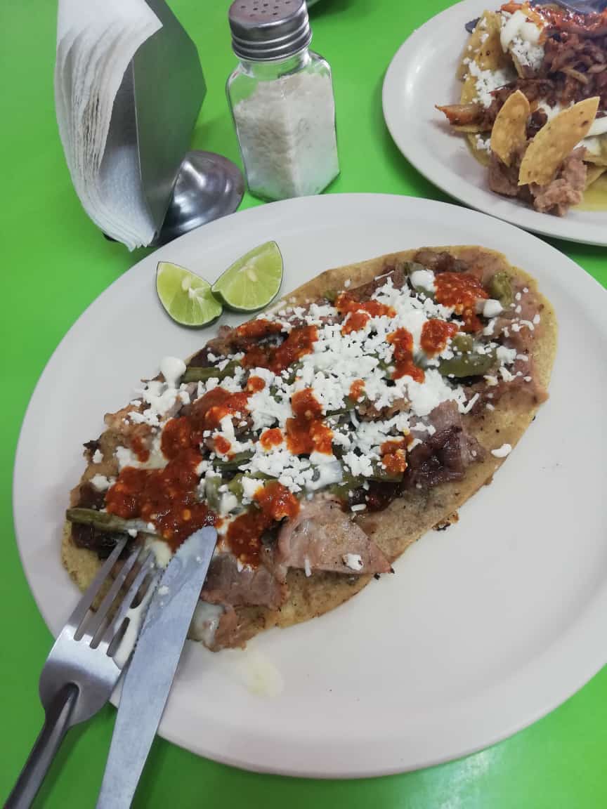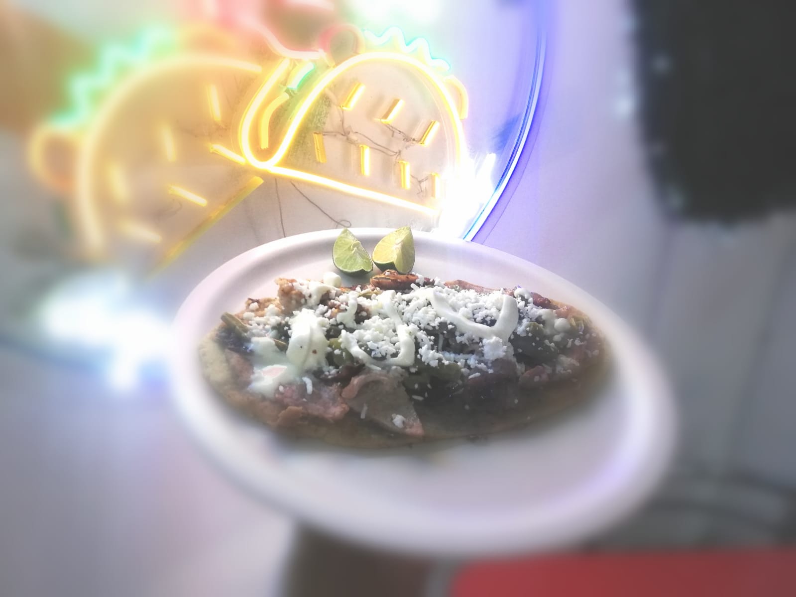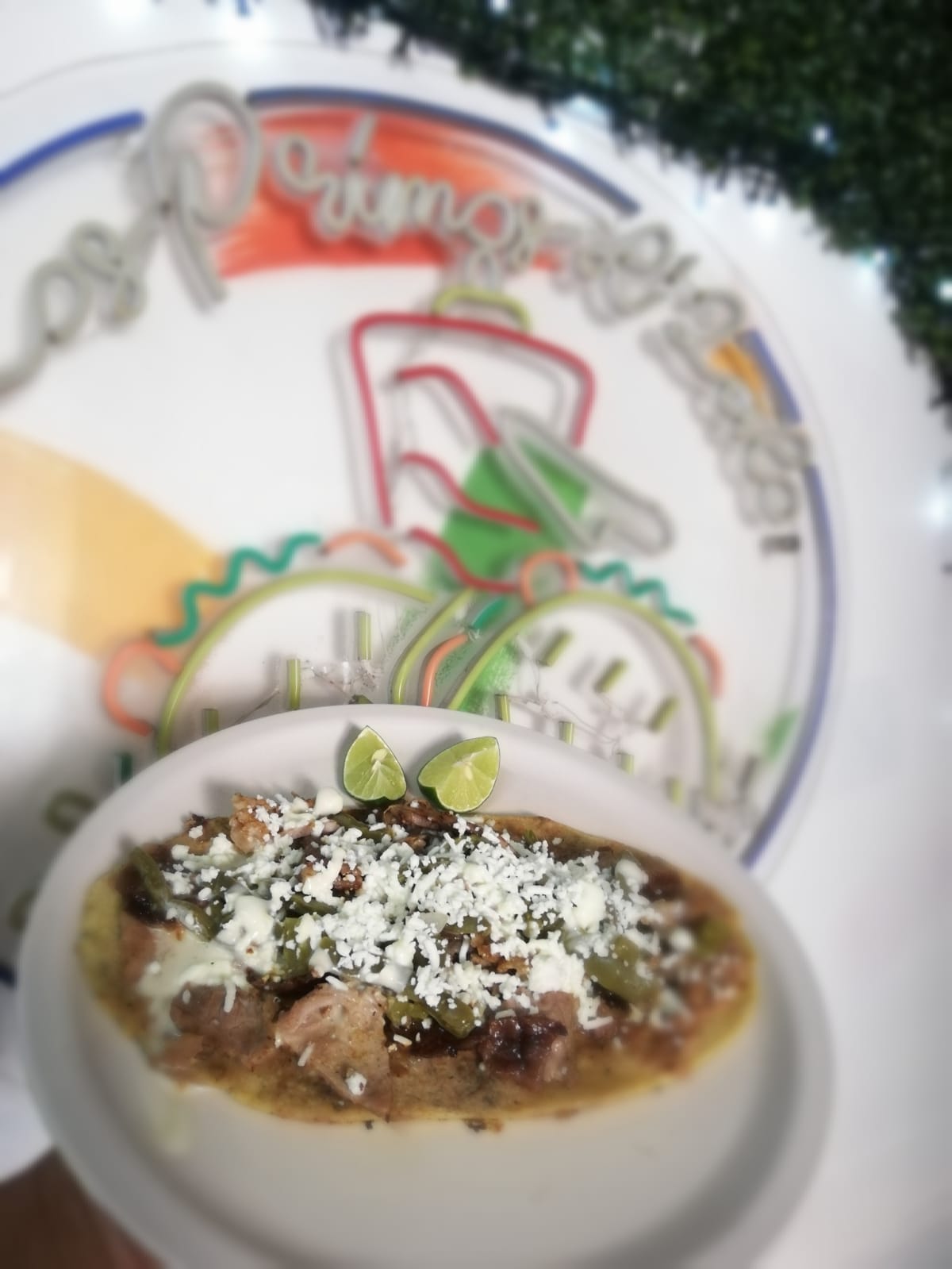 Huarache con pastor Con guarnición de frijoles refritos, nopalitos, queso, crema, cilantro y cebolla.