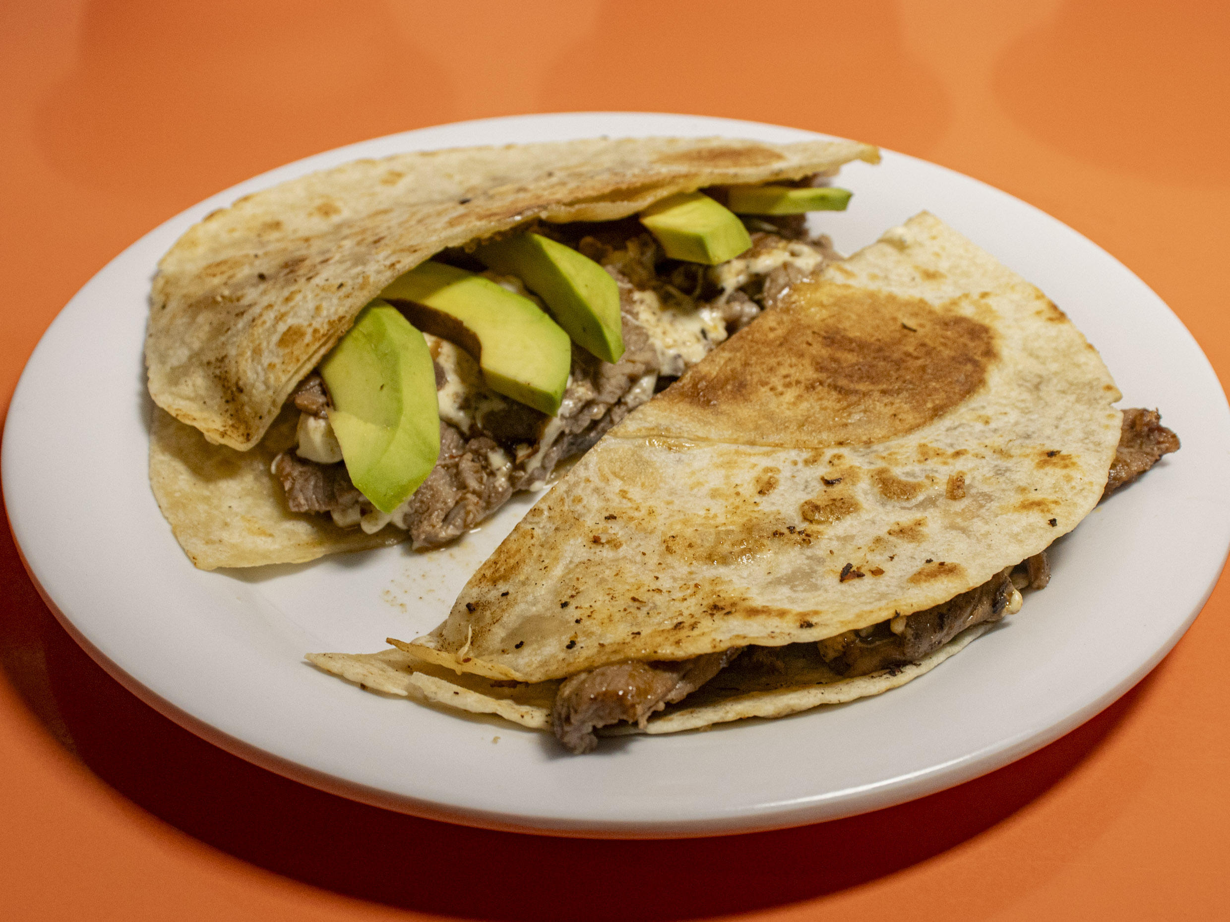 bistec de res con queso gratinado servido entre 2 tortillas de harina