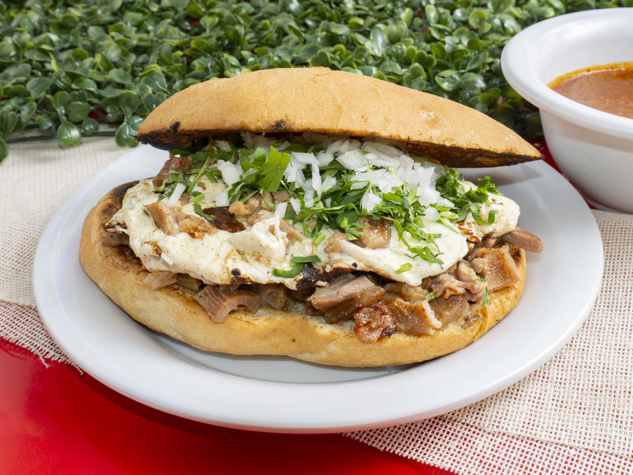 Torta en telera rellena con carne de pastor, queso gratinado.