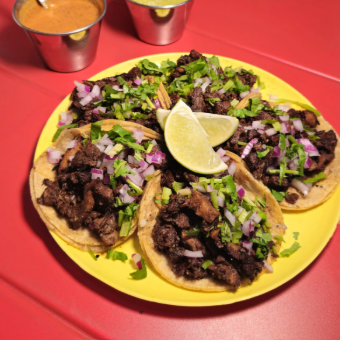 Tortilla de maiz, carne de res (60g), salsas y complementos (cebolla y cilantro)