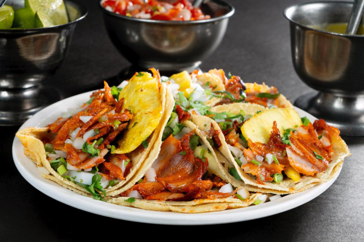 7 Tacos, pastor, jitomate, cebolla, tocino y pimiento y queso.