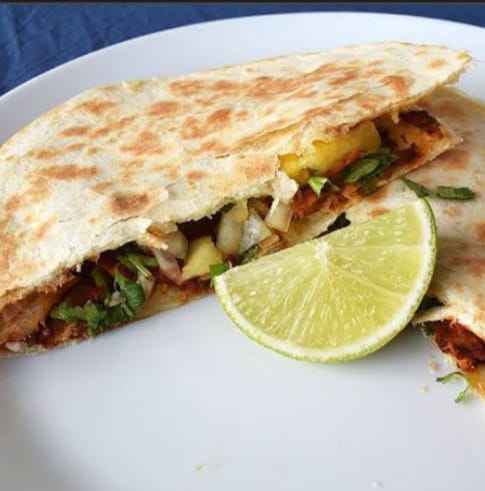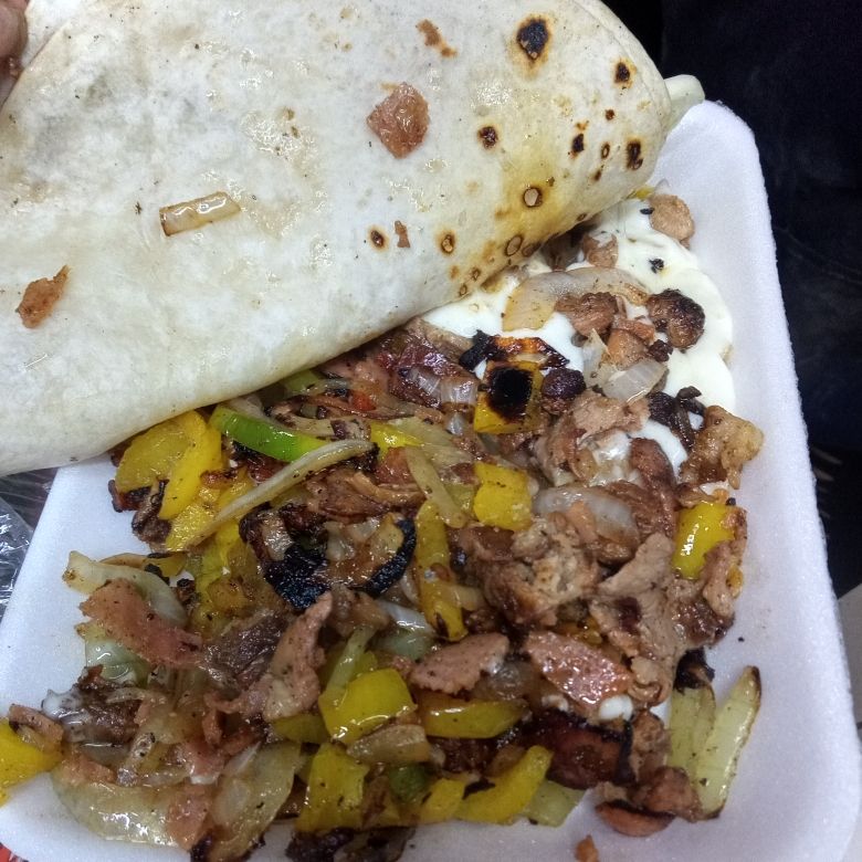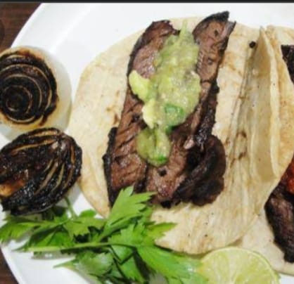 Tortilla de harina rellena de bistec con cebolla, morrón, tocino o jamón, queso y guacamole (cebolla, cilantro, pepino y limón).