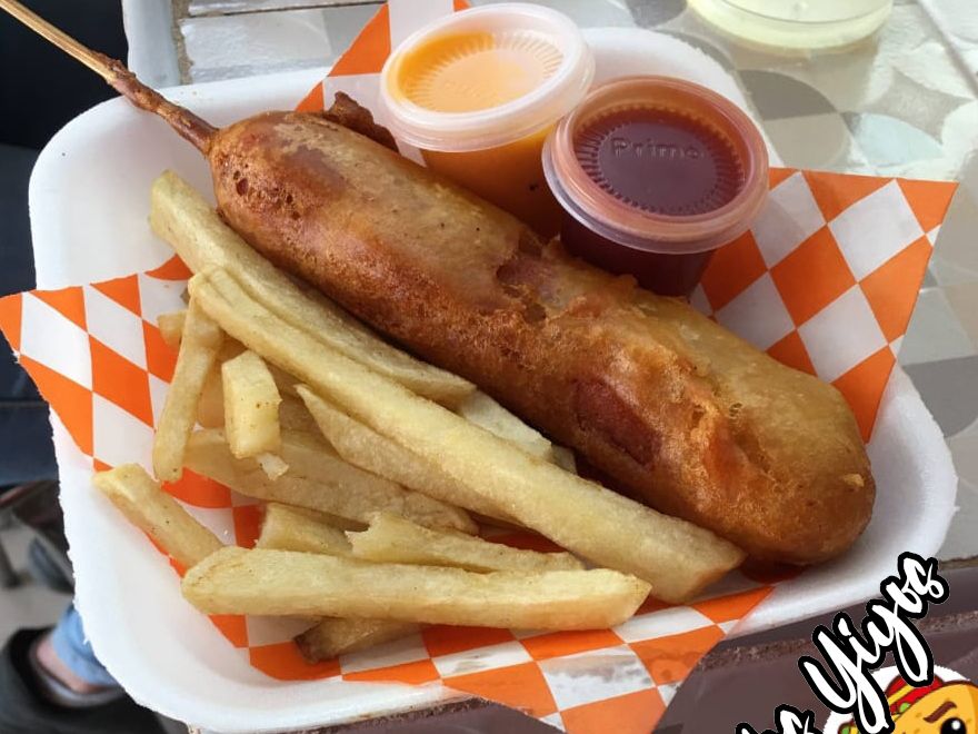 Salchicha, quedo manchego, adereso y salsa de queso amarillo.