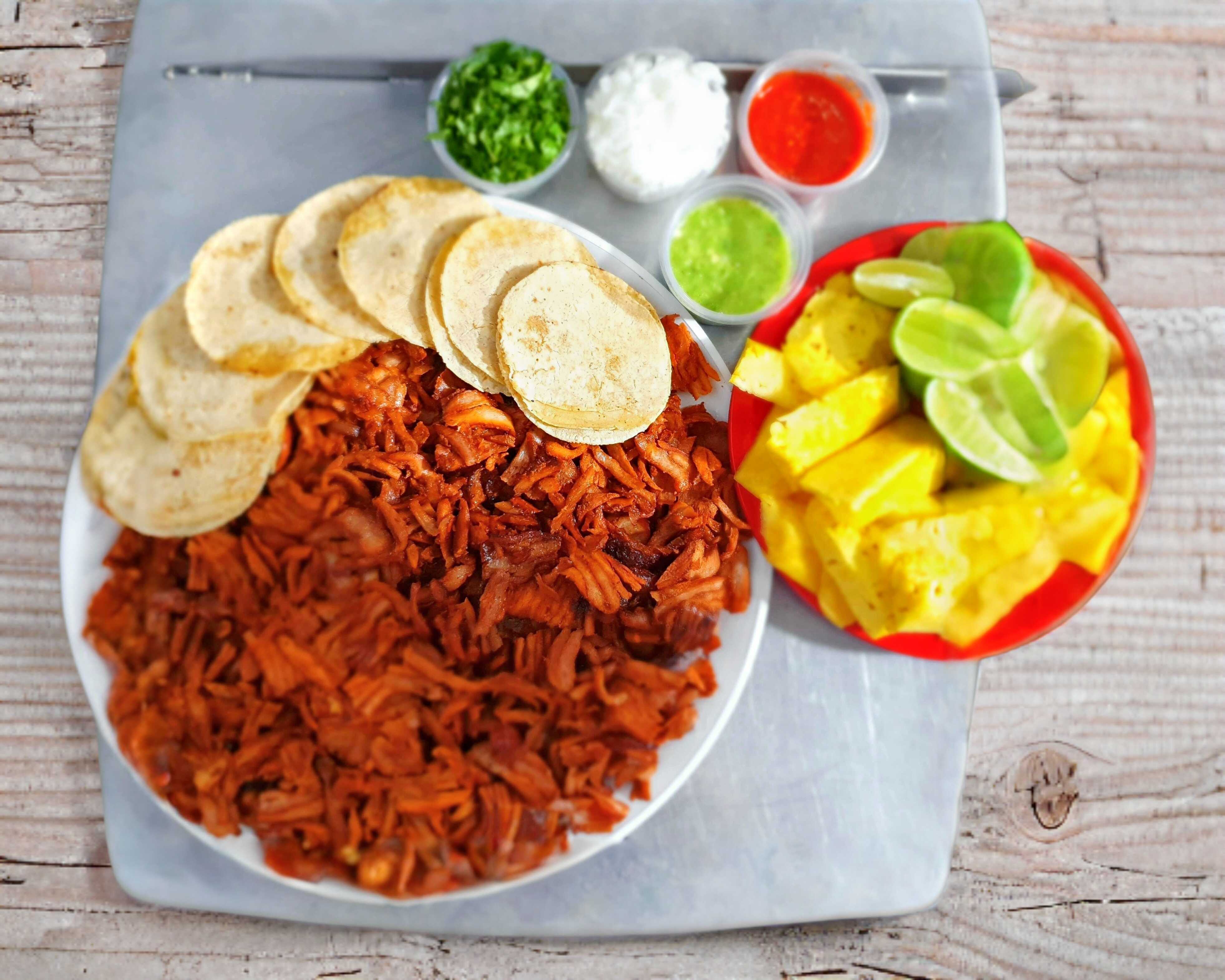 1 kg De carne al pastor, 74 tortillas, salsas, limones, cebolla y cilantro.