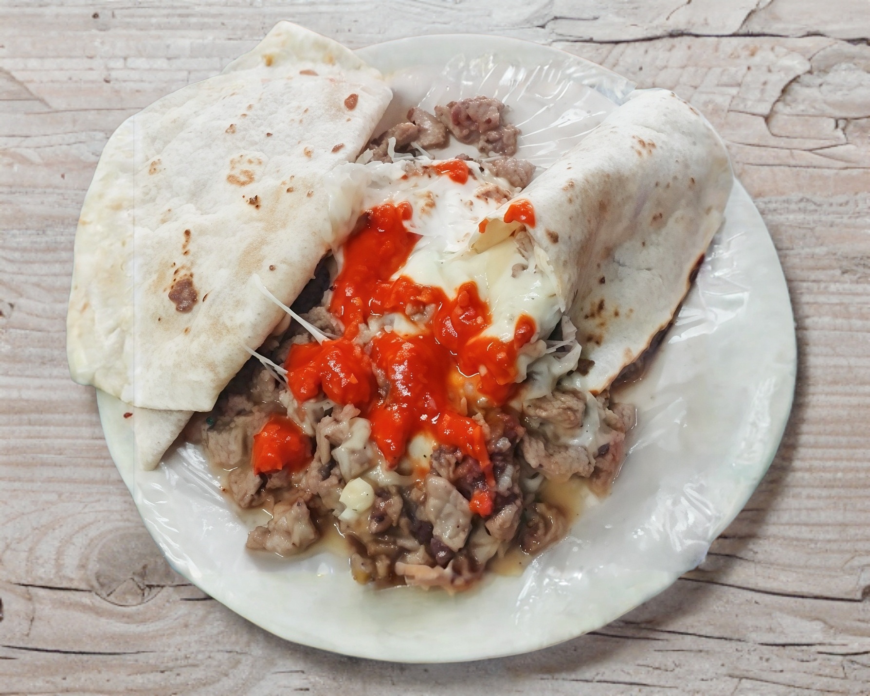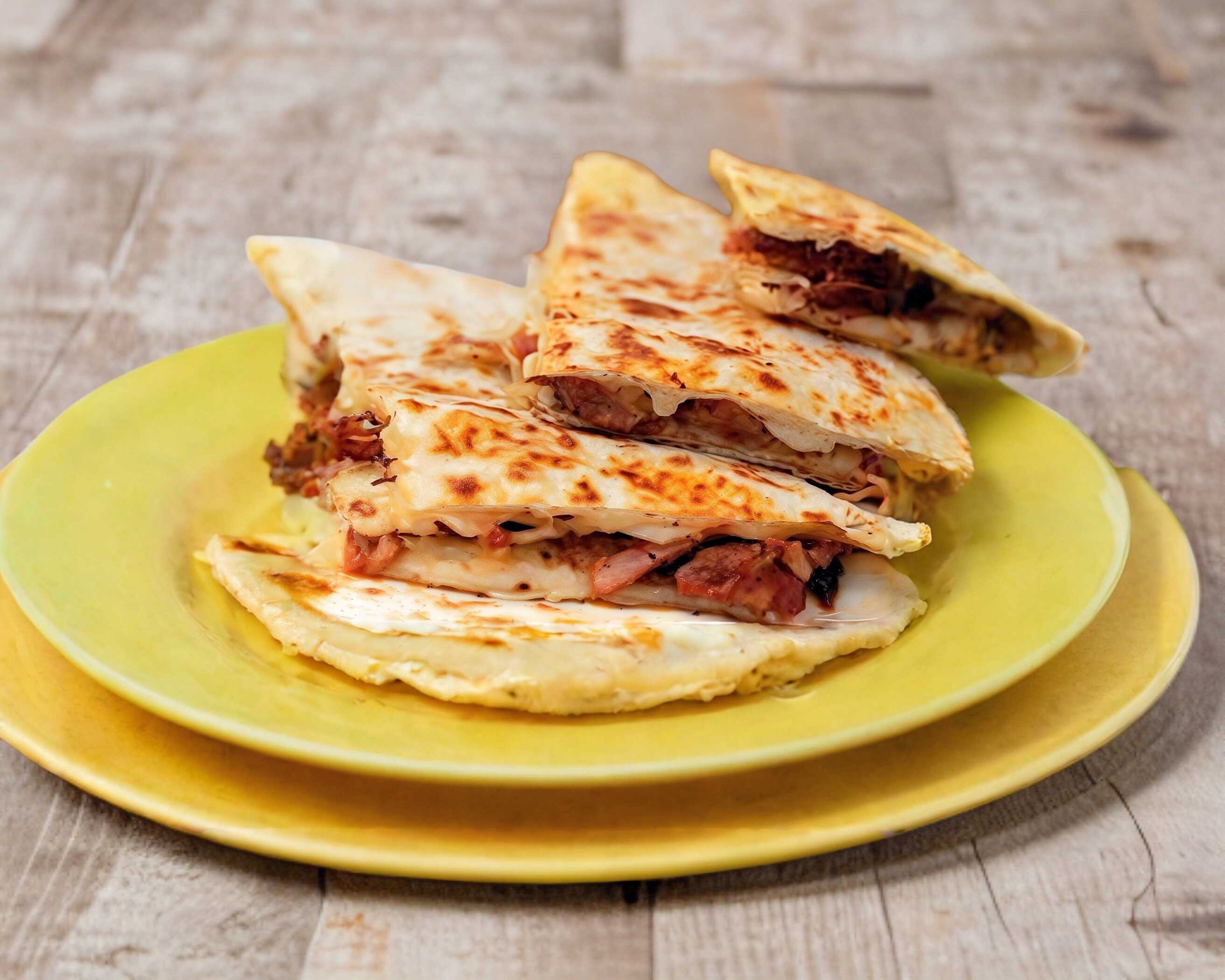 Tortilla de harina, carne al pastor, piña y queso Oaxaca.
