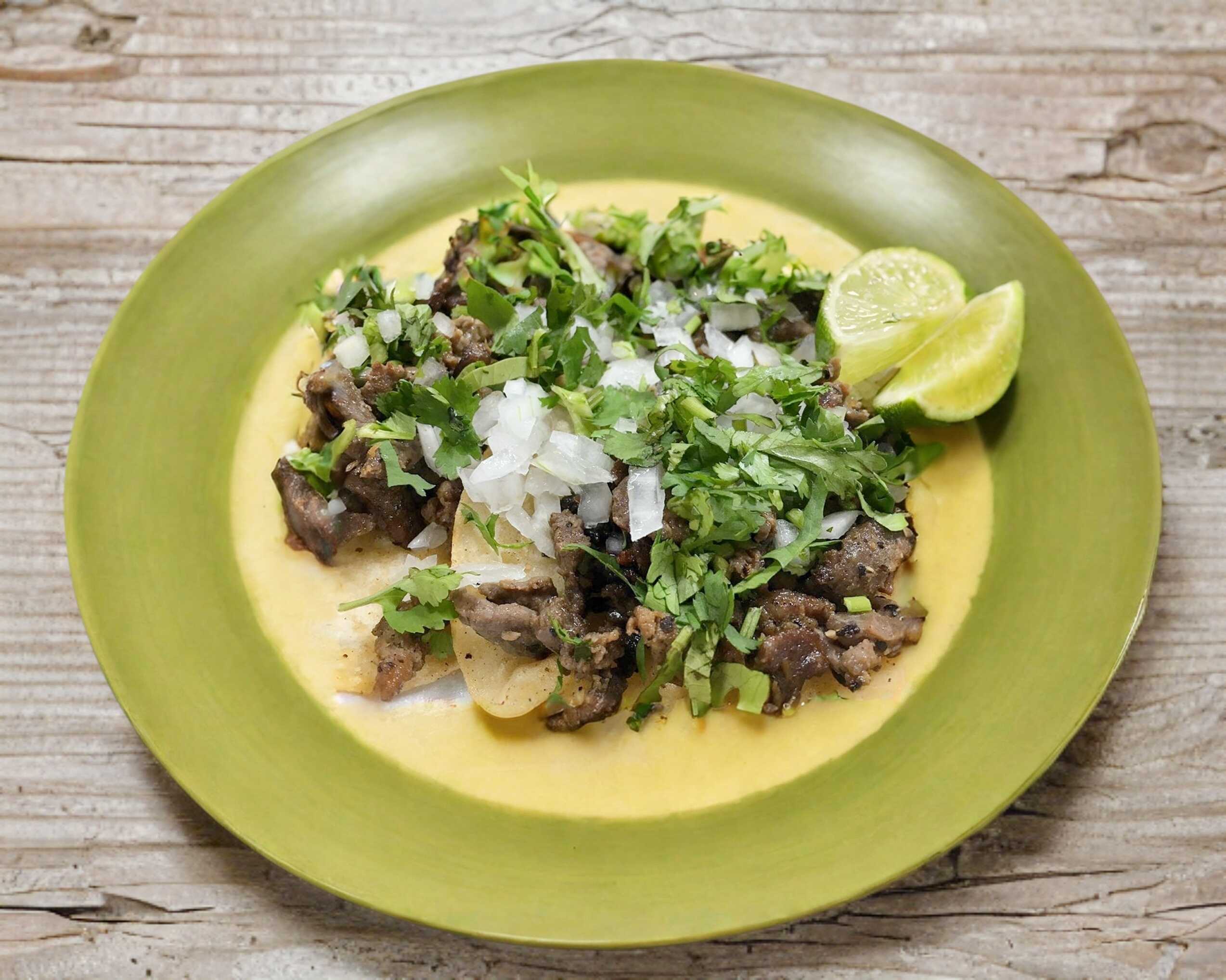 Orden de 3 tacos de bistec con queso Oaxaca.