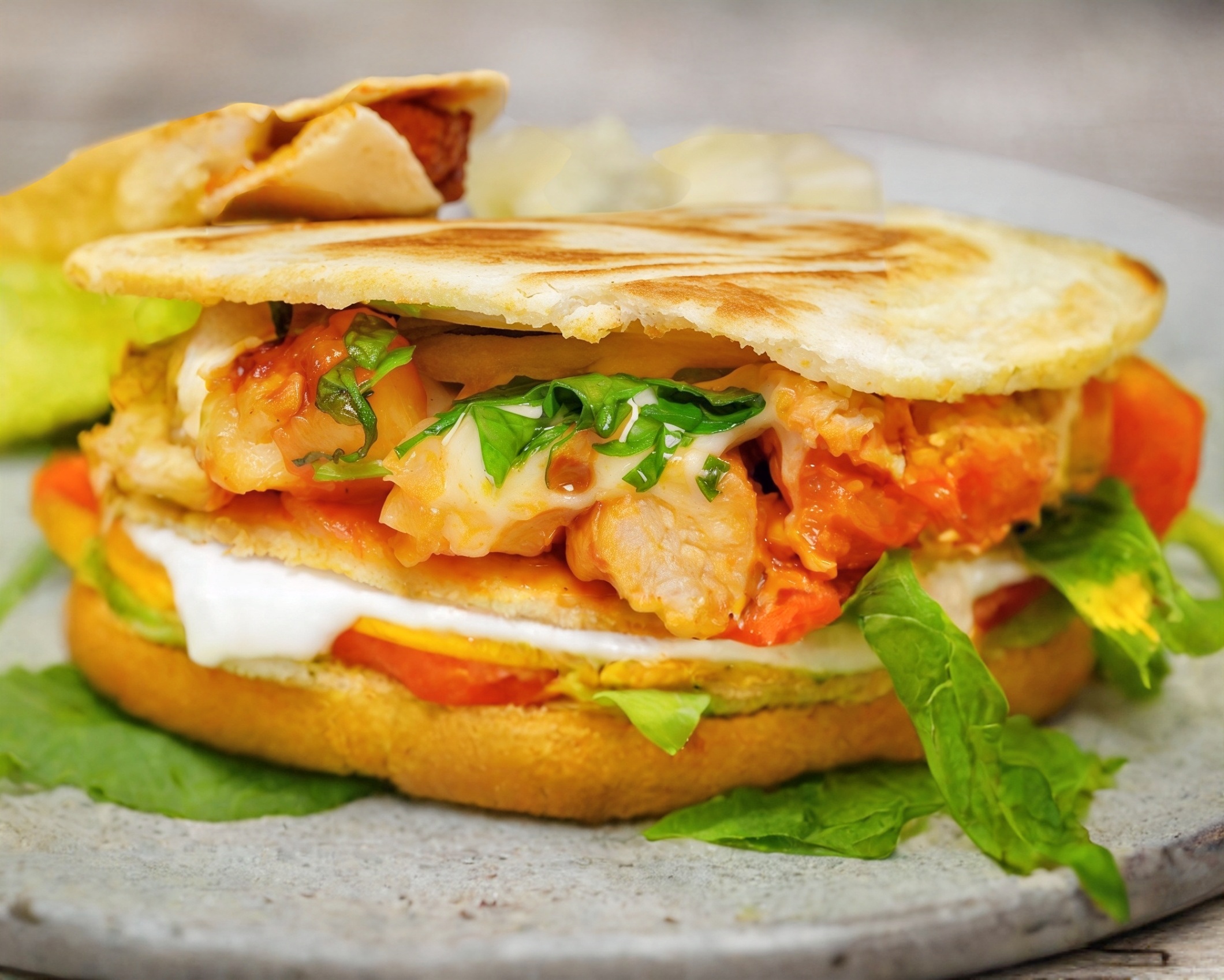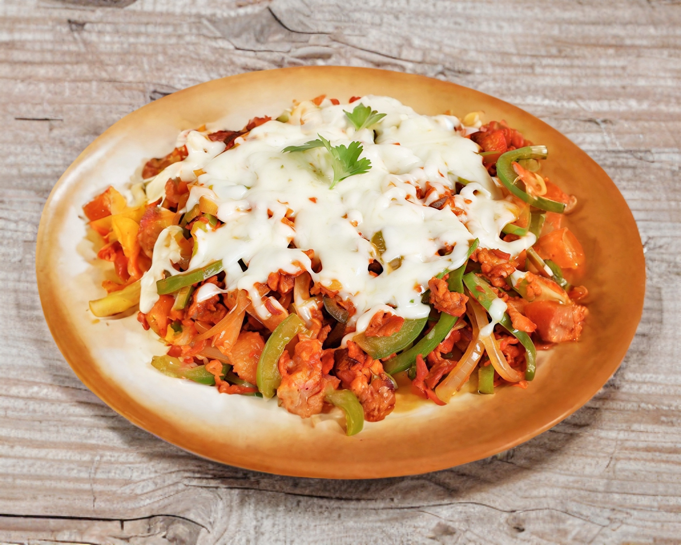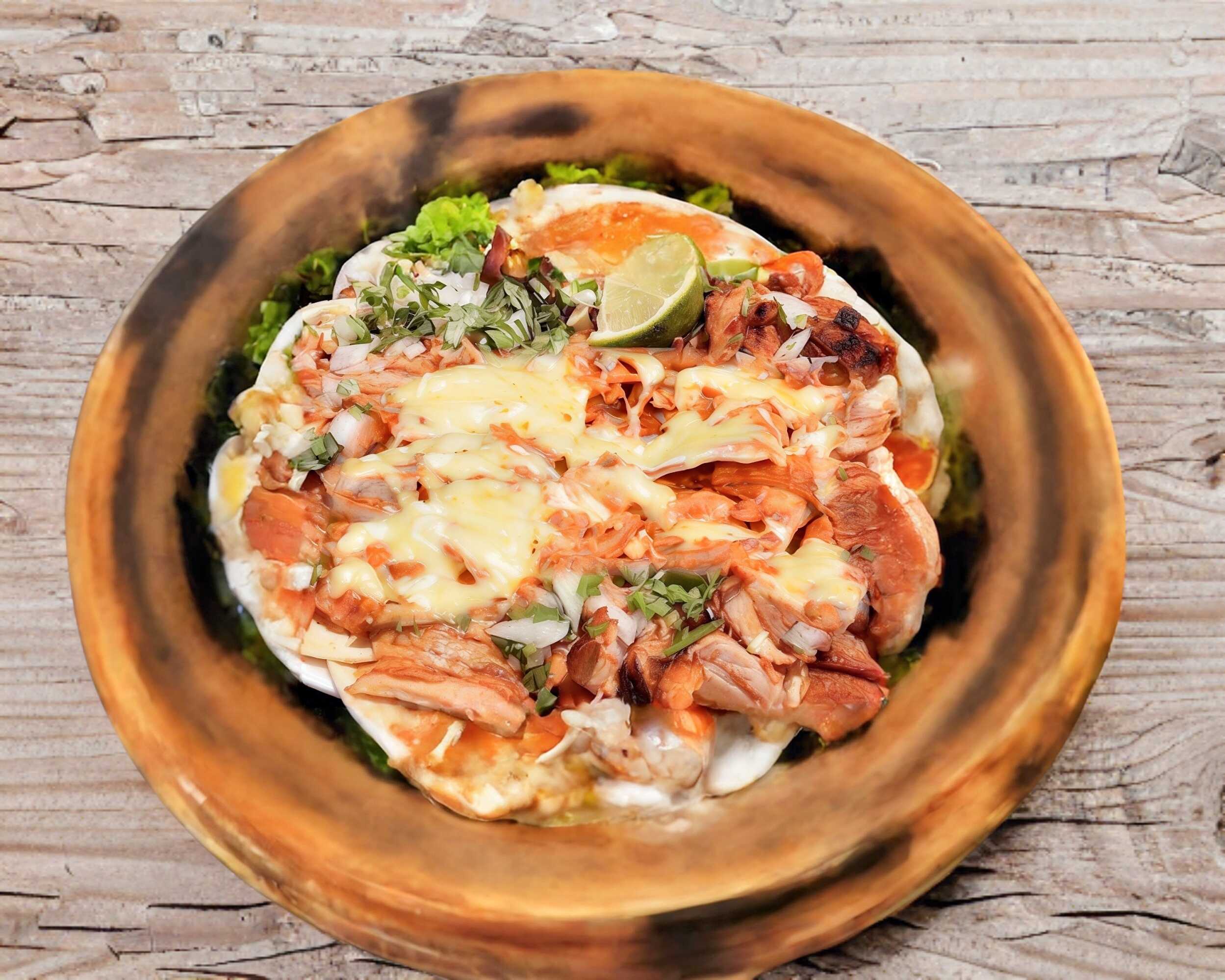 Carne al pastor, pimiento morrón, cebolla y queso Oaxaca.