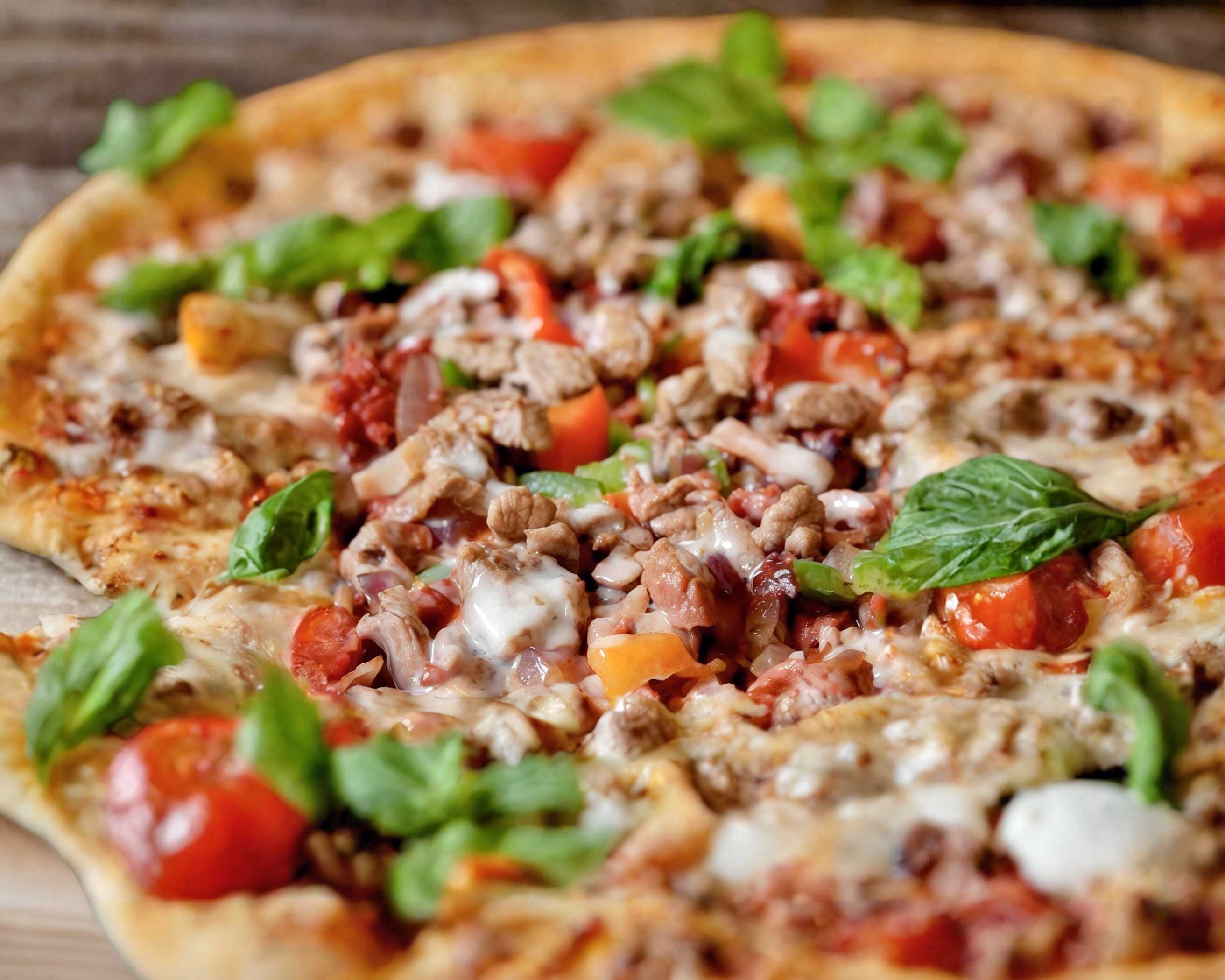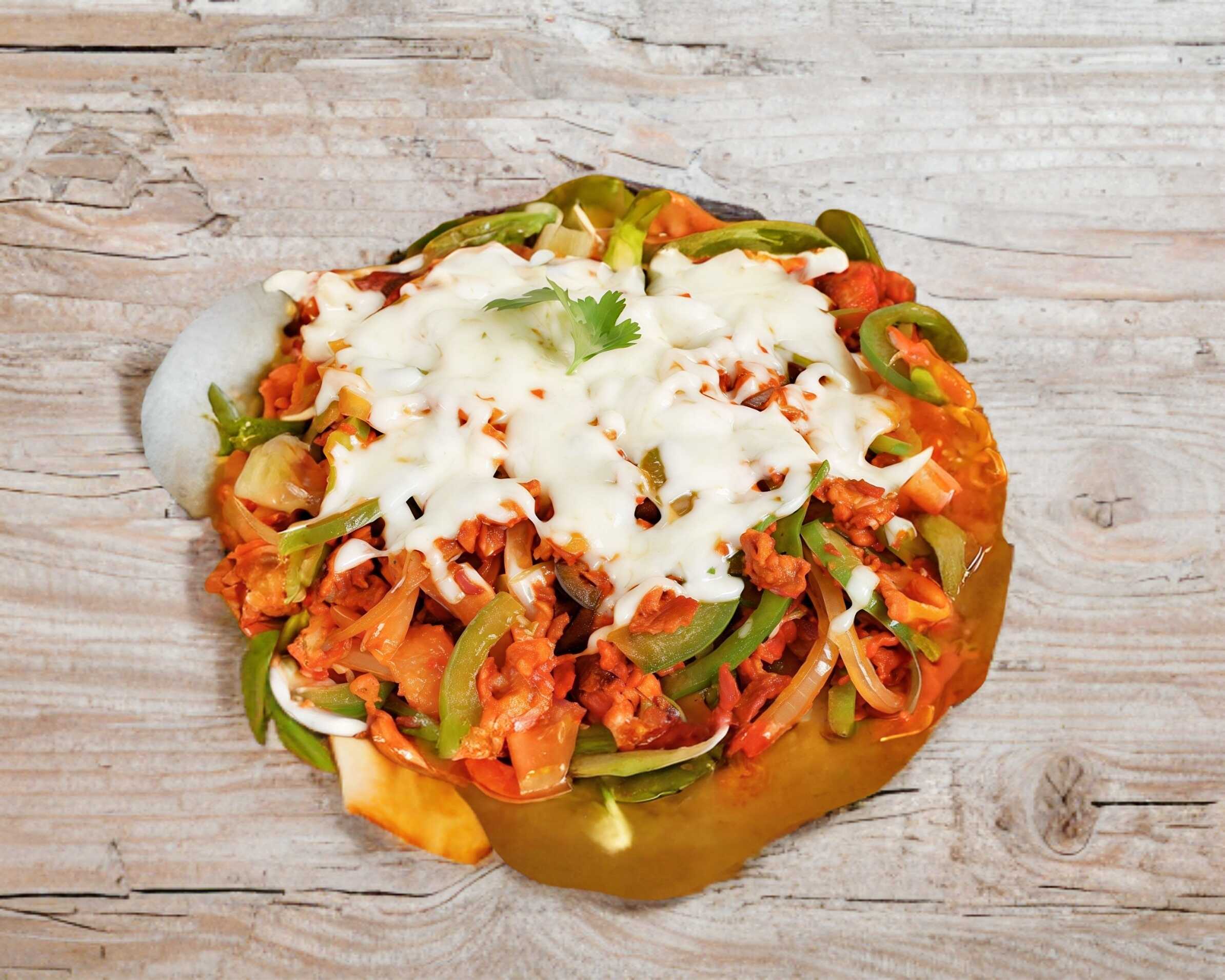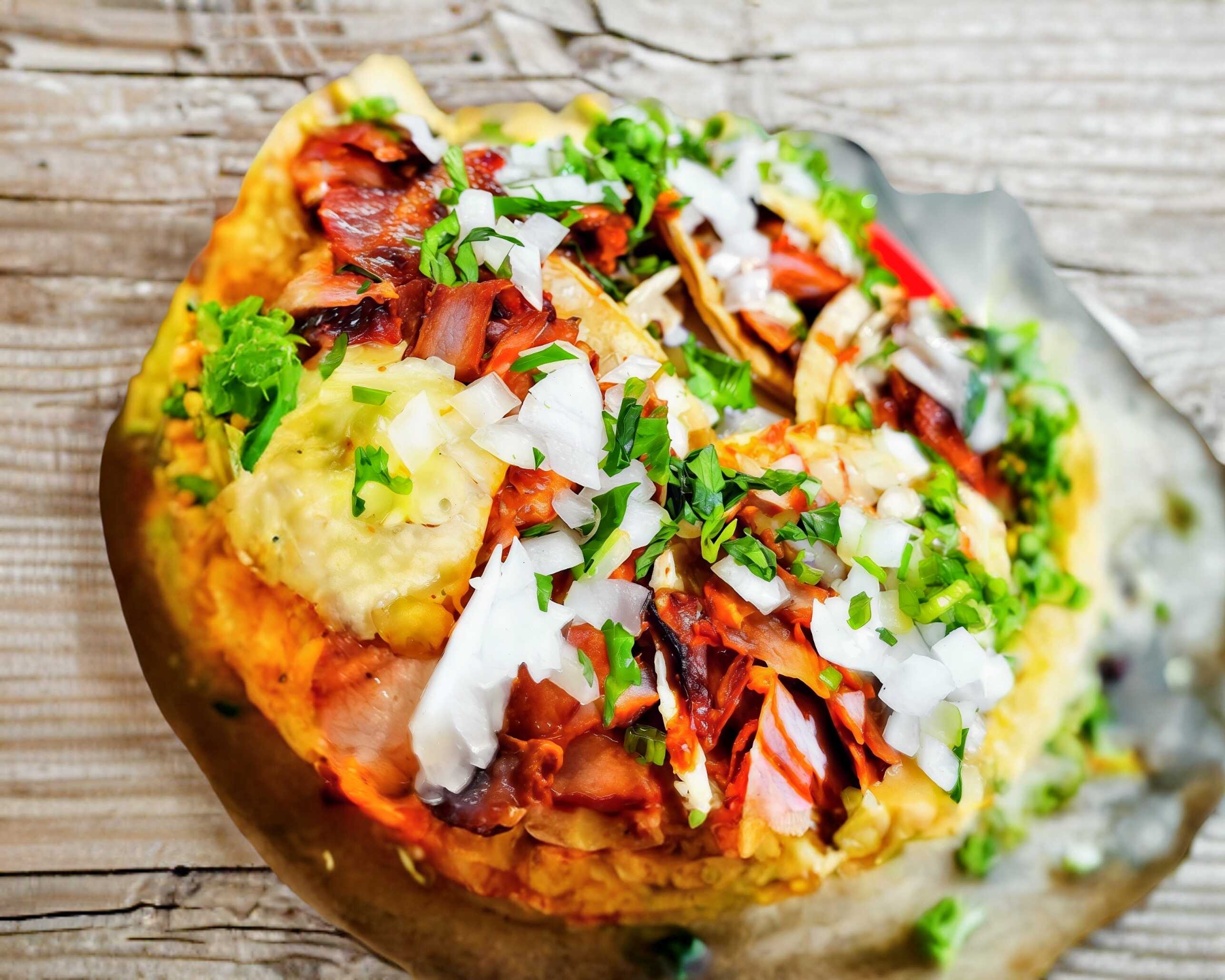 Carne al pastor, piña, pimiento morrón, cebolla y queso Oaxaca.