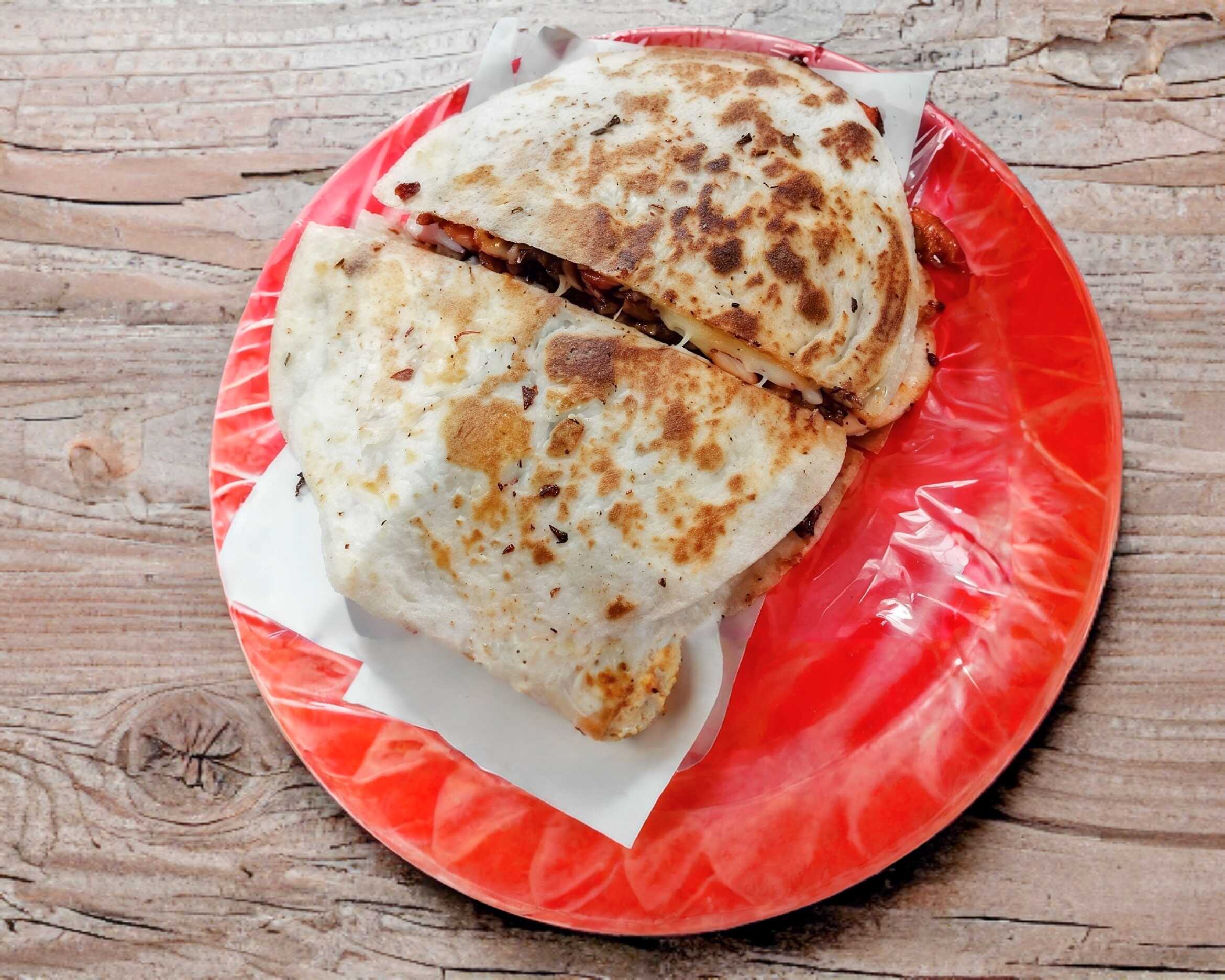 Bistec, pimiento morrón, cebolla y queso Oaxaca.