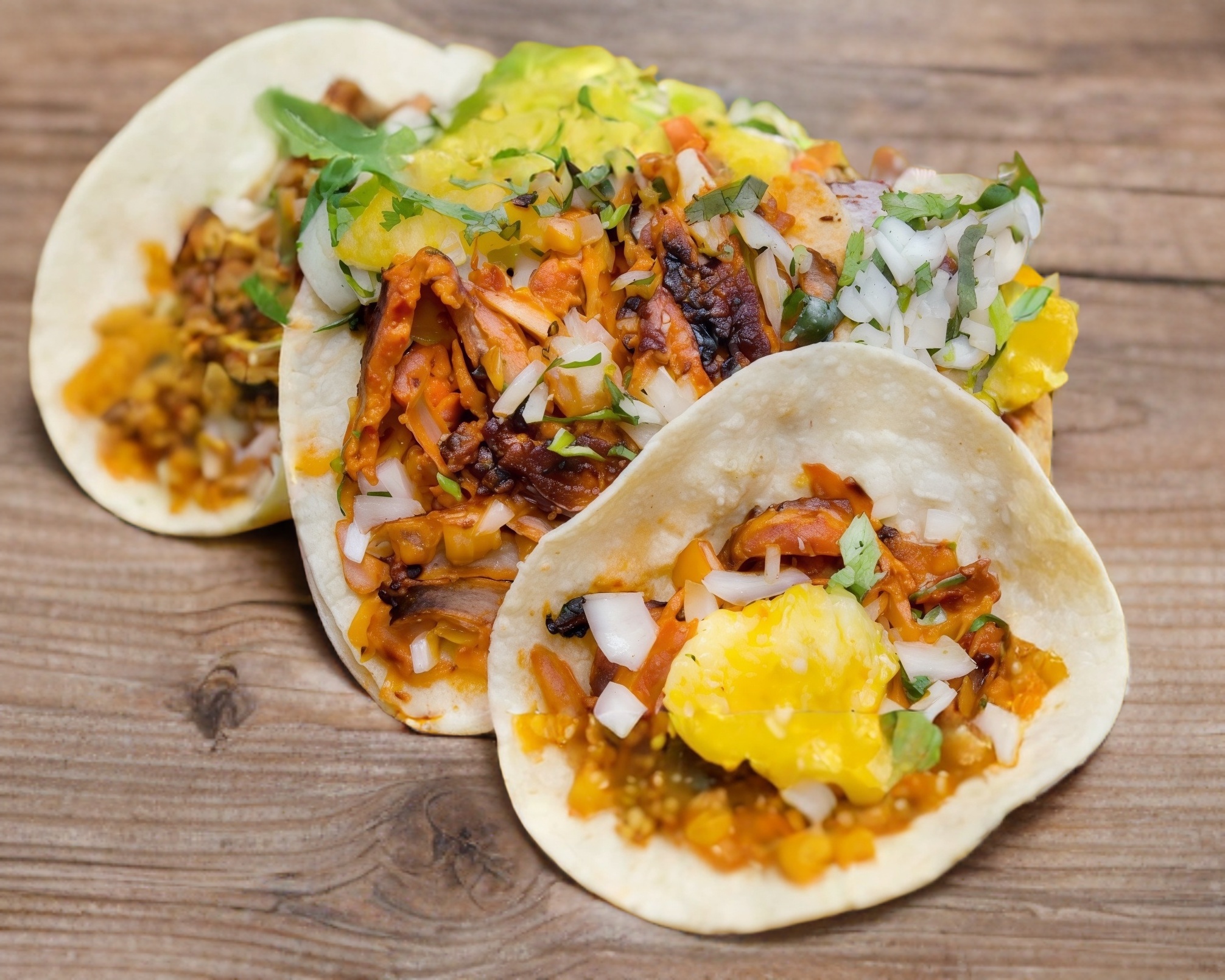 Orden de 3 tacos al pastor con queso Oaxaca.