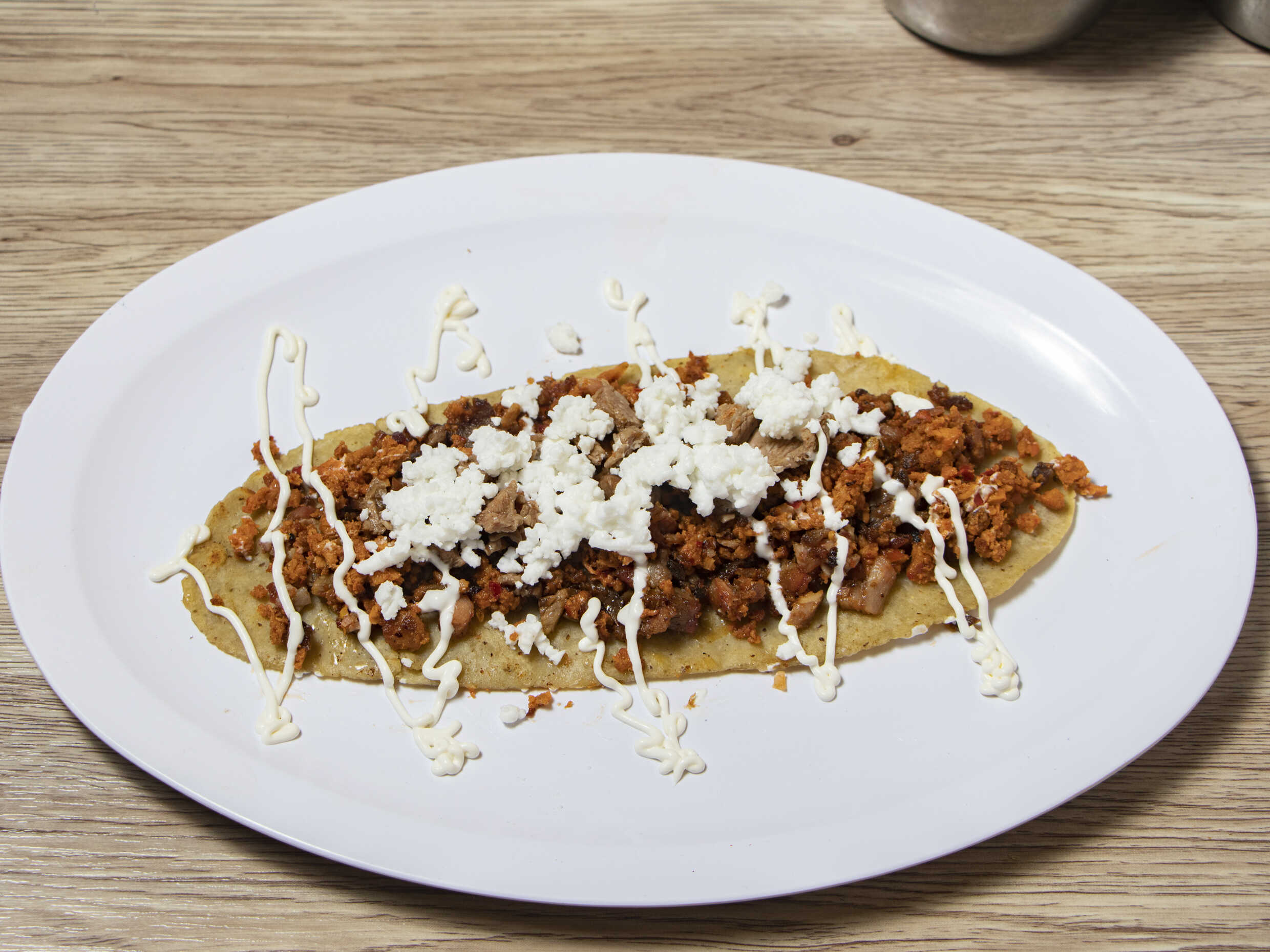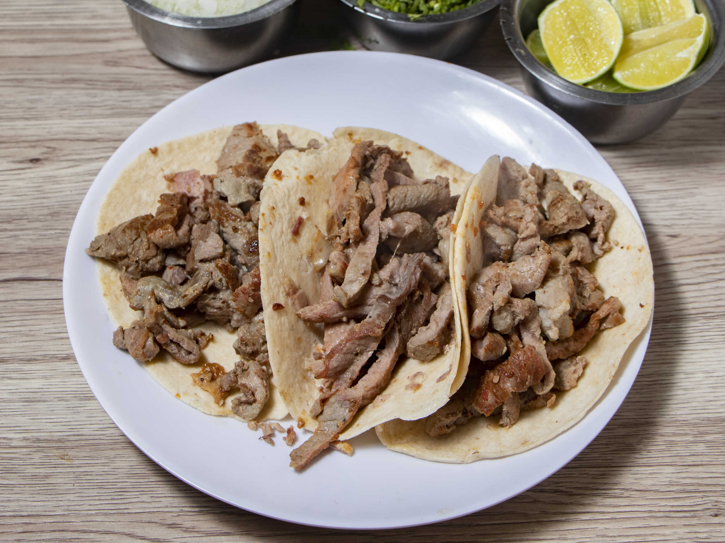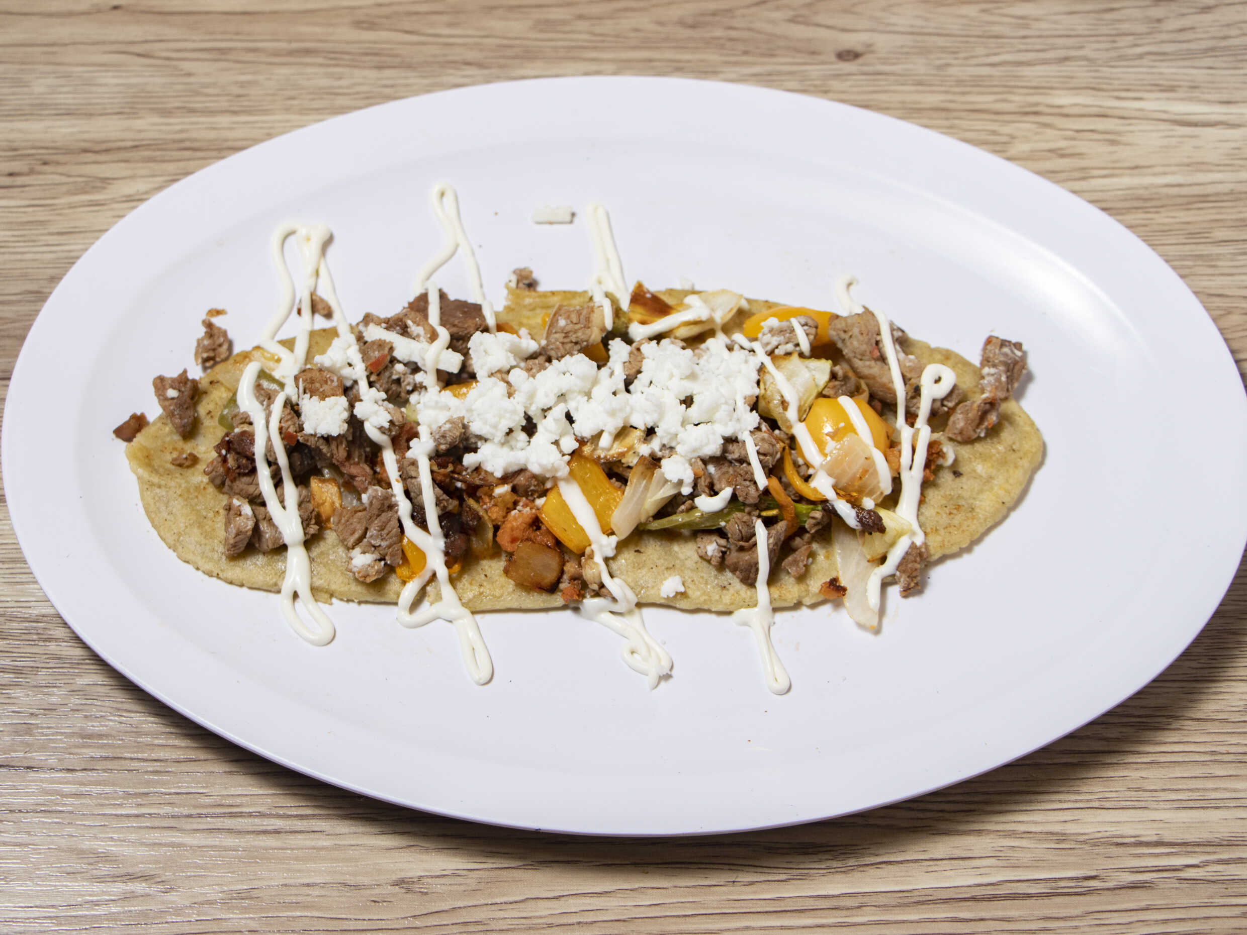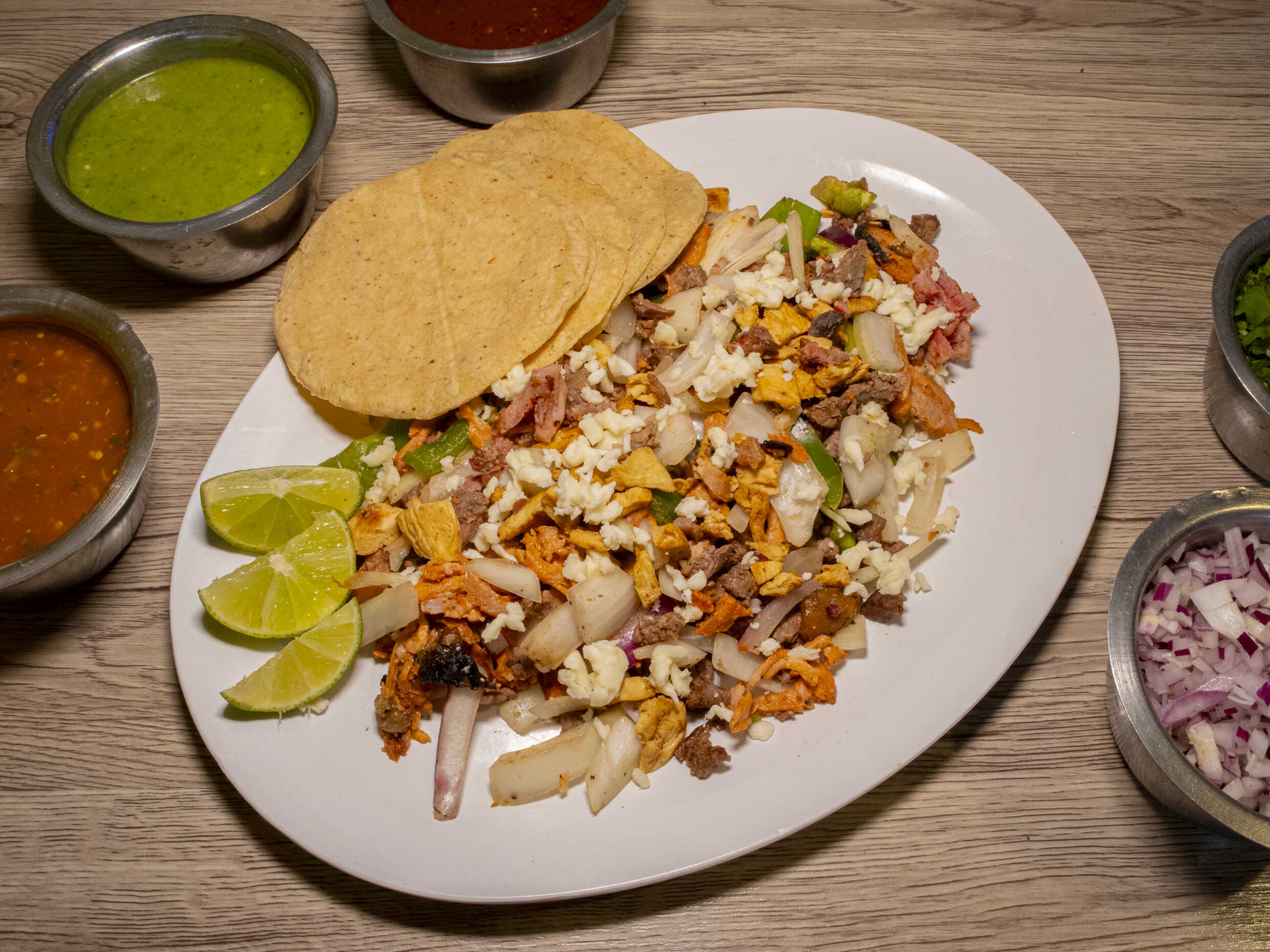 Pastor bistec, longaniza, jamón, tripa, Suadero, cebolla, pimiento morrón, queso y tortillas.