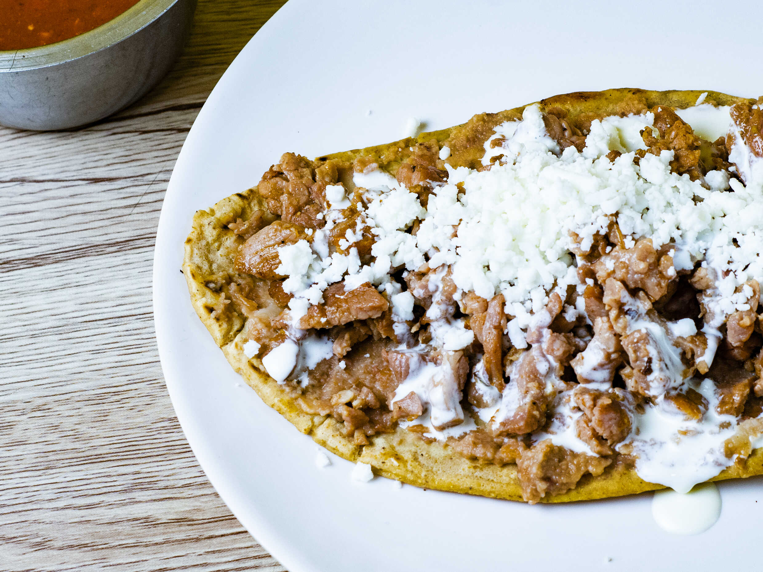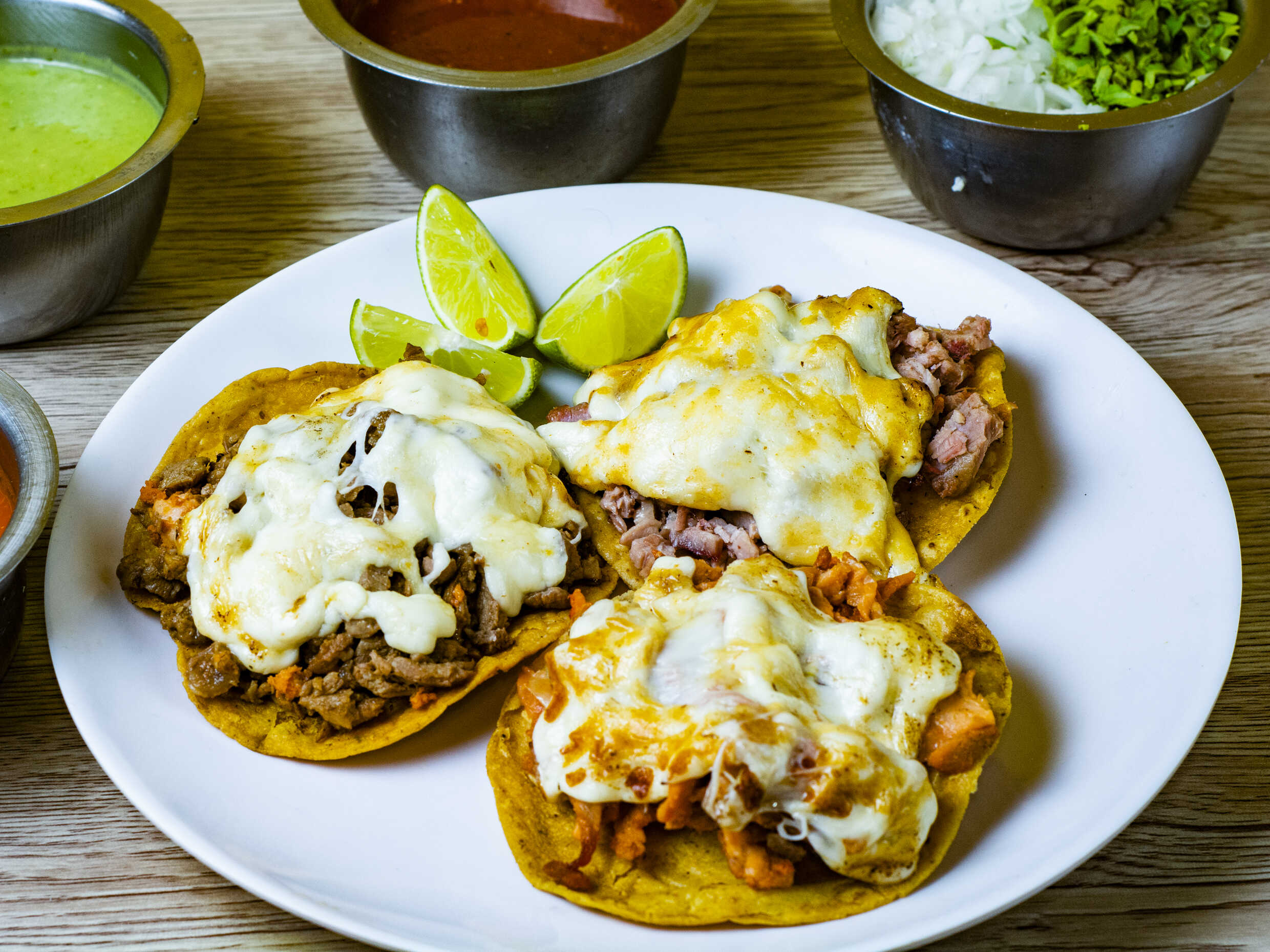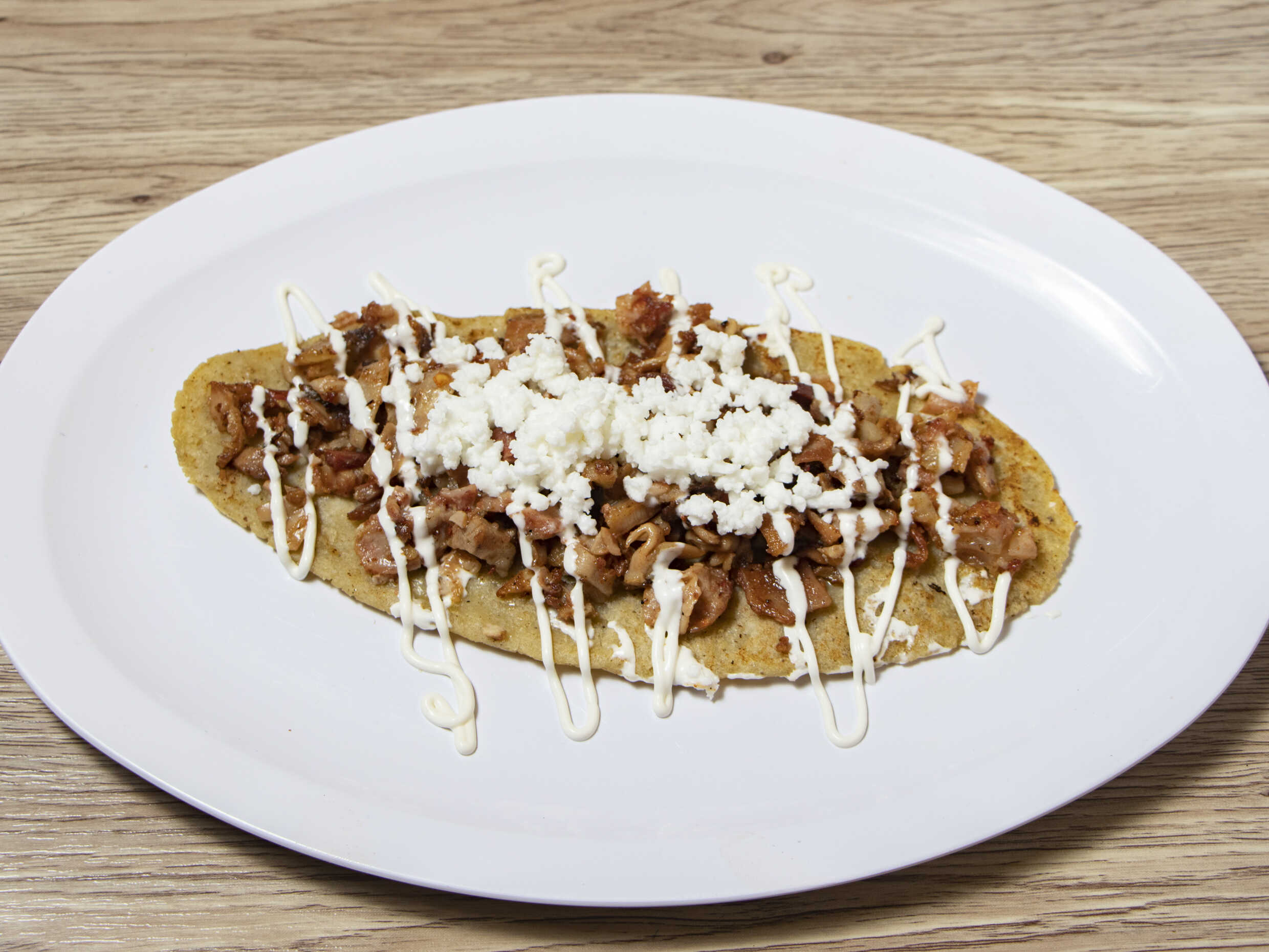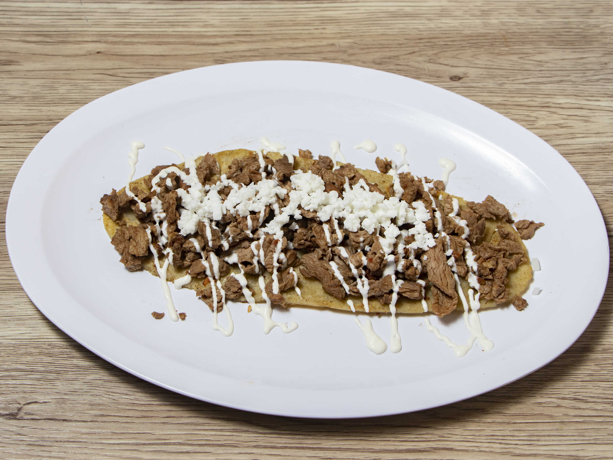 Pastor bistec, longaniza, jamón, tripa, Suadero, cebolla, pimiento morrón, queso y tortillas.