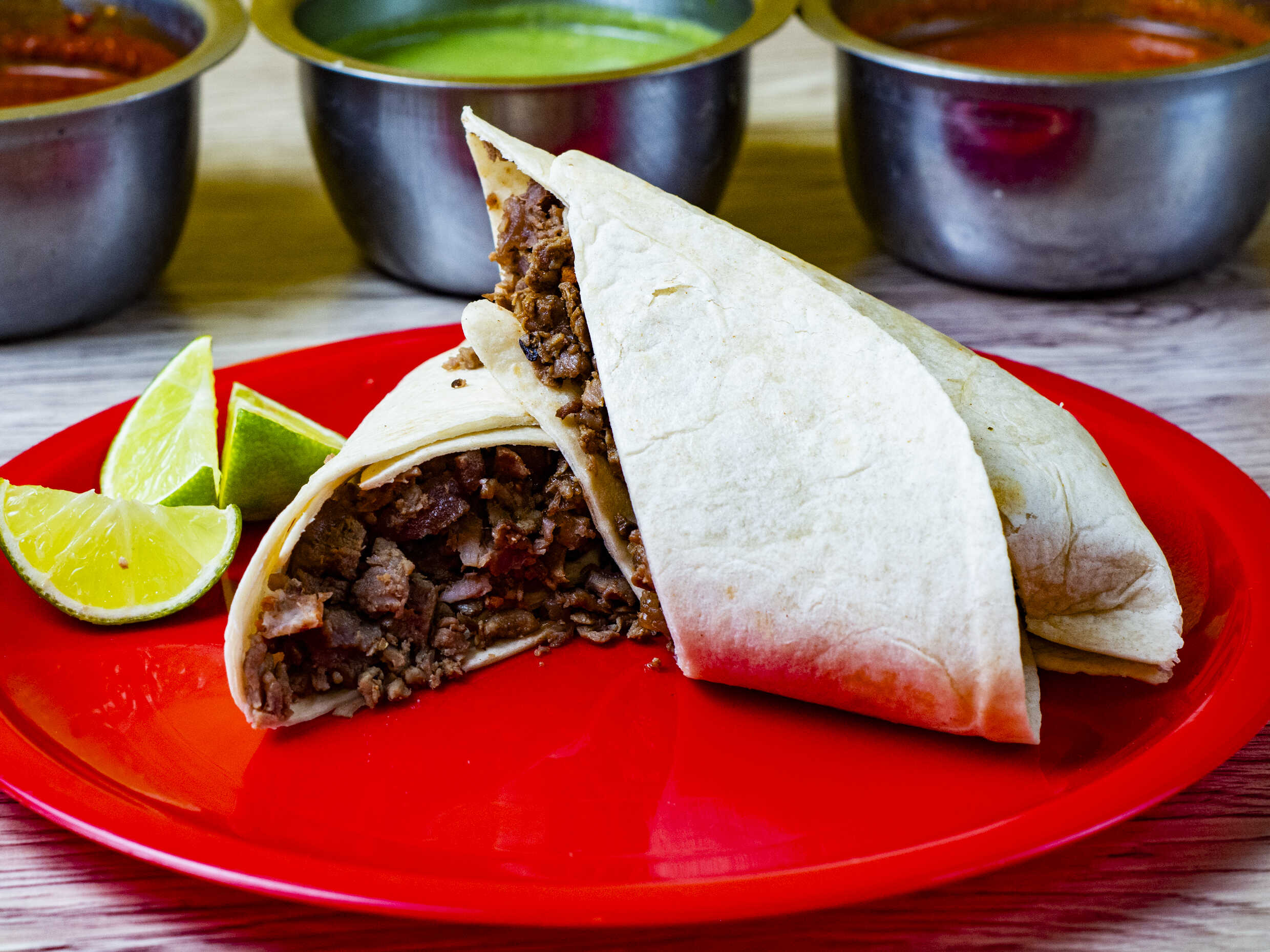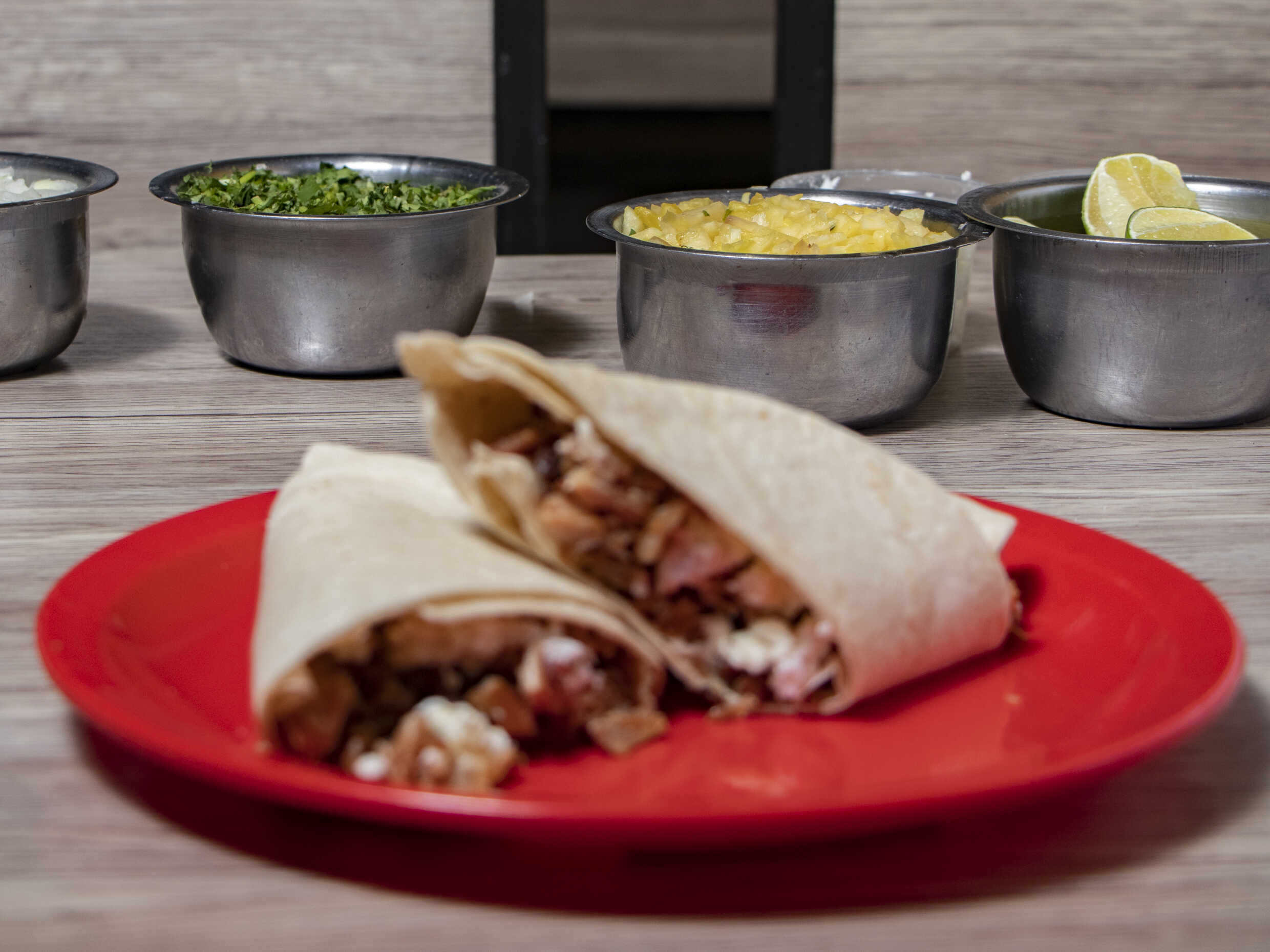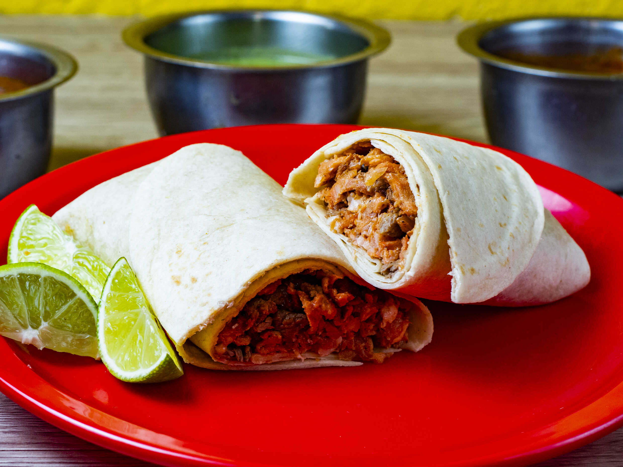 Burrito de Pastor, tortilla de harina, carne al pastor, salsa, limones, queso Oaxaca.