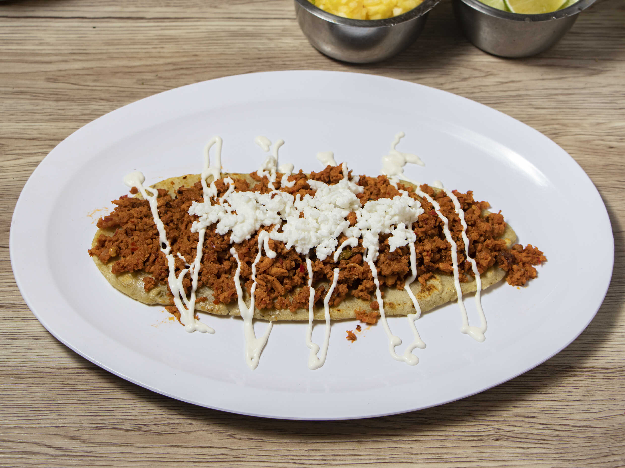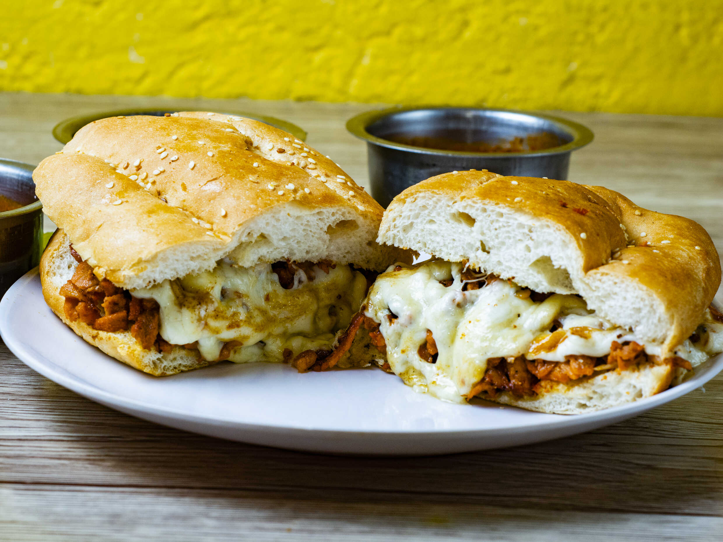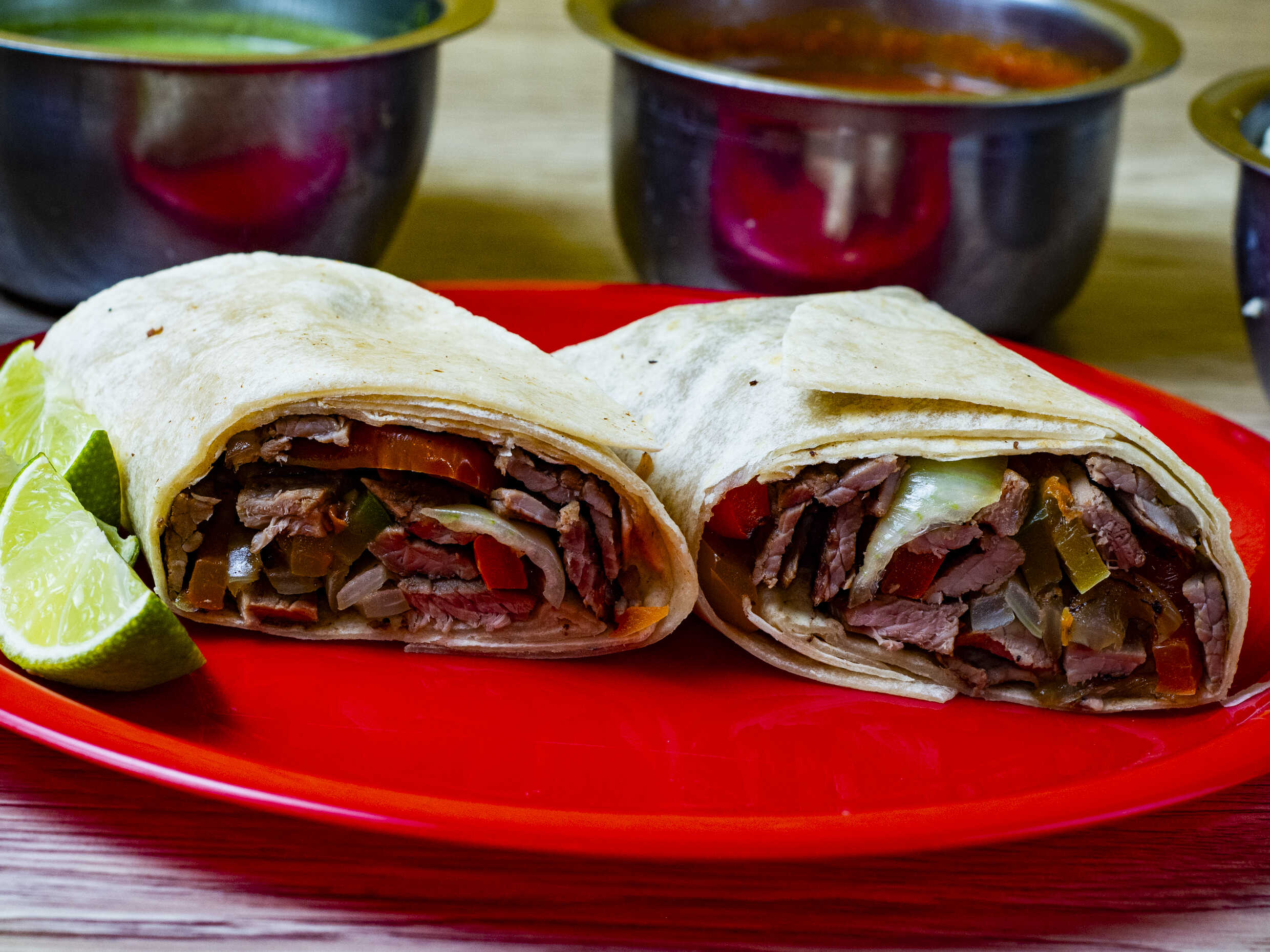 Burrito de Pastor, tortilla de harina, carne al pastor, salsa, limones, queso Oaxaca.