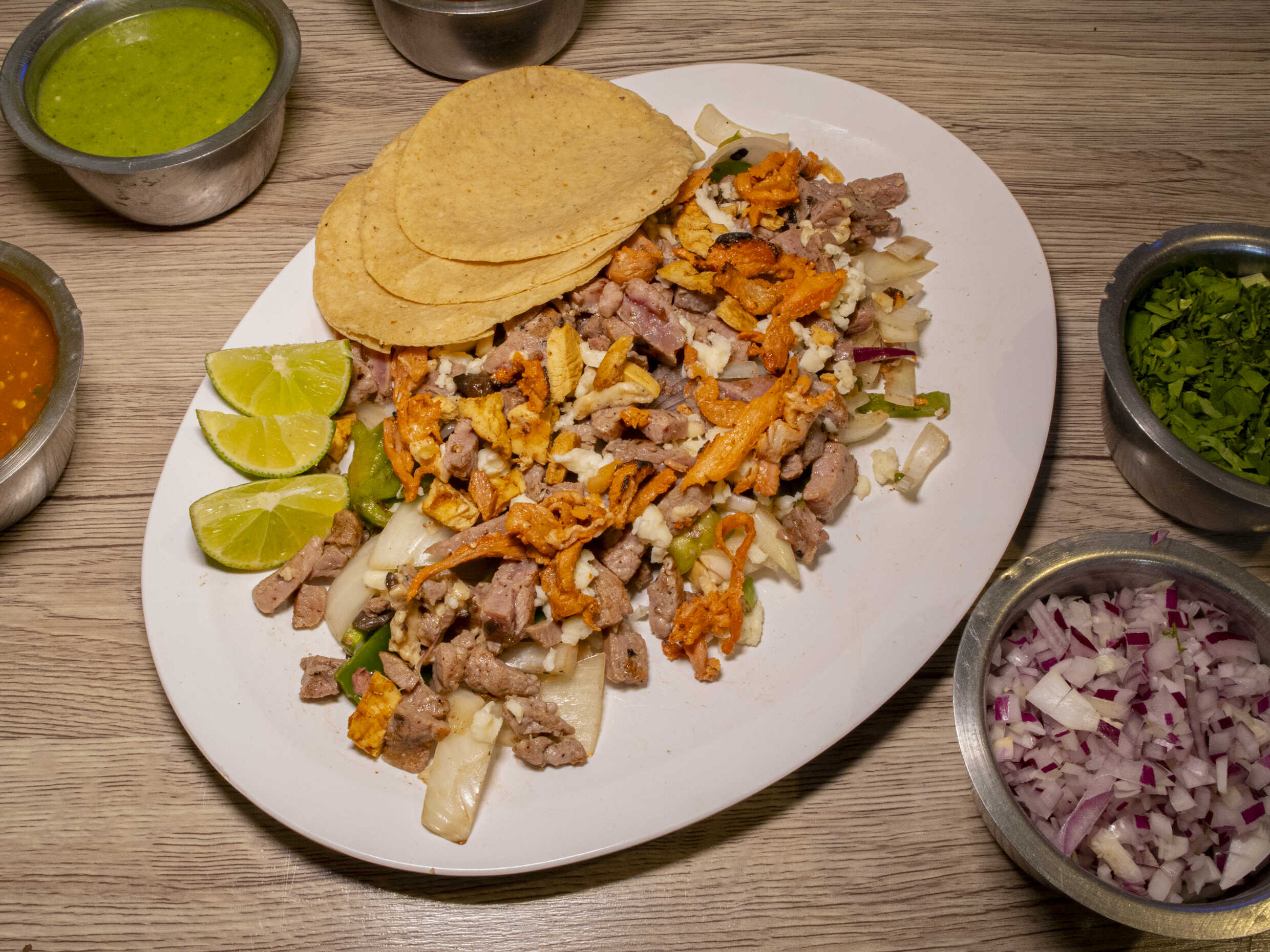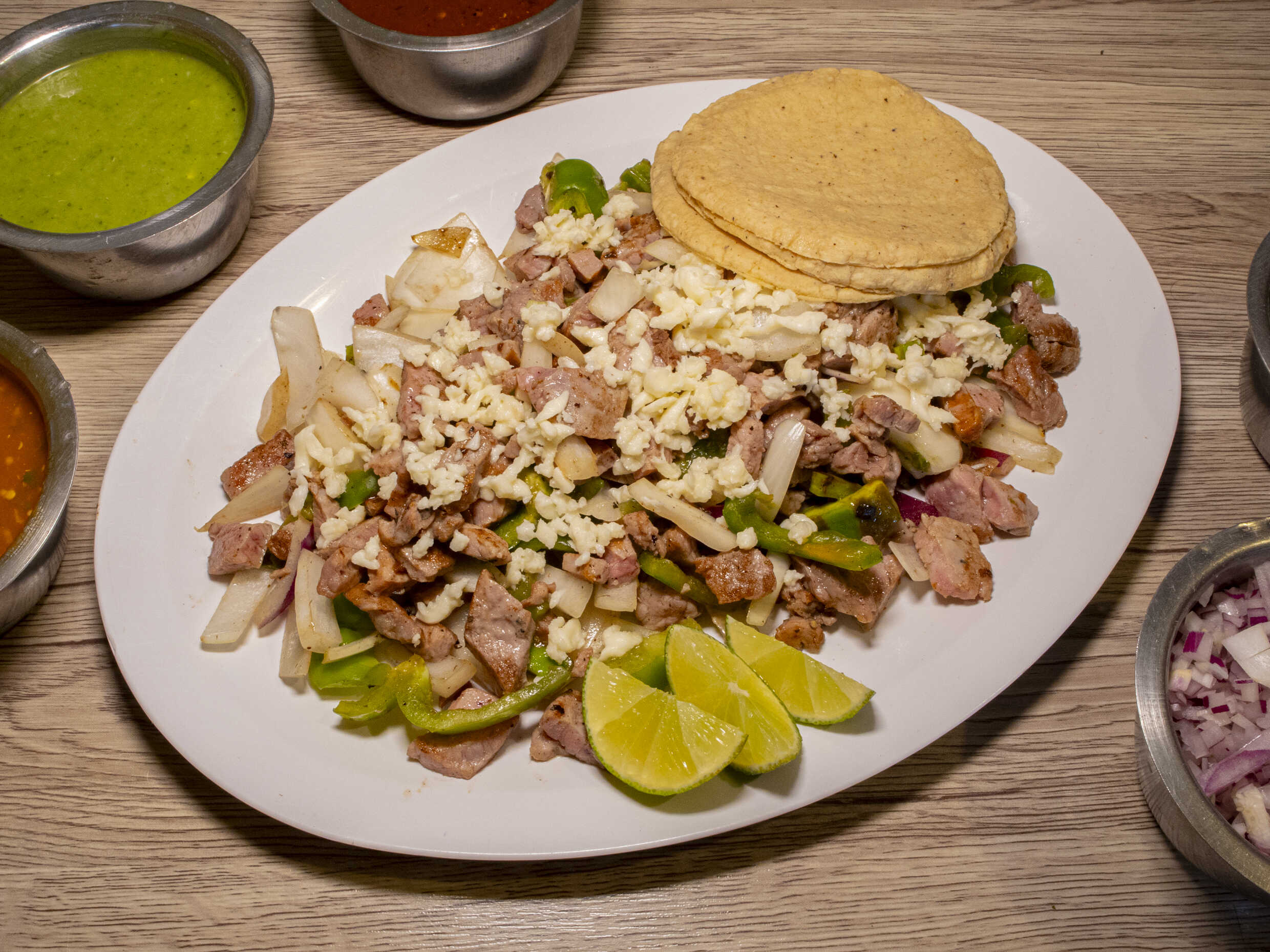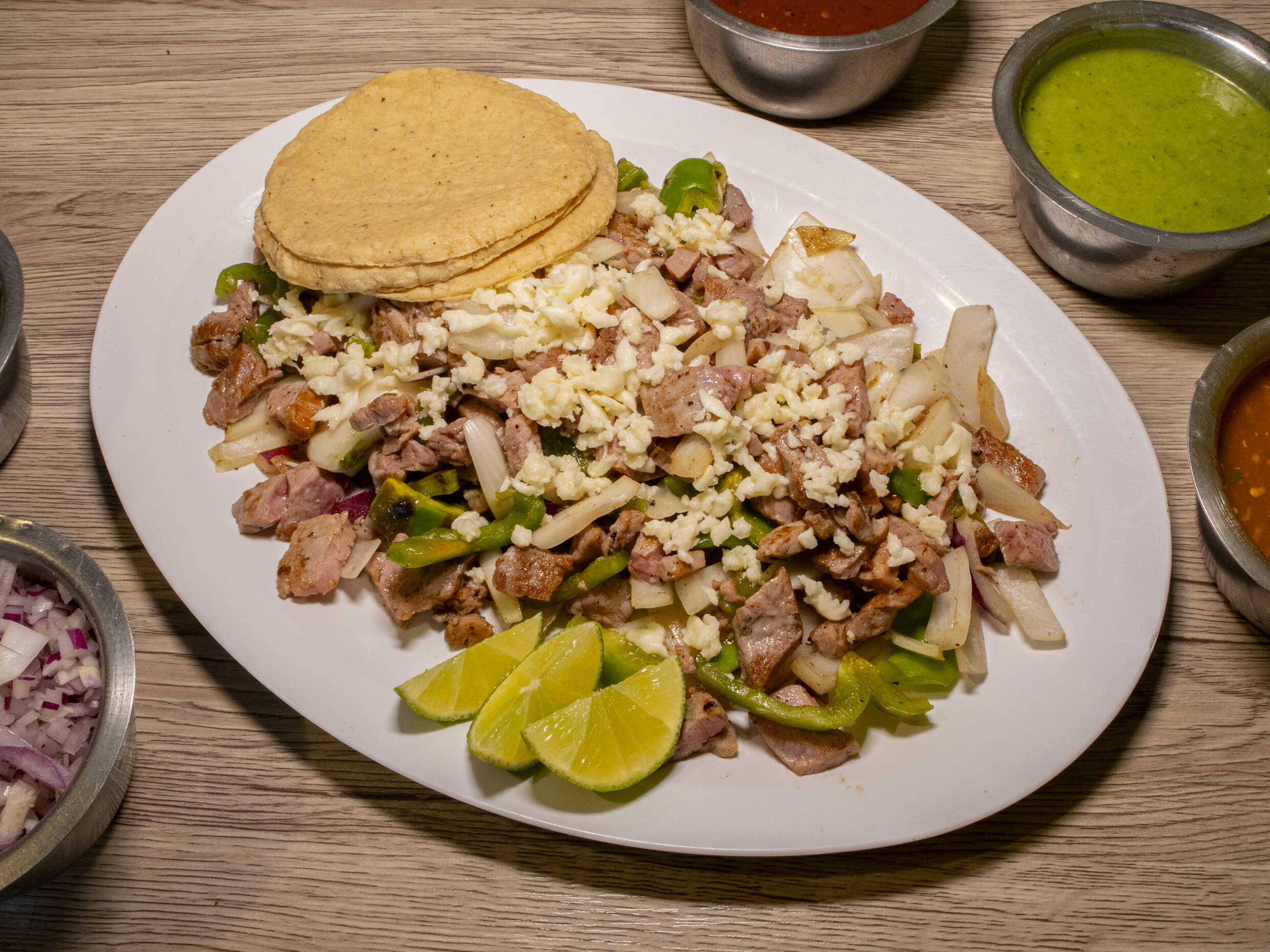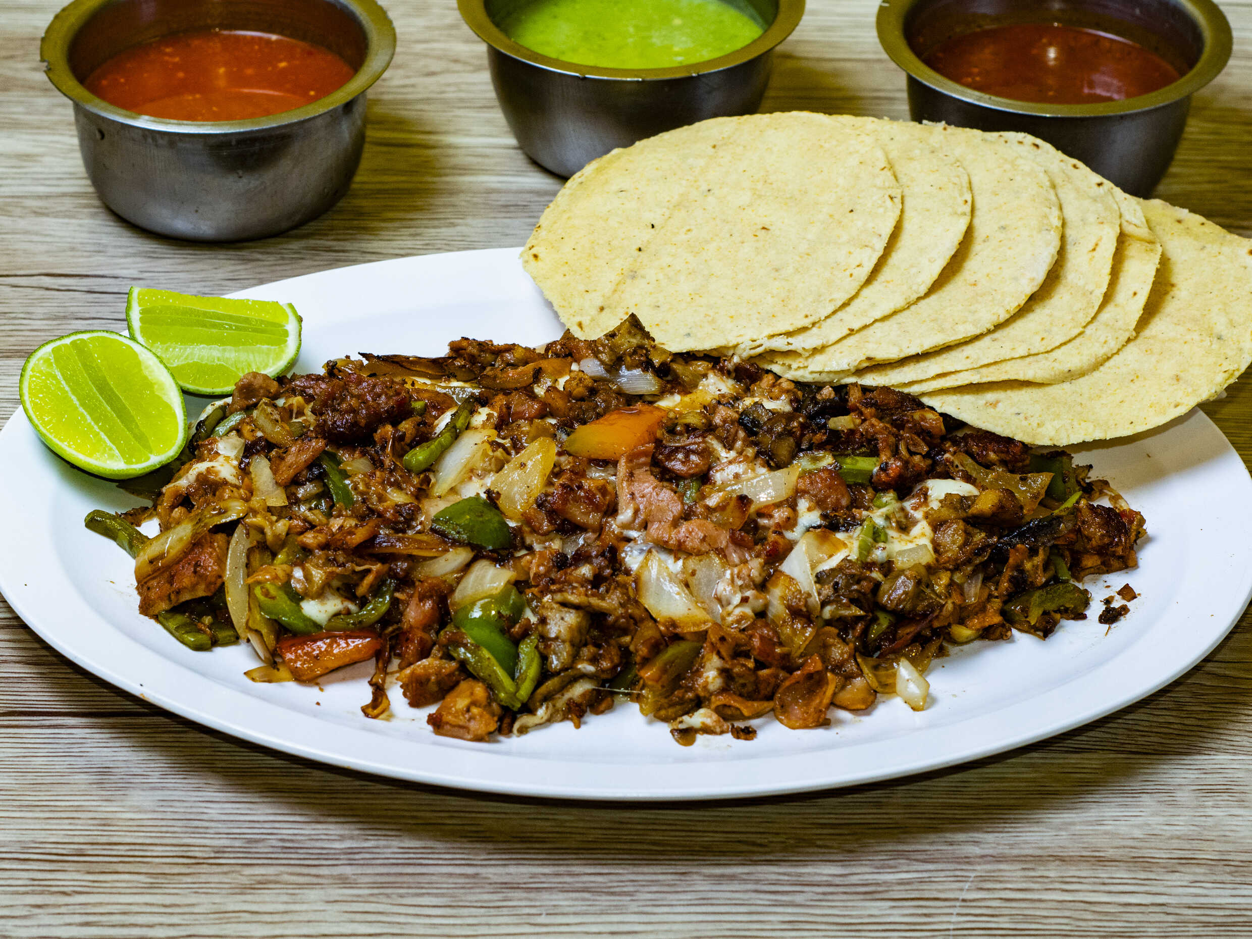 Incluye tortillas, verdura, salsa y limones.