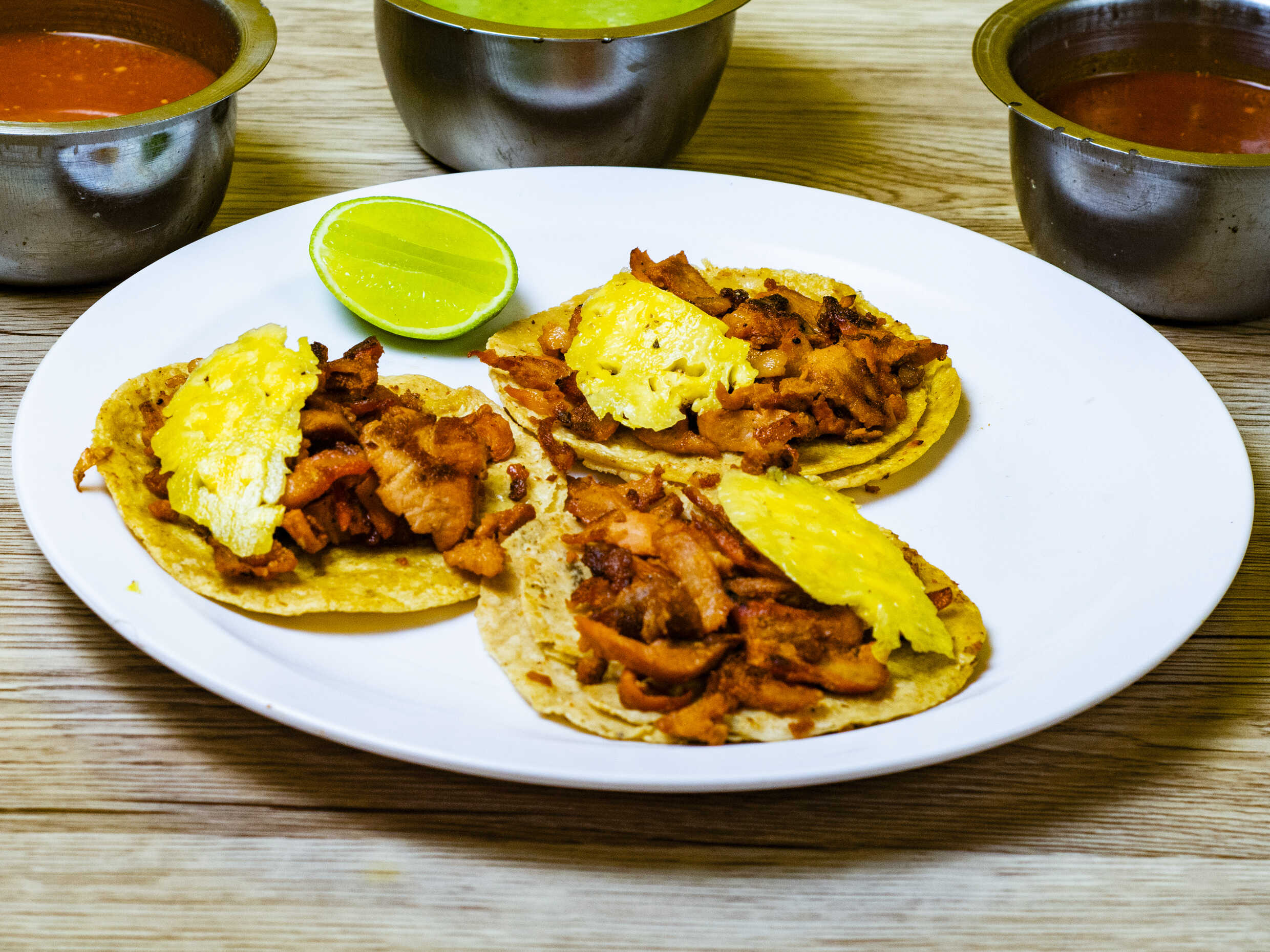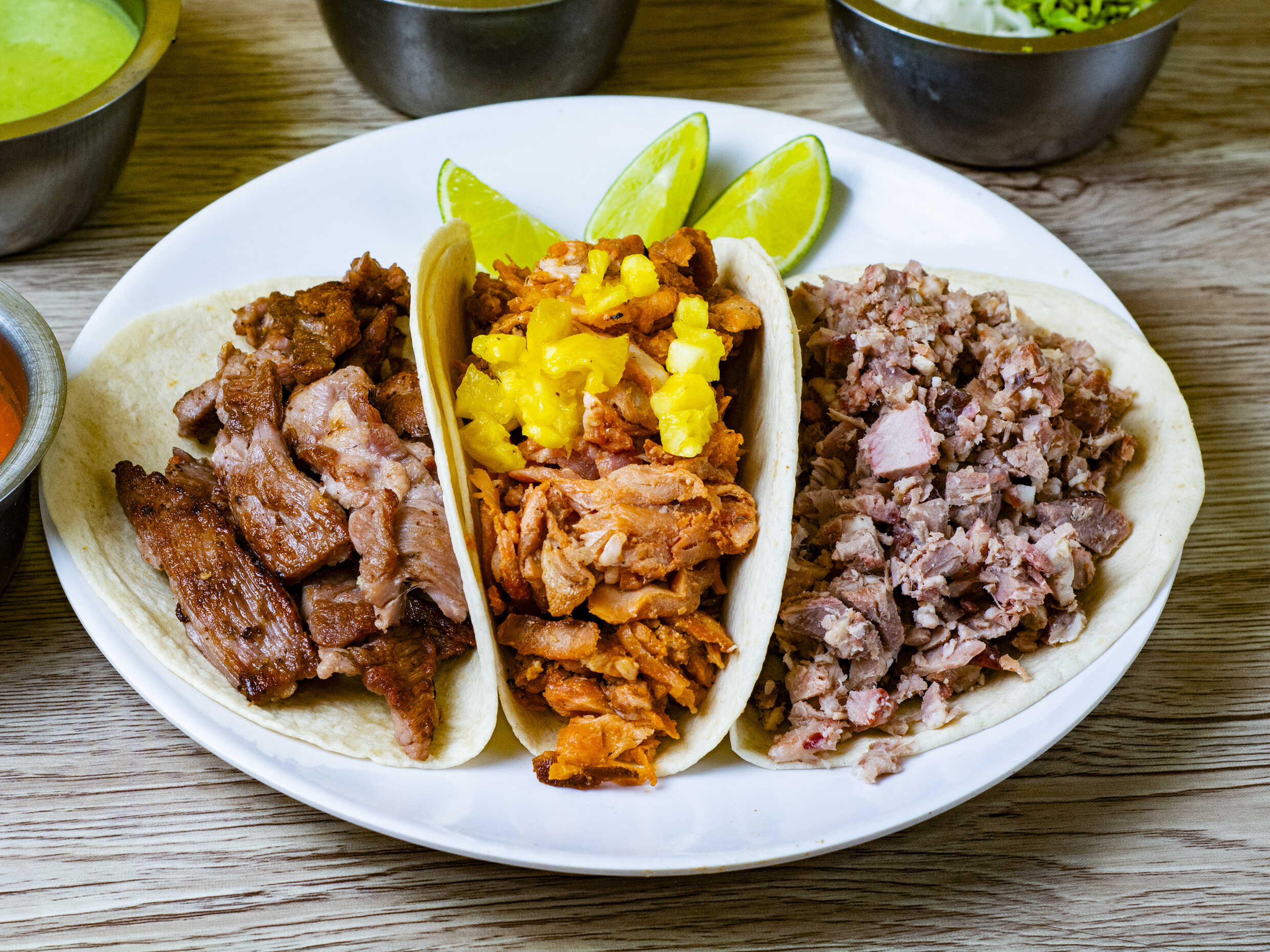 Pastor, queso, piña en tortillinas.