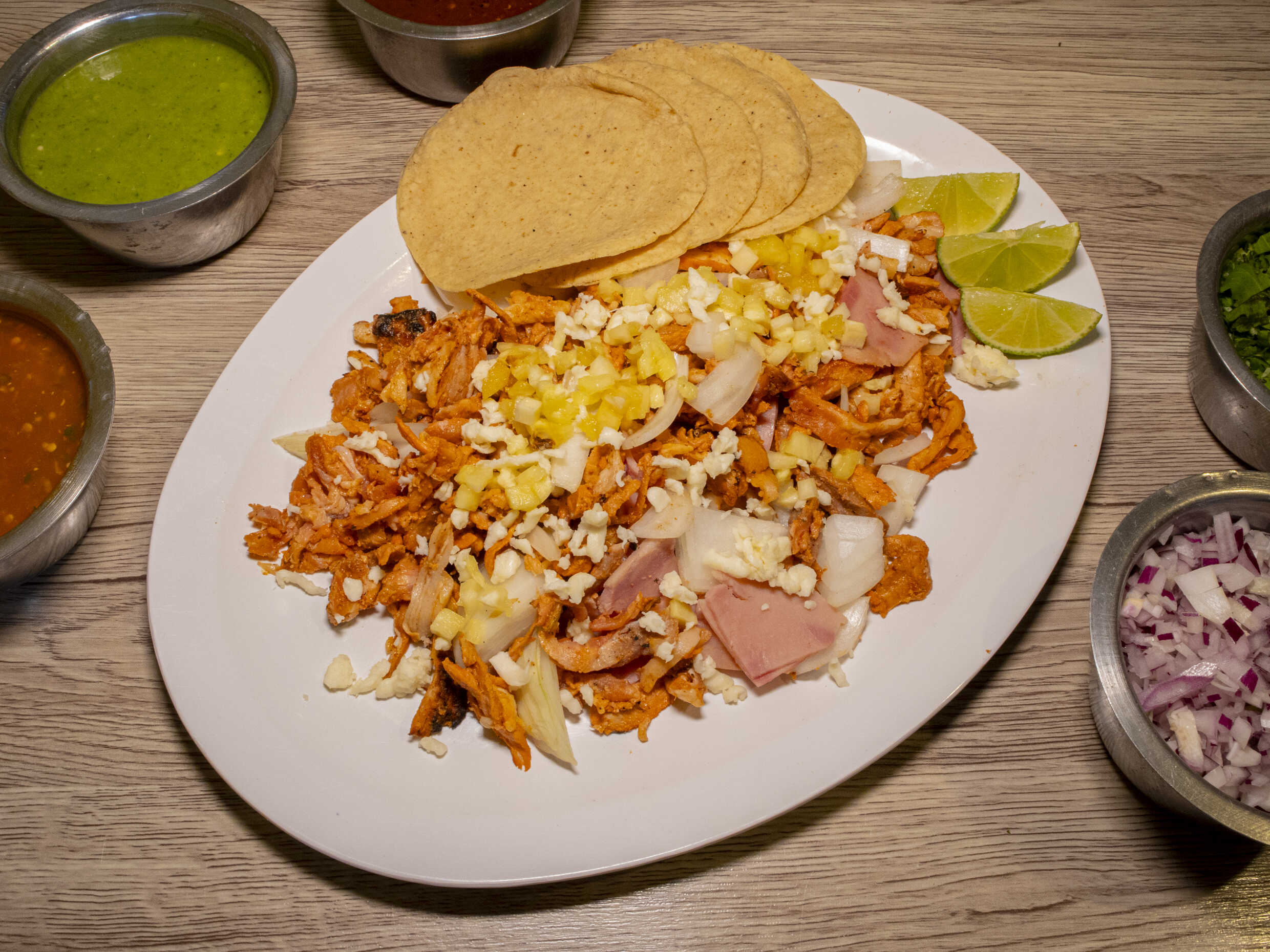 Pastor, jamón, piña, cebolla, queso y tortillas.