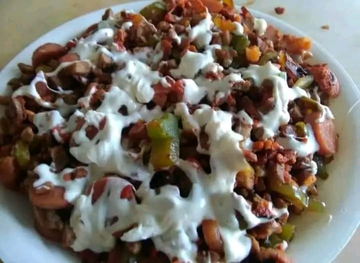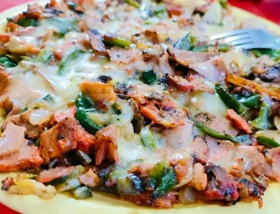 Chuleta, pastor, champiñones, cebolla, tocino y queso.